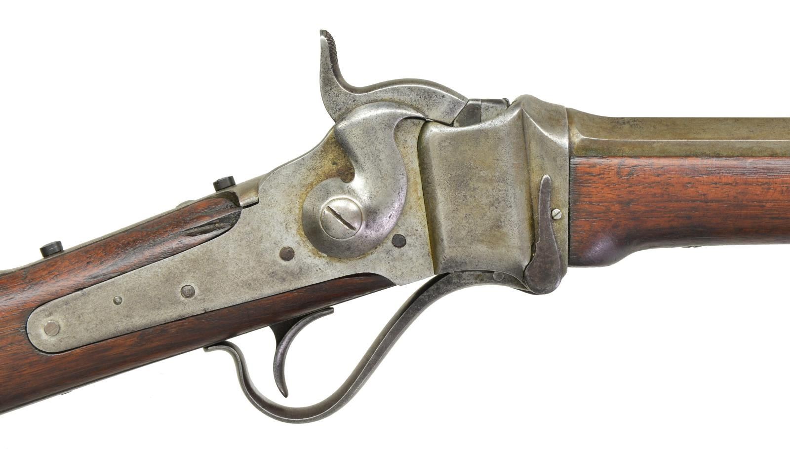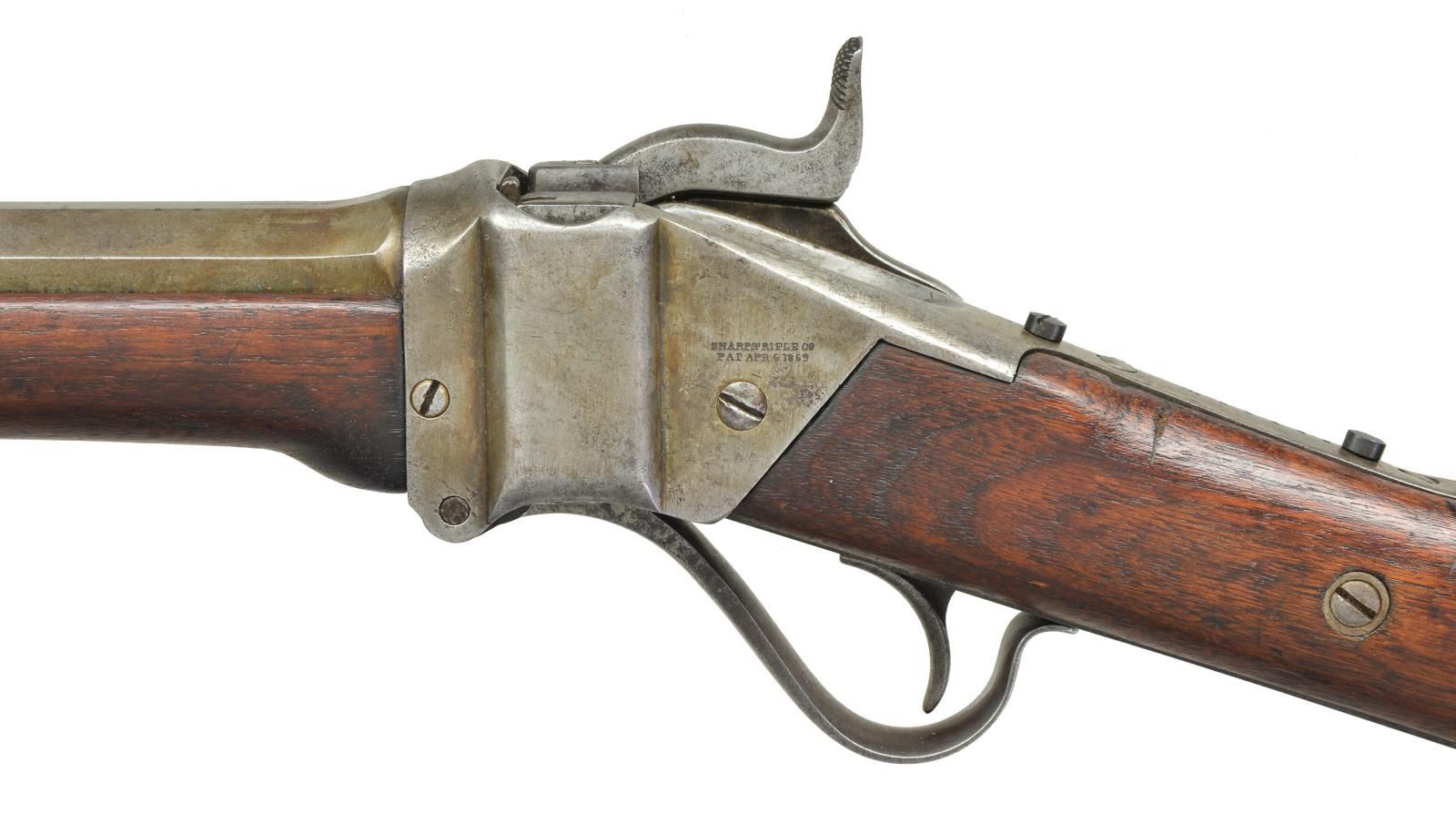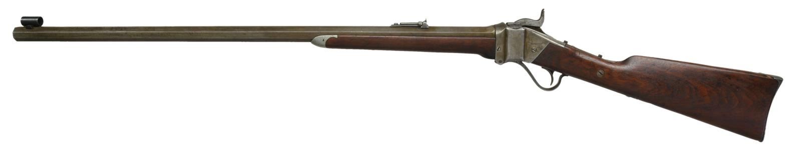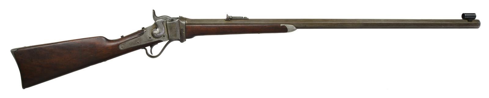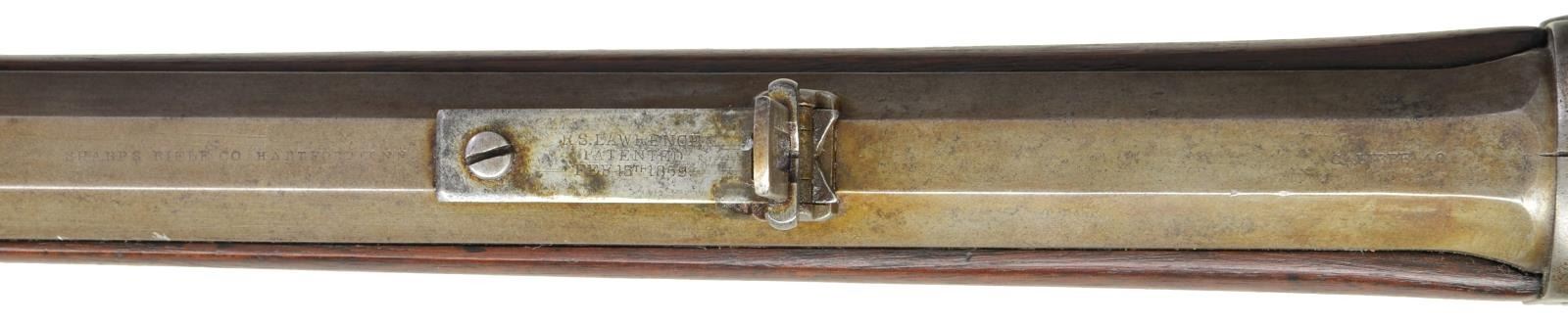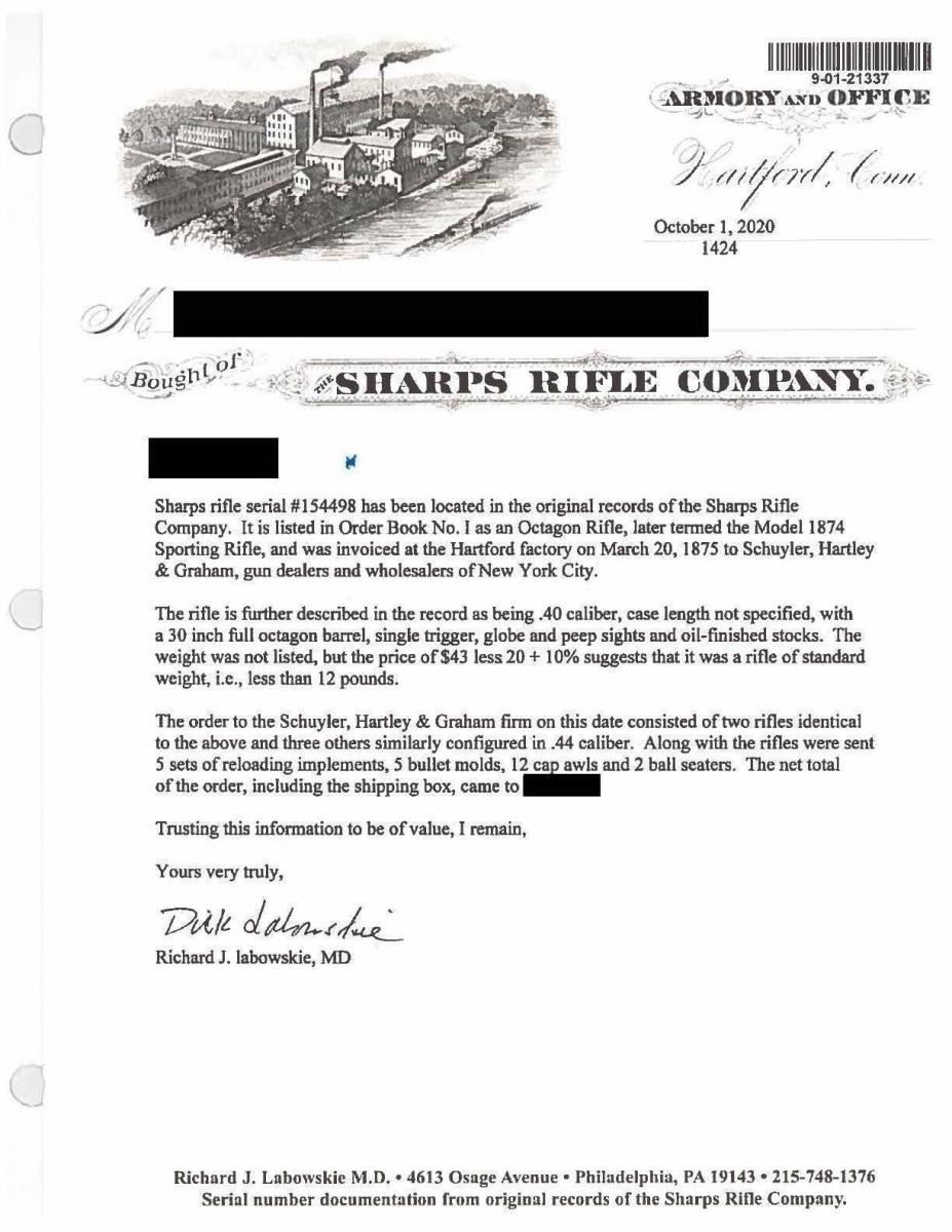Cal. 40 (40-70 Bottle Neck). S# C,54498. Bbl. 30" octagon measuring 7/8" across flats at muzzle. Top flat is marked "SHARP'S RIFLE CO. HARTFORD CONN." R.S. Lawrence Patent rear sight with modern globe front sight. Top tang has 2 modern screws in holes for Vernier sight attachment. Plain trigger. Left side of action is marked "SHARP'S RIFLE CO. / PAT. APR. 6, 1869". Lock plate is unmarked. Pewter tipped walnut forearm held by 2 screws. Straight grip walnut stock has carbine style steel buttplate. Weight: 9 lbs., 10.6 oz. UNATTACHED ACCESSORIES: letter from Dr. Richard J. Labowskie stating the following: "Sharps rifle serial #154498 has been located in the original records of the Sharps Rifle Company. It is listed in Order Book No. I as an Octagon Rifle, later termed the Model 1874 Sporting Rifle, and was invoiced at the Hartford factory on March 20, 1875 to Schuyler, Hartley & Graham, gun dealers and wholesalers of New York City. The rifle is further described in the record as being .40 caliber, case length not specified, with a 30 inch full octagon barrel, single trigger, globe and peep sights and oil-finished stocks. The weight was not listed, but the price of $43 less 20 + 10% suggests that it was a rifle of standard weight, i.e., less than 10 pounds. The order to the Schuyler, Hartley & Graham firm on this date consisted of two rifles identical to the above and three others similarly configured in .44 caliber. Along with the rifles were sent 5 sets of reloading implements, 5 bullet molds, 12 cap awls and 2 ball seaters. The net total of the order, including the shipping box, came to $192.55." CONDITION: metal finish has a gray coloration indicating possible touchup finish in the distant past. Sanded and undersized refinished wood has a dark worn appearance with dents and handling marks. Stock has chips around top tang and lock. Sound action. Dark bore retains strong rifling. (01-21337/DS). ANTIQUE. $4,000-6,000.