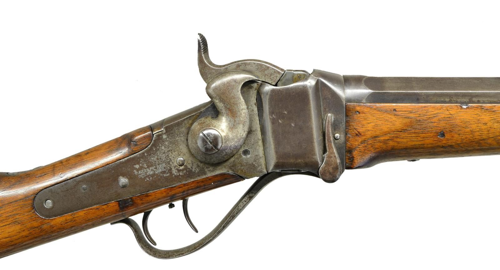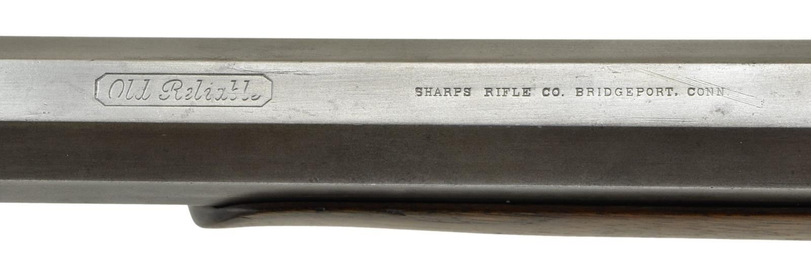 Cal. 40 2 1/2’’ straight. S# 99565. Bbl. 30’’ heavy octagon measuring 1’’ across flats at muzzle. Top flat is marked “Old Reliable” followed by 1 line Bridgeport address. Rocky mountain style German silver blade front sight w/ Lawrence patent graduated leaf rear sight. Conversion carbine action has 1848 date on left side. 1852 dated lock has been ground to model 1874 style. Cartridge conversion breech block & hammer. Double set triggers. Walnut forearm. Original straight grip stock w/ steel carbine buttplate. Post civil war Sharps conversions are often associated w/ Buffalo hunting in the American west. WEIGHT: 11 lbs, 5.8 ozs. CONDITION: metal has faded to light gray patina showing small dents & marks. Refinished forearm shows heavy wear w/ an added wood repair along right bbl. channel. Refinished stock has large crack extending from buttplate. Sound action & trigger. Bbl. has slightly darkened appearance & retains strong rifling. PROVENANCE: From the Lifelong Collection of Glen E. Mattox. (01-22519/DS). ANTIQUE. $3,000-5,000.