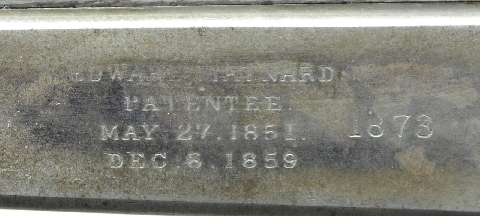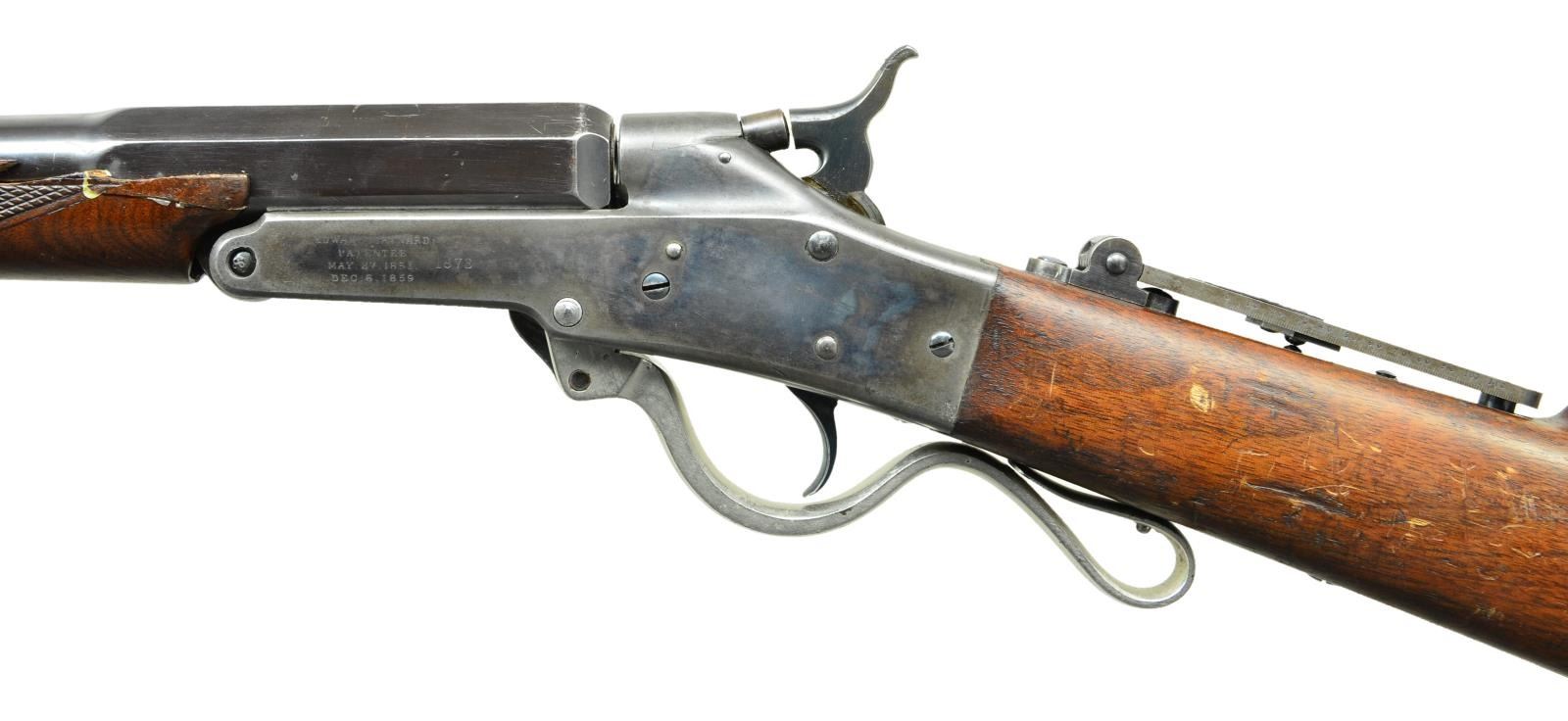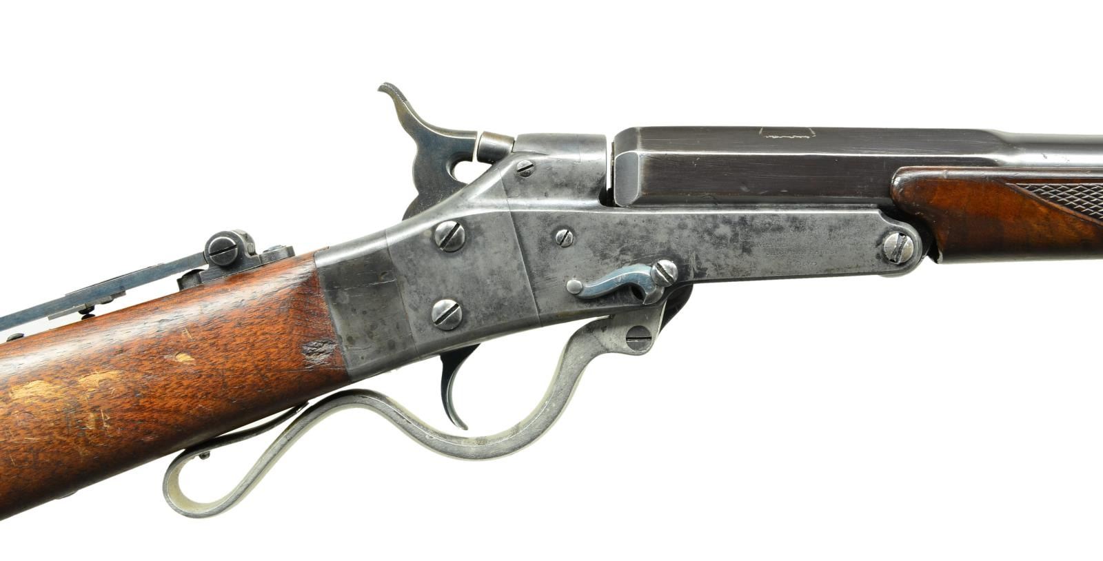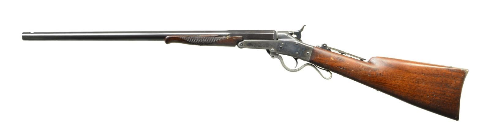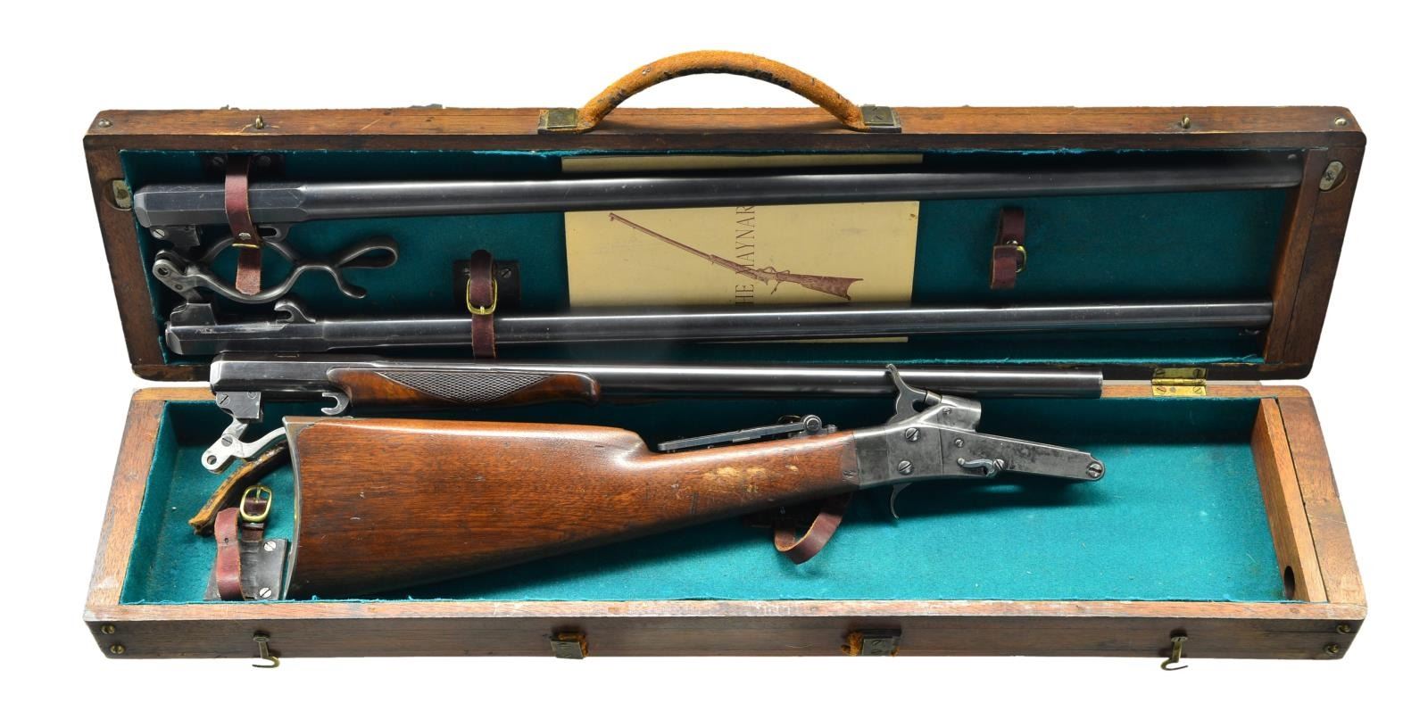 RIFLE. Cals. 32 CF & 28 Ga. S# 12345. Assembled three bbl. set. Case hardened action w/ center mounted hammer & firing pin. Tang mounted Vernier sight. Straight grip walnut stock w/ steel buttplate. Bbl. No. 1: Original bbl. numbered to gun. Cal. 32 Short CF. 26" round. Bead front sight w/ fixed V notch fear sight. Case colored lever. Bbl. No. 2: Non-matching S# 22304. Cal. 32 Long CF. 20 3/4” w/ checkered forearm. Front sight dovetail is open. Rear sight dovetail is filled w/ a blank. Nickel finished lever. Bbl. No. 3: Renumbered to match gun, original number was 21718. Cal. 28 Ga opened to 2 3/4”. 26” w/ small semicircular front sight. Case colored lever. Large but unknown quantities mfg. 1860s-1890. UNATTACHED ACCESSORIES: shooter made wooden box w/ green cloth fitted interior having straps to secure rifle & bbls. 1 leather handle is detached. Case contains a catalogue titled “THE MAYNARD” describing Maynard rifle styles. First page shows a Holyoke, MASS printer’s address w/ original date of 1880. CONDITION: very fine. Receiver retains over 60% lightly faded case colors. Stock has worn finish w/ scratches & marks. Bbl. no. 1 has over 90% original blue showing small scratches & marks. Rifling is lightly worn. Bbl. no. 2 has a glued chip along left side of forearm & retains 95% reblued finish, bore retains sound rifling. Bbl. no. 3 has over 90% provisional blue showing small spots of corrosion. Bore is generally bright showing some very light pitting. (01-22989/DS). ANTIQUE. $2,750-3,750.