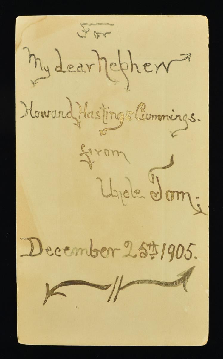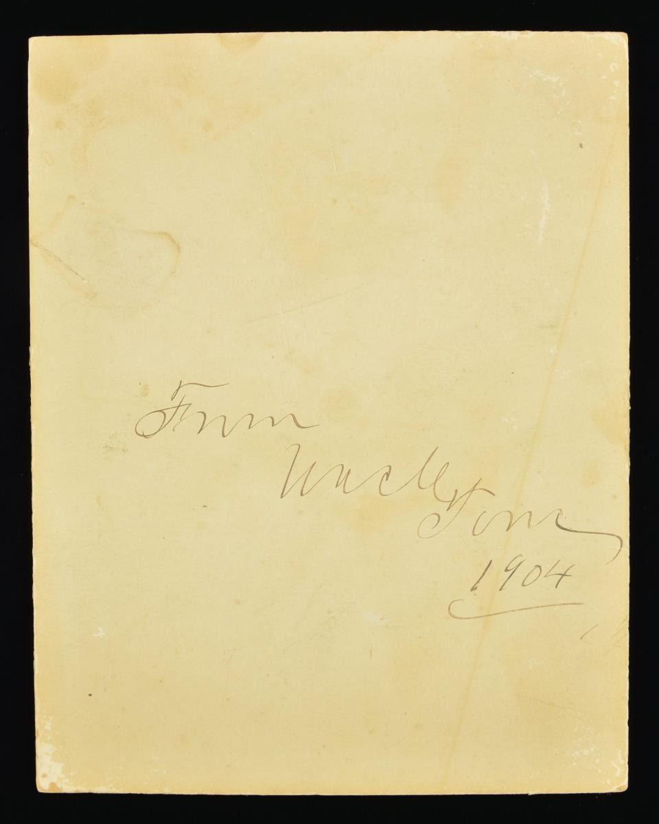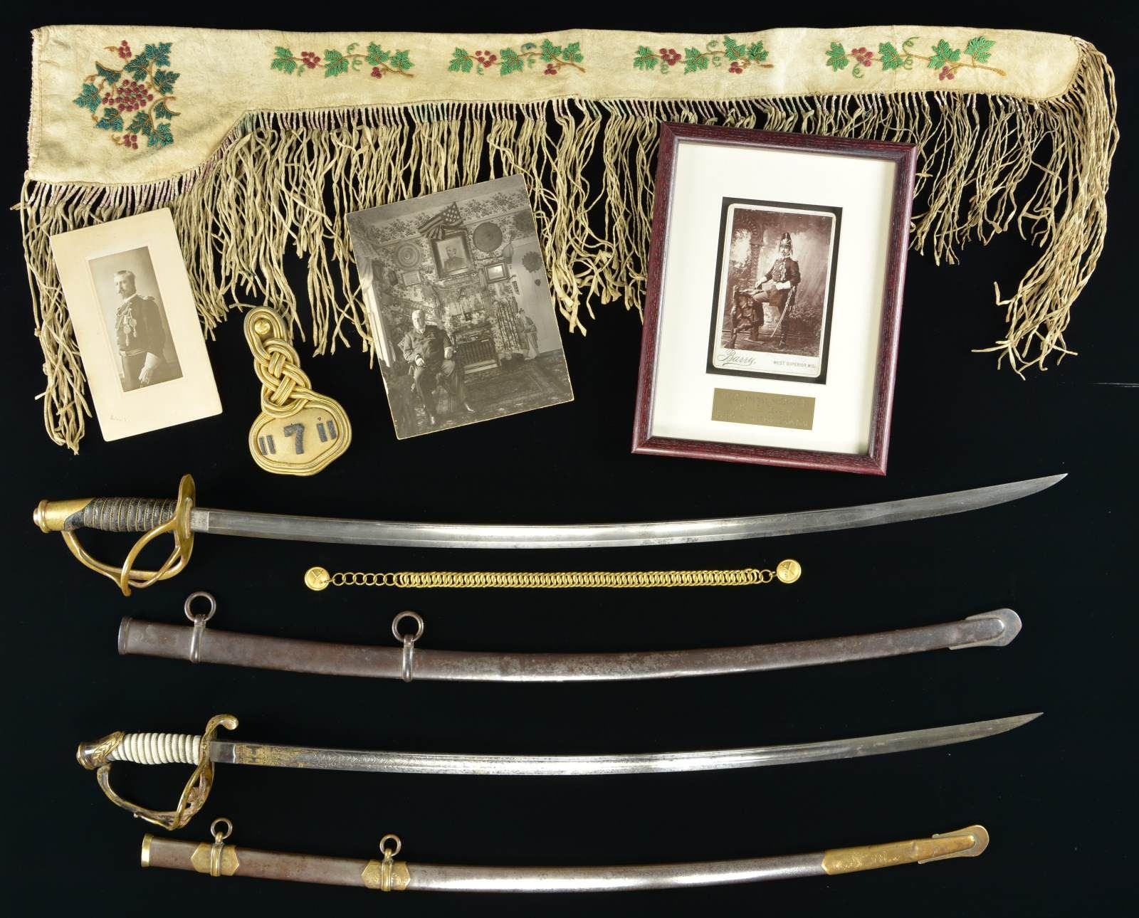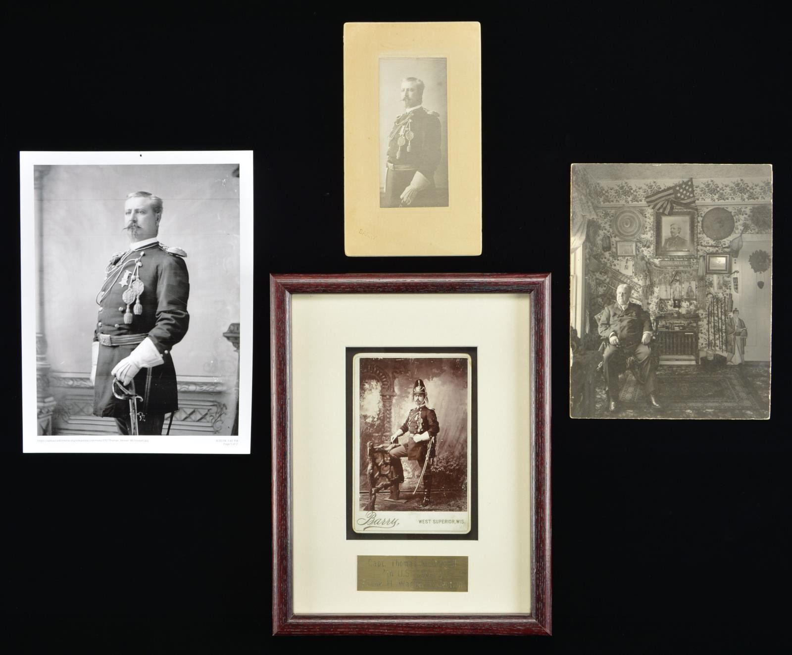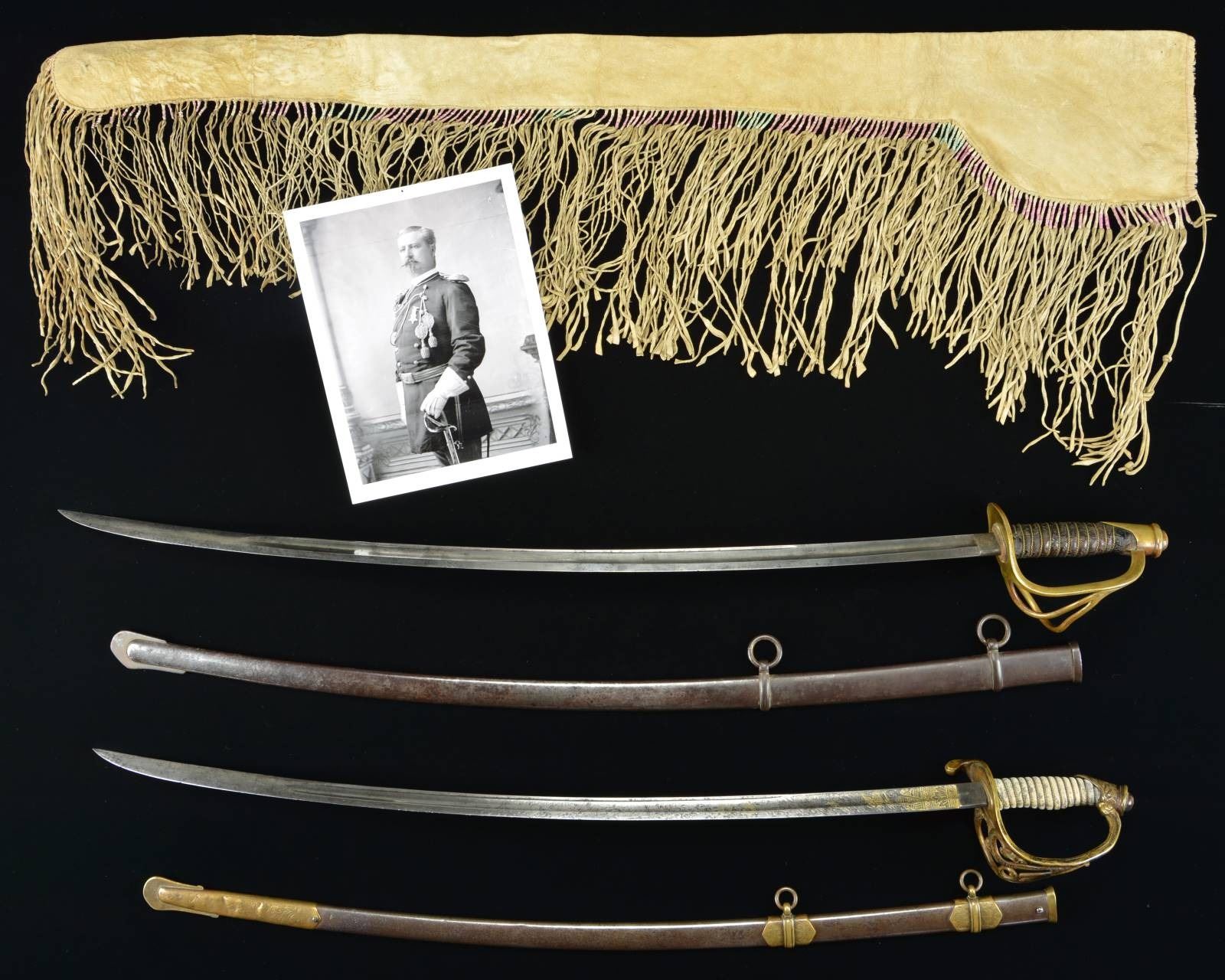 7) 9.25x7.25" Highly detailed photograph showing McDougall circa 1900 with his “memorial wall” of artifacts including portraits of famous native Americans, cavalry officer’s saber, portrait of him at Indian fighting prime, and many souvenirs including the beaded sheath which is part of this lot. Inscribed on verso “From Uncle Tom 1904”, CONDITION: very good overall, minor chipping on edges. 8) 2.5x5.5" Barry photograph of McDougall in dress uniform in side view, wearing Russian knot epaulets, aiguillettes, saber belt, and gauntlets. Mounted on 5x8.5" card with inscription on verso “For my dear nephew Howard Hastings Cummings from Uncle Tom, December 25, 1905”. UNATTACHED ACCESSORIES: file of provenance and research from Glenn Swanson. CONDITION: very good overall. PROVENANCE: From the Lifelong Collection of Glen E. Mattox. (02-18739/JS). $20,000-40,000.
