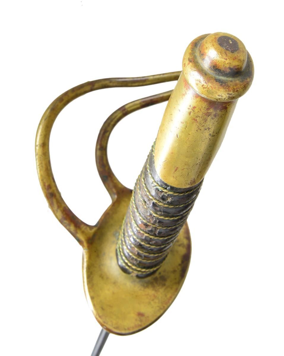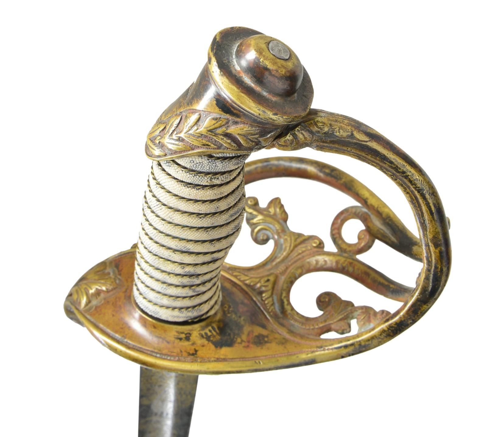 Thomas Mower McDougall (1845-1909) had a long family history of military service. Thomas entered service in Civil War at 17 years old. When he turned 18 in 1864, he was commissioned Lieutenant in the 10th US Louisiana Volunteers of African Descent, later the 48th US Colored Infantry. He stayed in service having many posts in the West. In 1870 his unit was sent to South Carolina to deal with the Ku Klux Klan, he met his wife to be and was married in Charleston in 1872. He was soon to return to Fort Abraham Lincoln, home to the 7th US Cavalry where he was stationed till well after Little Big Horn. This archive is pictured in Glenn Swanson’s collection book: “G.A. Custer his Life and Times” on pages 108-109 & 260. Rarely do original artifacts with good provenance related to Custer’s 7th Cavalry come to market and this is wonderful archive cherished by Glen Mattox. 1) Model 1872 cavalry officer saber. He appears to be wearing it in “Barry” cabinet card also in this lot. The saber has deeply etched 33" blade with patriotic motifs highlighted in gold, distinctive floral decorated branches to hilt, shark skin grip with twisted brass wire wrap. Steel scabbard is brass mounted, each mount is florally engraved. CONDITION: Saber is very good overall, showing honest use, shark skin has turned mostly white, brass has mixed mustard patina, blade etch crisp and discernible with traces of gold wash, scabbard body smooth iron patina with pitting near drag.
