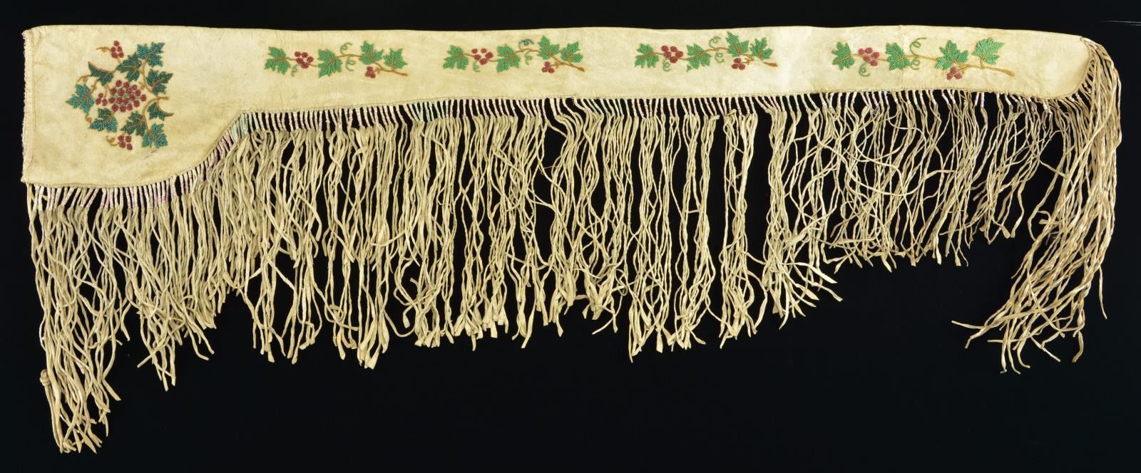 3) Native American fringed and beaded sheath. Sheath is shown in the “memorial wall” photograph with McDougal. 41" overall with 10" rawhide fringe, beaded decoration is sinew sewn with red, green, gold beads in "holly & berry" design. CONDITION: very good overall, bottom third of the fringe is dry, not supple like balance of sheath.