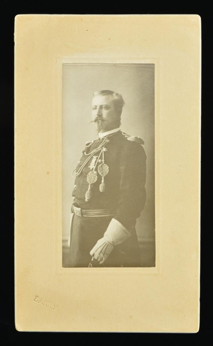6) Barry cabinet card circa 1880 showing a gallantly posed McDougall wearing 1872 cavalry helmet with Russian knot epaulets, his 1872 cavalry officer’s saber all part of this archive. 6" x 4" photo was archivally framed in 1991, 10x13" frame. CONDITION: very good overall, photo not removed from mounting but only light cosmetic scratches seen in emulsion.