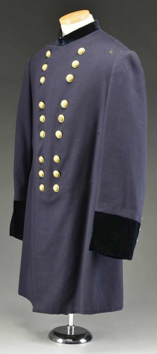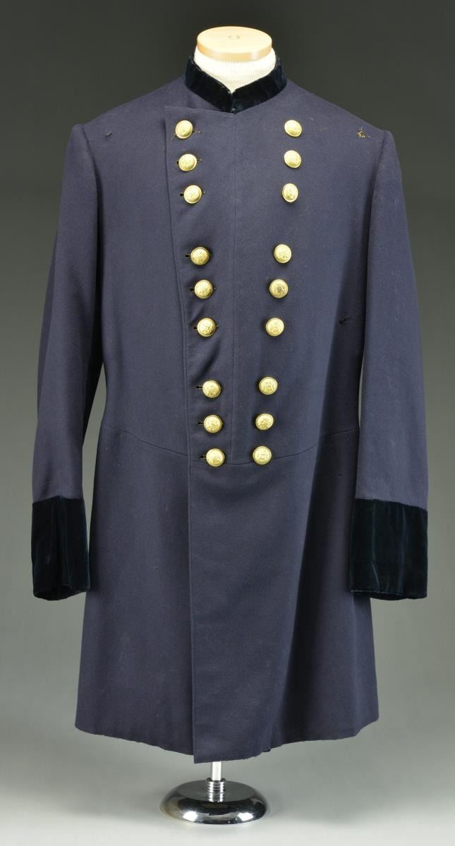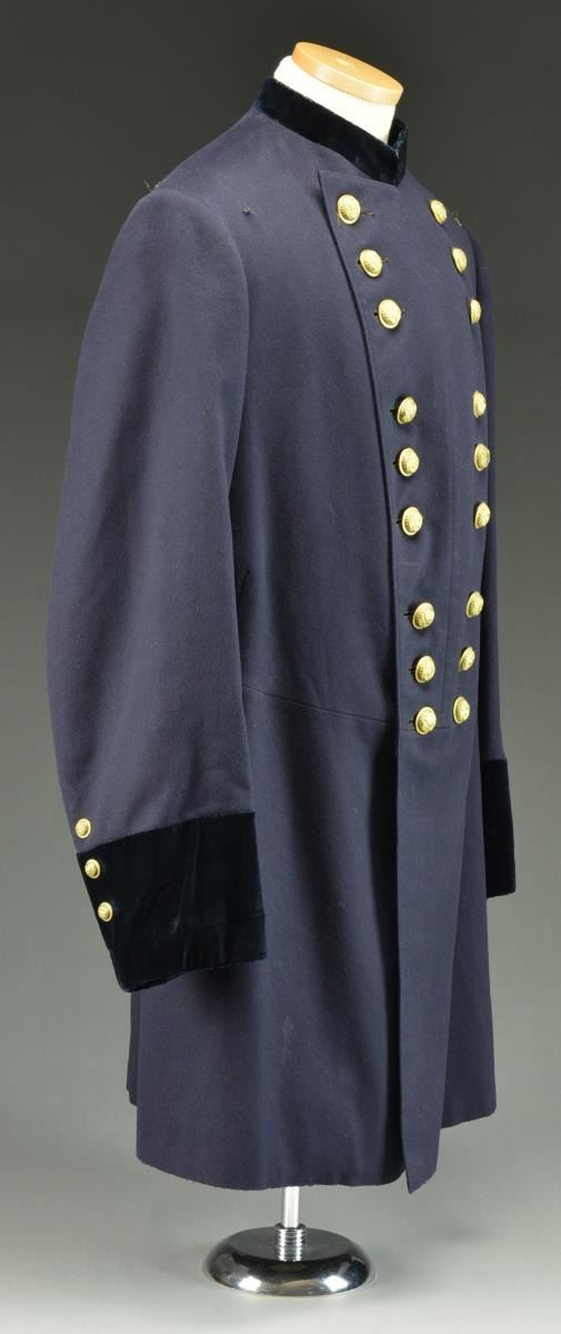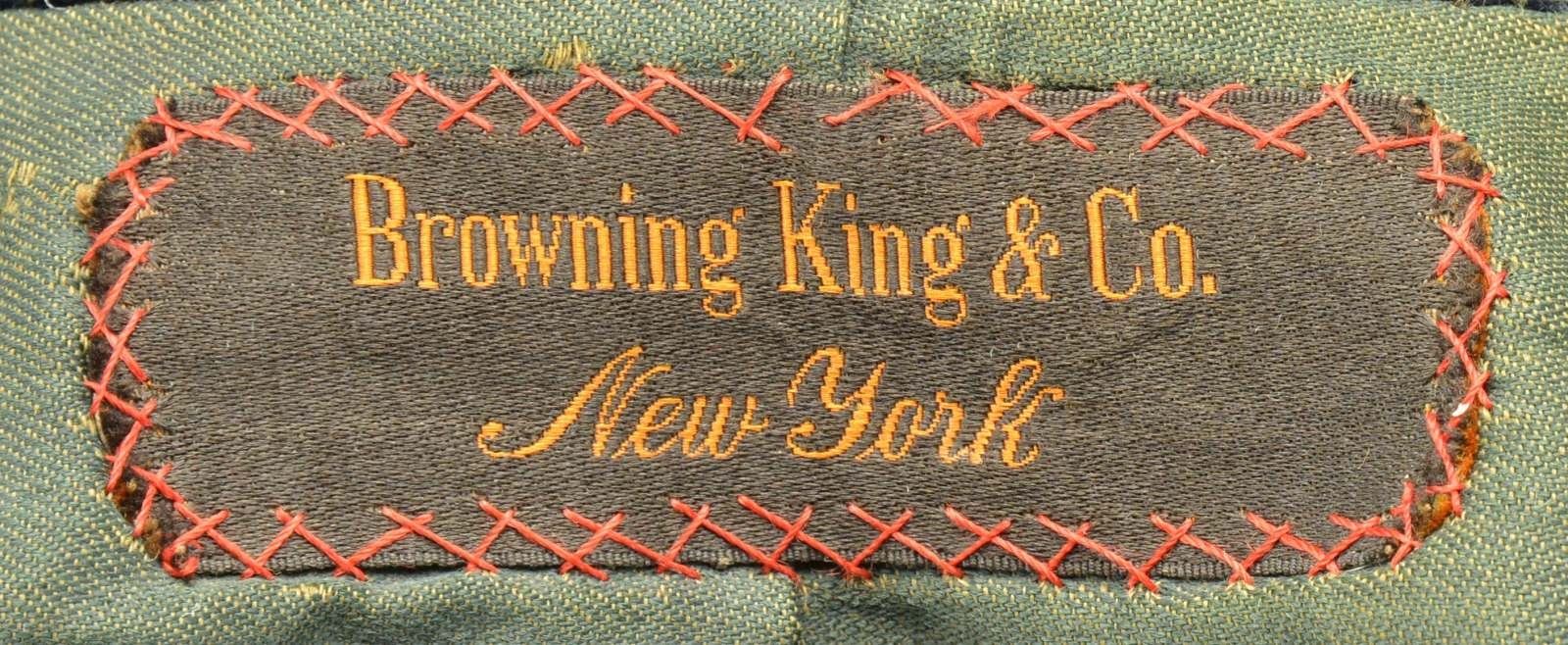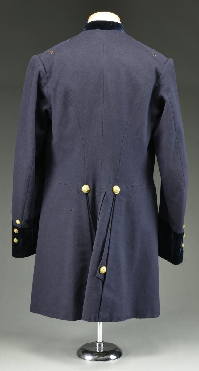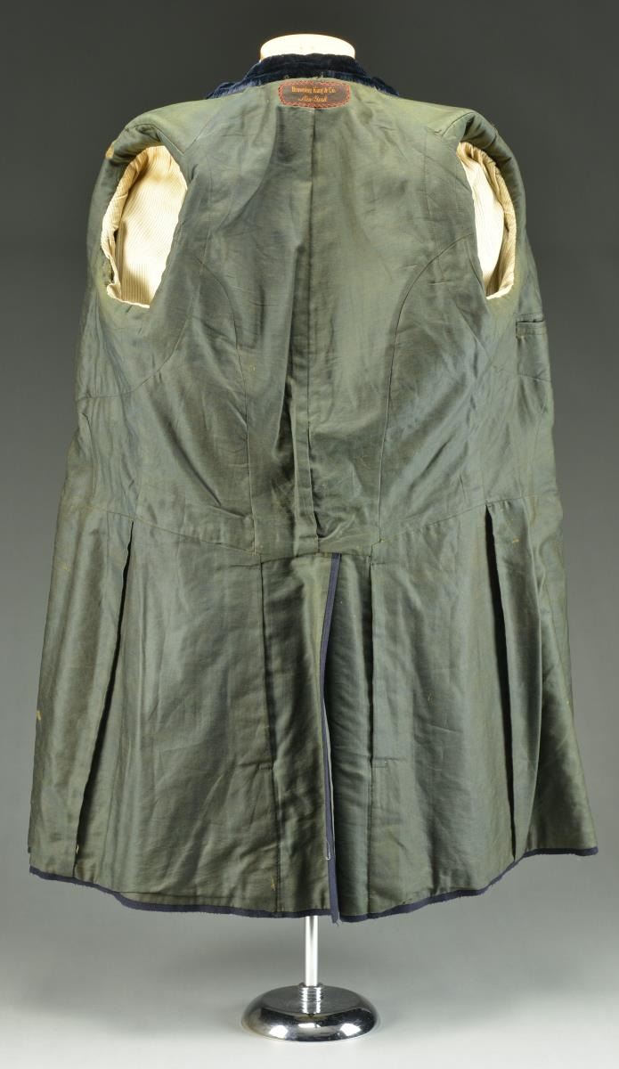 ERA. This attractive and exceptionally well made Major Generals frock coat likely dates from the late 1870’s. It has a fine grade dark blue wool body with darker blue velvet collar & cuffs. The bottom edge of the coat is unhemmed. The double breasted coat has 3 groups of 3 buttons on each side indicating a rank of Major General. Each cuff has 3 smaller buttons and the tails have 4 larger buttons. There are eyes sewn to the top of the shoulders to accept shoulder straps with hooks on the back. The sleeves are lined in striped cotton and the body is lined with a dark polished cotton material. There is an inside breast pocket on the left side and 2 tail pockets lined in brown cotton. There’s a label in the back of the collar that reads “Browning King & Co. New York”. William Browning first appears in the 1870 New York Census as a maker of uniforms and clothing. CONDITION: coat has 2 tiny holes likely caused by insect damage. Colors are bright. Wool is in excellent condition. All buttons are present. (02-18991/BF). $1,200-1,600.