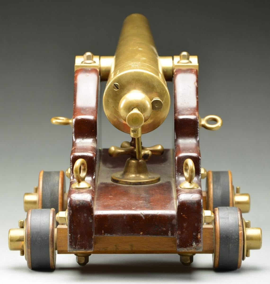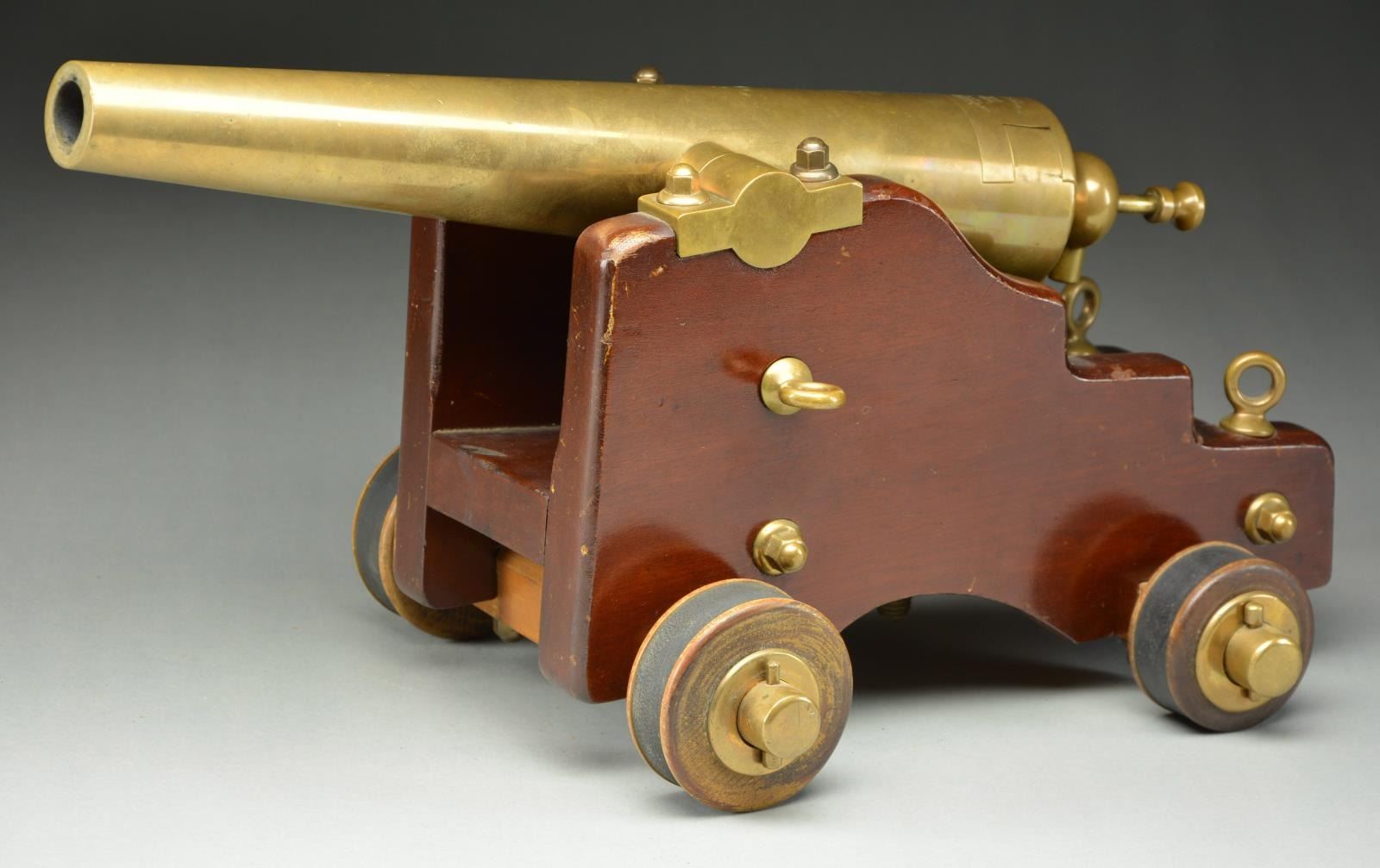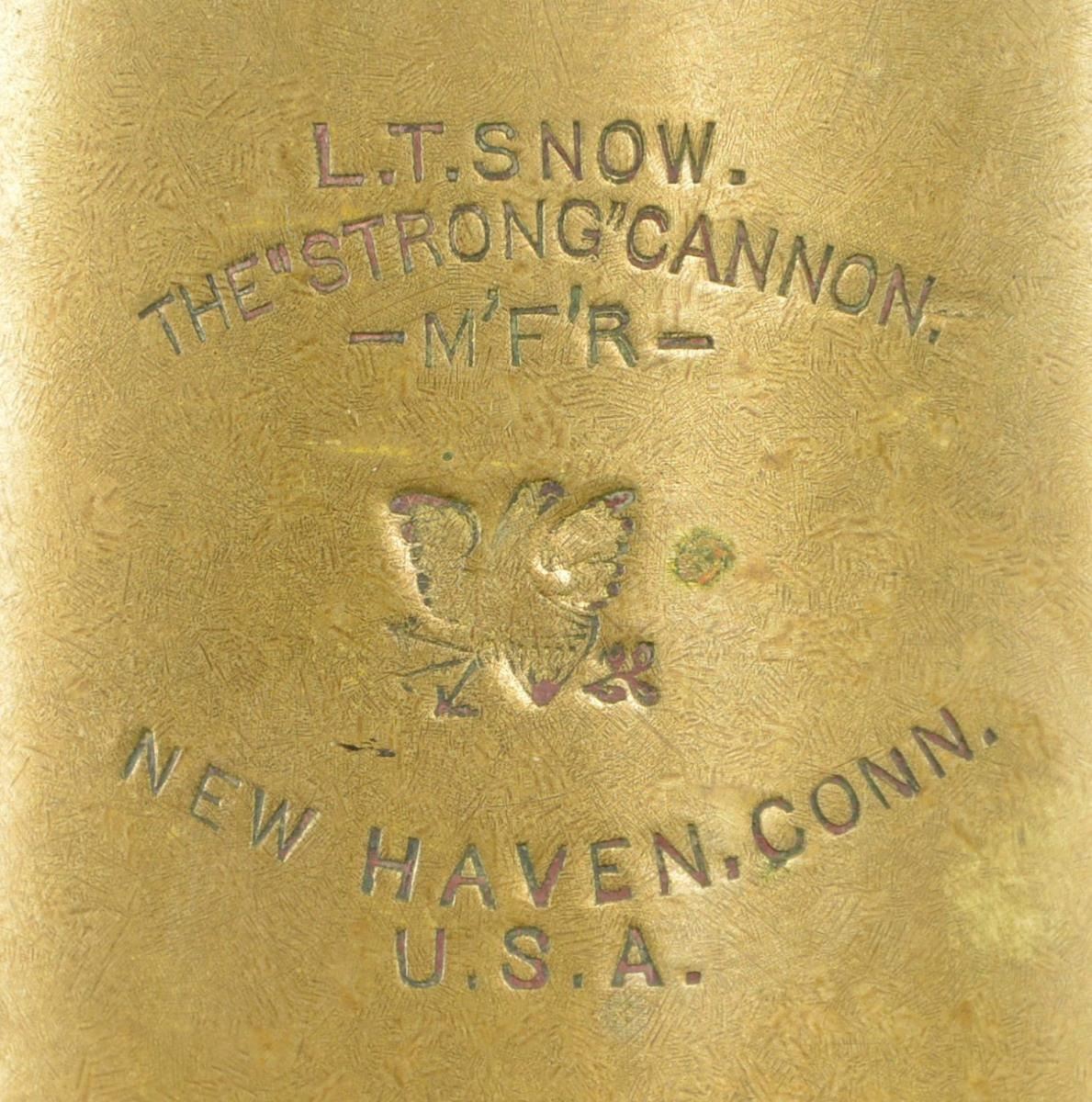 IN FINE ORIGINAL CONDITION. Cal. 8 Ga. NSN. The 16" barrel has pivoting breech block clearly stamped "L.T. SNOW" "THE "STRONG" CANNON" "-M'F'R-" eagle logo, "NEW HAVEN CONN." "U.S.A." . Breech block has late style locking lug with plunger release and lanyard type firing mechanism. Breech area of barrel has sliding extractor. Barrel is held in well made mahogany naval type carriage with four lignumvitae wheels with leather tires. Carriage also has all high quality bronze mounts including trunnion ends and rigging eyes. Faucet type elevation screw is also present. CONDITION: fine. Markings are exceptionally strong and clear. Bronze with old cleaning is toned to golden mustard. Carriage retains over 90% original varnish which shows attic burn and some dings and scratches. Wheels have some minor checks. Mechanism is in working order with the exception that lanyard is missing and needs replacement for cannon to be fired. (02-17953/MGM). $4,000-6,000.