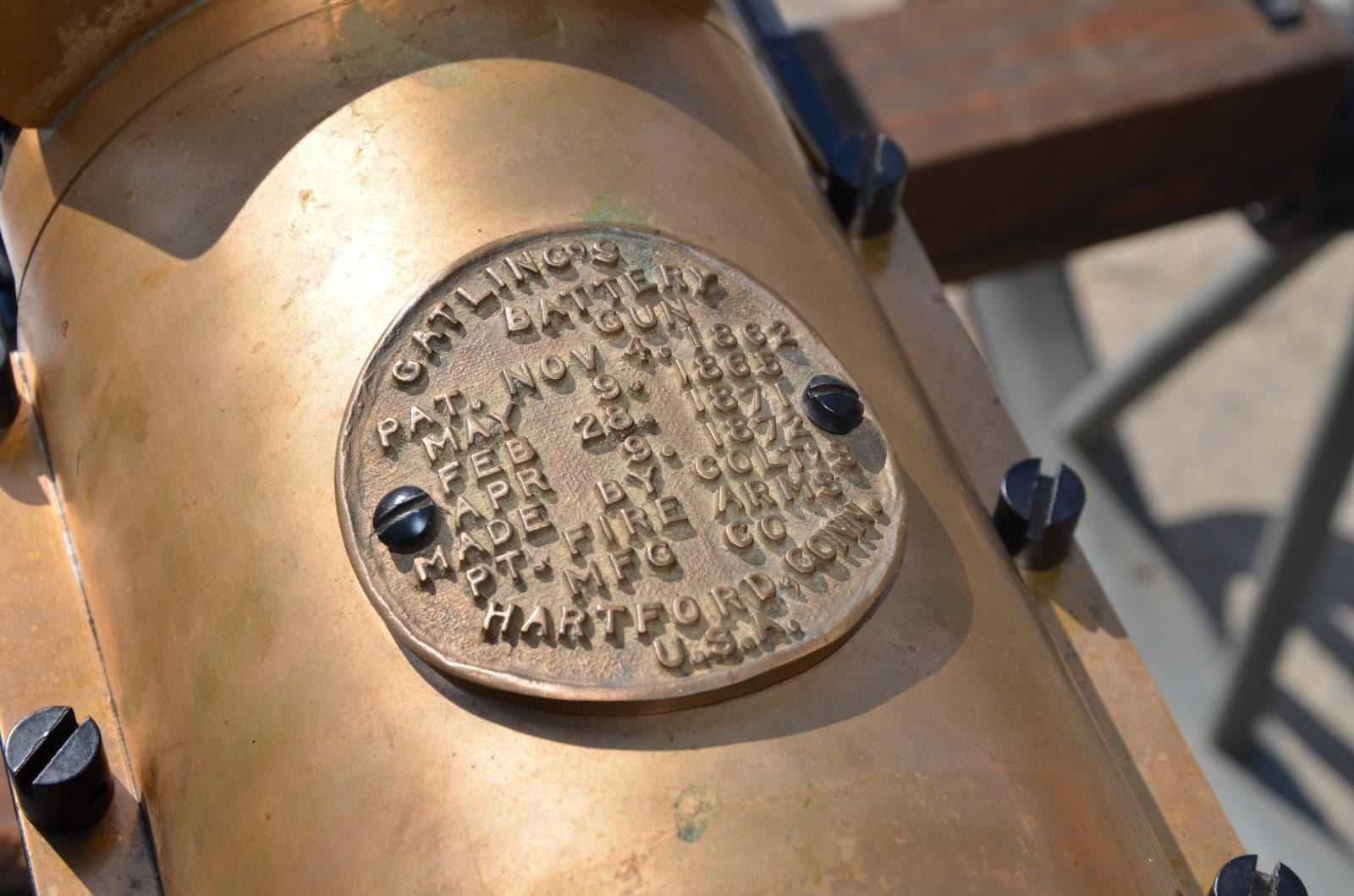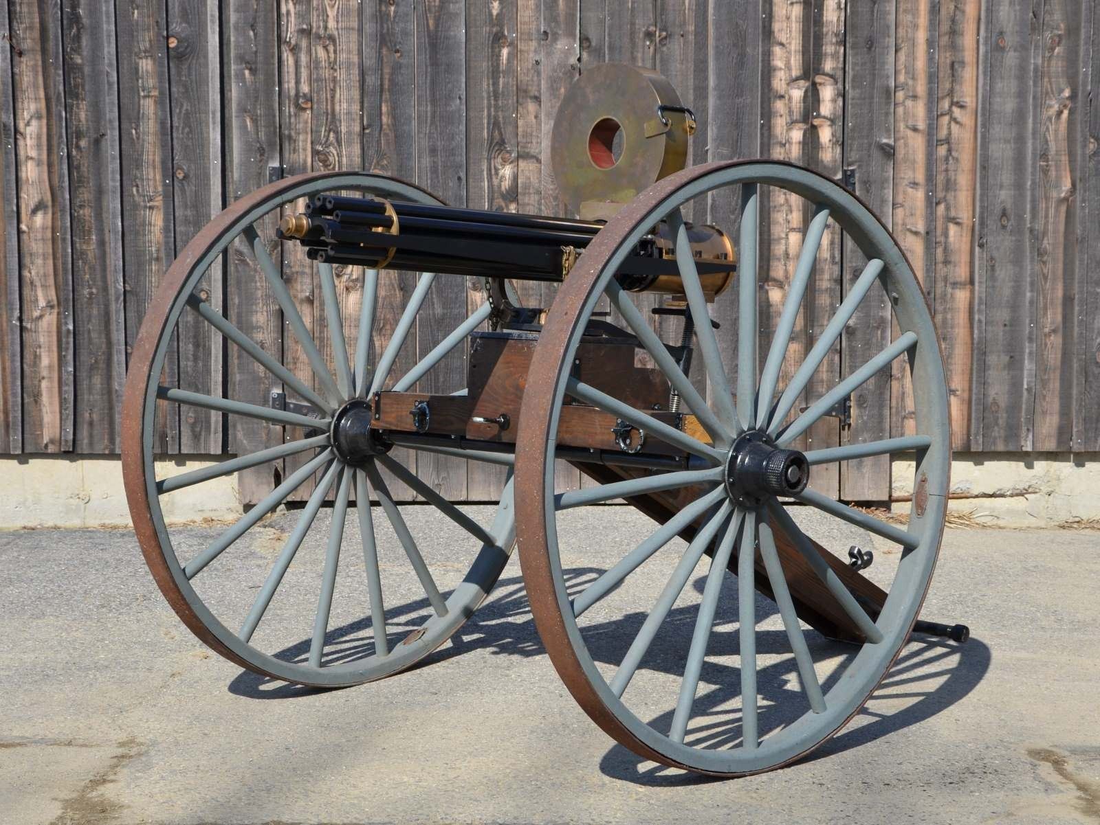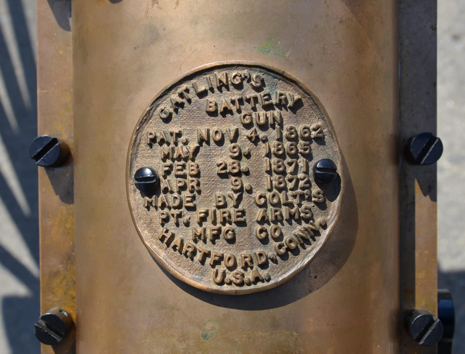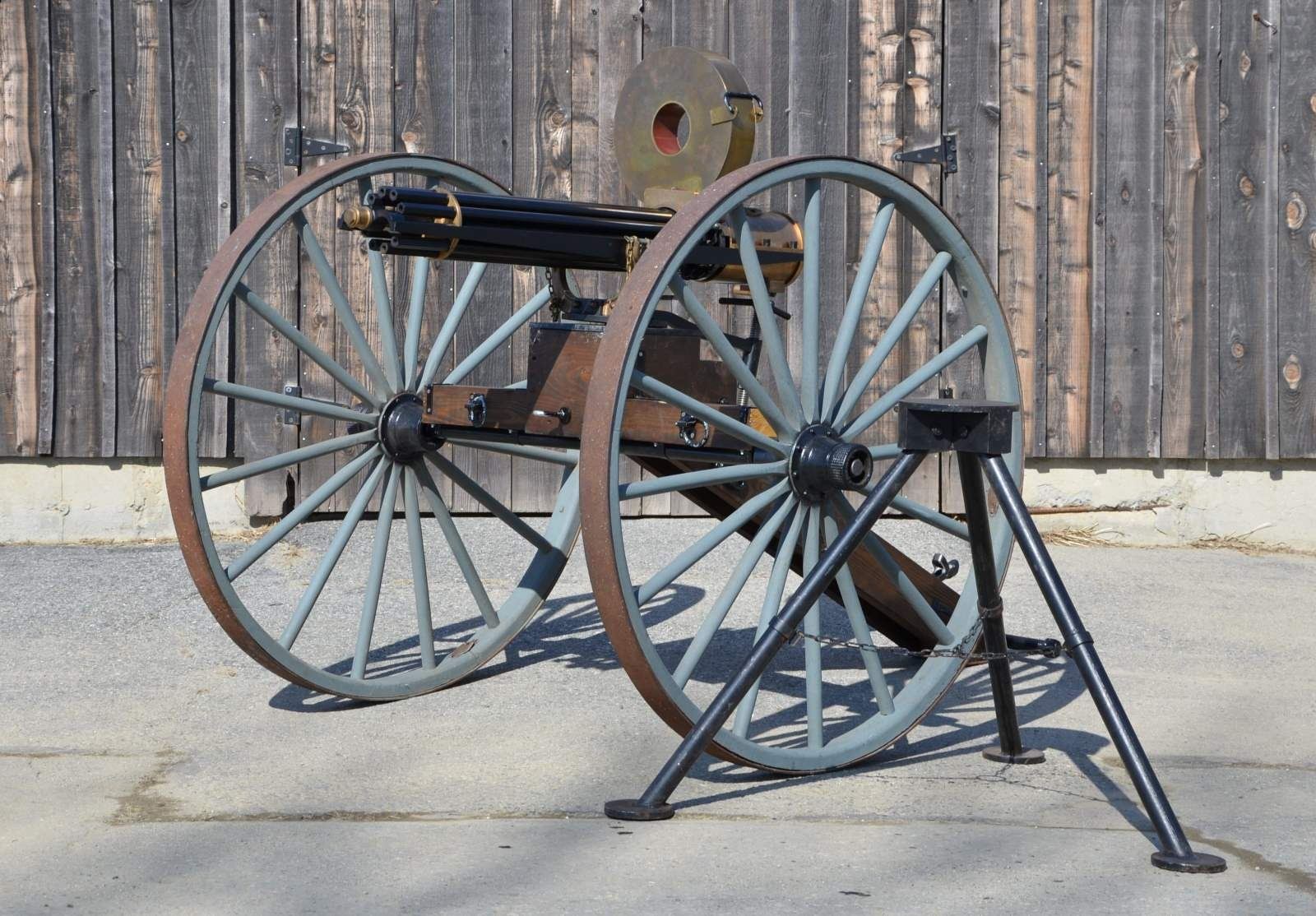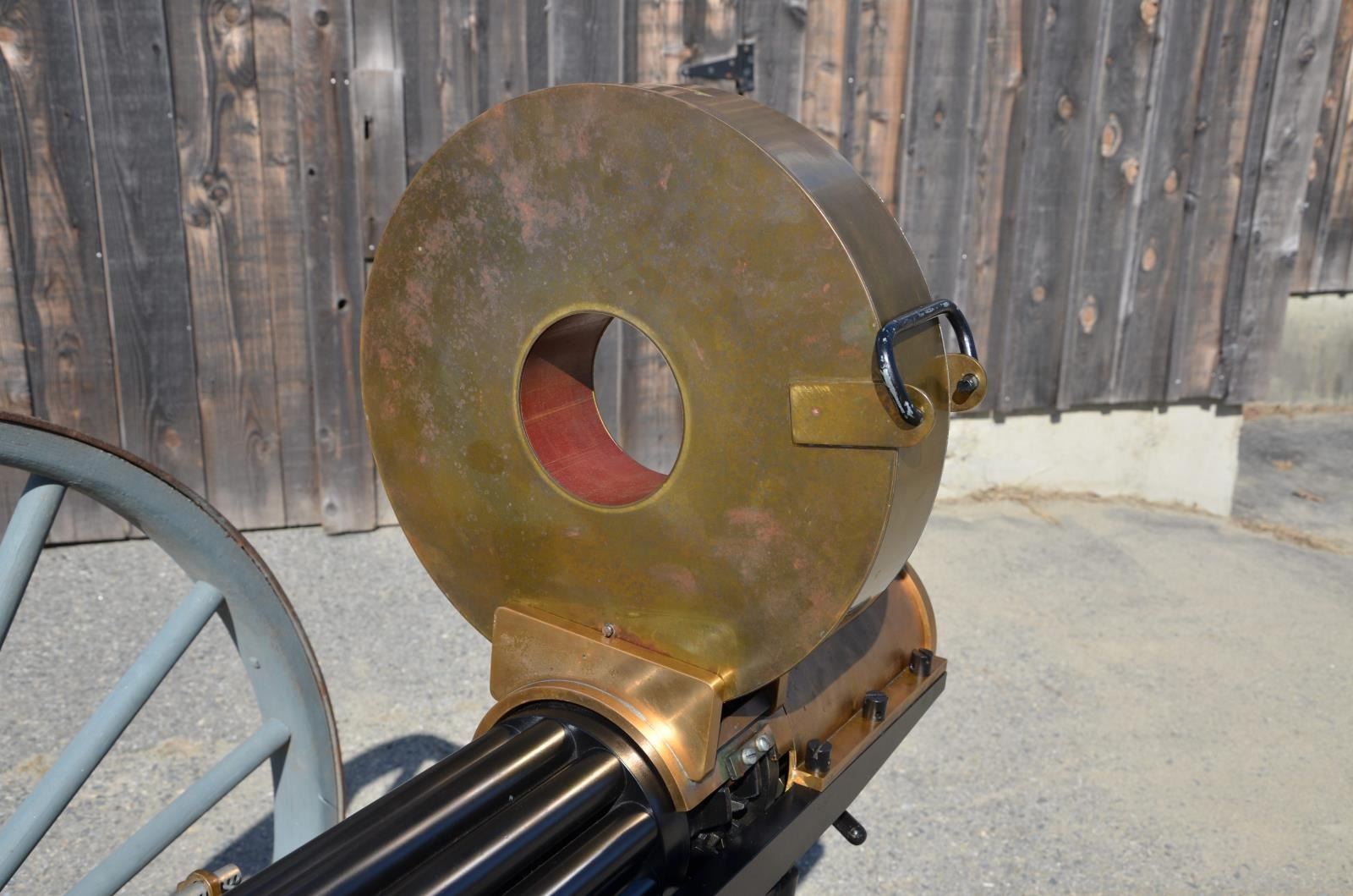 GUN. Cal. 45-70. S# 1005. Bbl. 31”. A full scale, functional reproduction of the well known 1883 Battery Gun. These guns boast a large round brass receiver with an exposed 10 barrel cluster. Heavy duty circular name plate with the original Gatling nomenclature, directly behind the feed mechanism that reads “GATLING’S BATTERY GUN / PAT. NOV 4. 1862 / MAY 9. 1865 / FEB 28. 1871 / APR 9. 1872 / MADE BY COLT’S PT. FIRE ARMS / MFG CO / HARTFORD, CONN. U.S.A.” Running parallel with the barrel cluster are 2 steel frame rails on either side, right side of receiver rail marked "Thunder Valley Machine Co. Clinton, Ohio. SN 1005". The feed mechanism is the circular Accles positive feed device. They are often referred to as a 100 round magazines though it is not uncommon for them to hold any capacity between 99-104 rounds, (we are uncertain of the capacity on this gun). The gun is mounted on a classic style field carriage w/ 48" wooden spoked wheels. Steel hubs & external steel wheel band. Gun measures 55" in length & overall length on carriage is 85" w/ a width of 58". Gun & carriage utilize a brass pintle allowing several degrees of elevation adjustment utilizing the screw elevation mechanism at the rear, below the receiver. MAGS: 1 Accles power feed drum. UNATTACHED ACCESSORIES: black steel tripod w/ central chain. The legs are 34" in length & the height from the ground to the bottom of the receiver is 30". CONDITION: both mechanically and aesthetically, everything appears to be in good condition. Brass receiver is appropriately spotted as it does w/ age, and could be heavily polished to a bright mirror surface, or as most often desired, left alone to continue to age naturally. The barrel cluster spins freely by turning crank. Accles power feed drops onto receiver but must be hand fitted to properly engage & lock in place to function. Carriage is sufficient for display while w/ some structural strengthening could make a fantastic live fire mount. Bores vary slightly in condition though all retain descent rifling and most are quite bright. Fire control mechanism appears to function correctly when cycled by hand. (20-459/JZ). MODERN. $17,500-25,000.