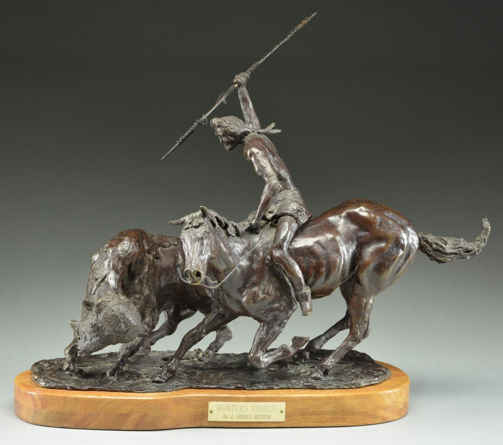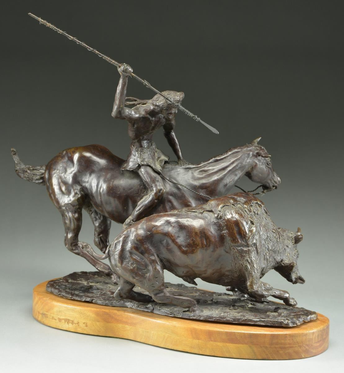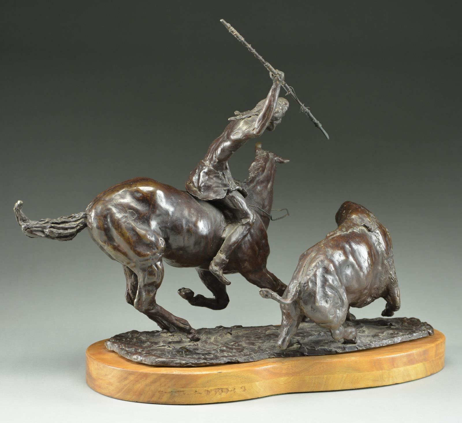 This bronze by noted cowboy sculptor J. Shirly Bothum shows in stunning detail an Indian on horseback & a buffalo turning to attack his horse as the Indian prepares to use his lance. The bronze measures 20" L X 12 1/2" W X 14 1/2" H (including the lance). The bronze is provided w/ a walnut base approx. 1 3/8" thick but is no longer attached. The base has a brass colored tag which is marked "HUNTER'S CHOICE / BY J. SHIRLEY BOTHUM". This artist began his sculpting work in the early 1970s following his career as a cowboy and rancher. He certainly had great familiarity w/ his subjects. CONDITION: bronze has light high point wear but appears complete. The wire wrapping on the iron portion of the lance has been reattached at some point. Wooden base has very light wear & scattered handling marks. (02-19538/RW). $800-1,200.