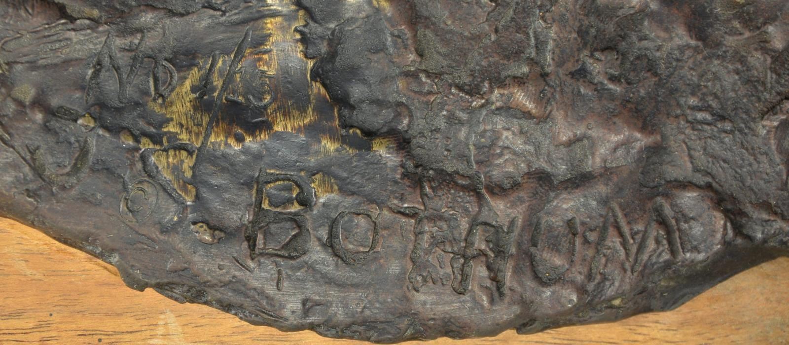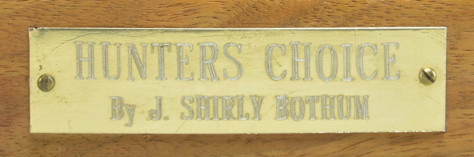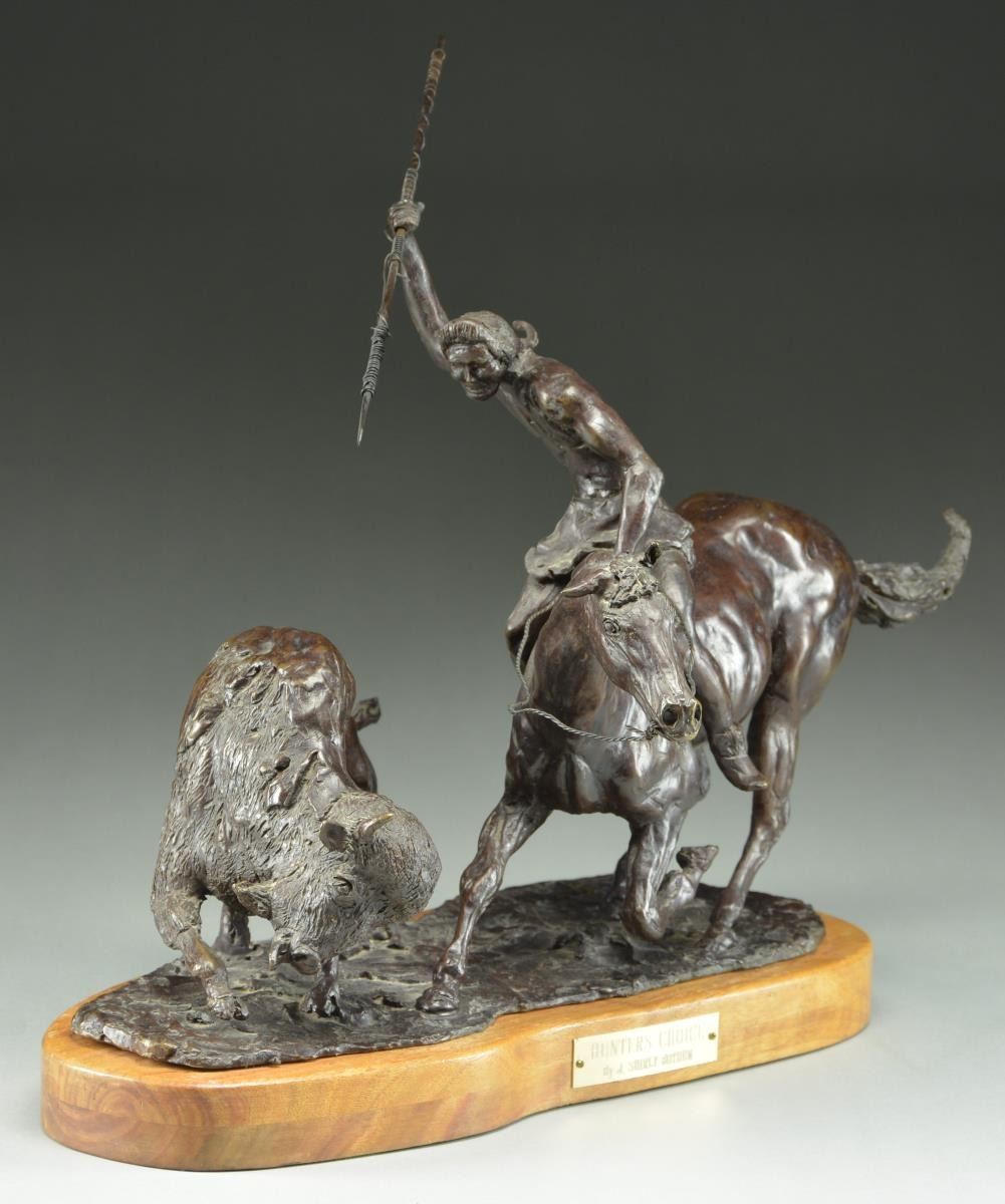 This bronze by noted cowboy sculptor J. Shirly Bothum shows in stunning detail an Indian on horseback & a buffalo turning to attack his horse as the Indian prepares to use his lance. The bronze measures 20" L X 12 1/2" W X 14 1/2" H (including the lance). The bronze is provided w/ a walnut base approx. 1 3/8" thick but is no longer attached. The base has a brass colored tag which is marked "HUNTER'S CHOICE / BY J. SHIRLEY BOTHUM". This artist began his sculpting work in the early 1970s following his career as a cowboy and rancher. He certainly had great familiarity w/ his subjects. CONDITION: bronze has light high point wear but appears complete. The wire wrapping on the iron portion of the lance has been reattached at some point. Wooden base has very light wear & scattered handling marks. (02-19538/RW). $800-1,200.