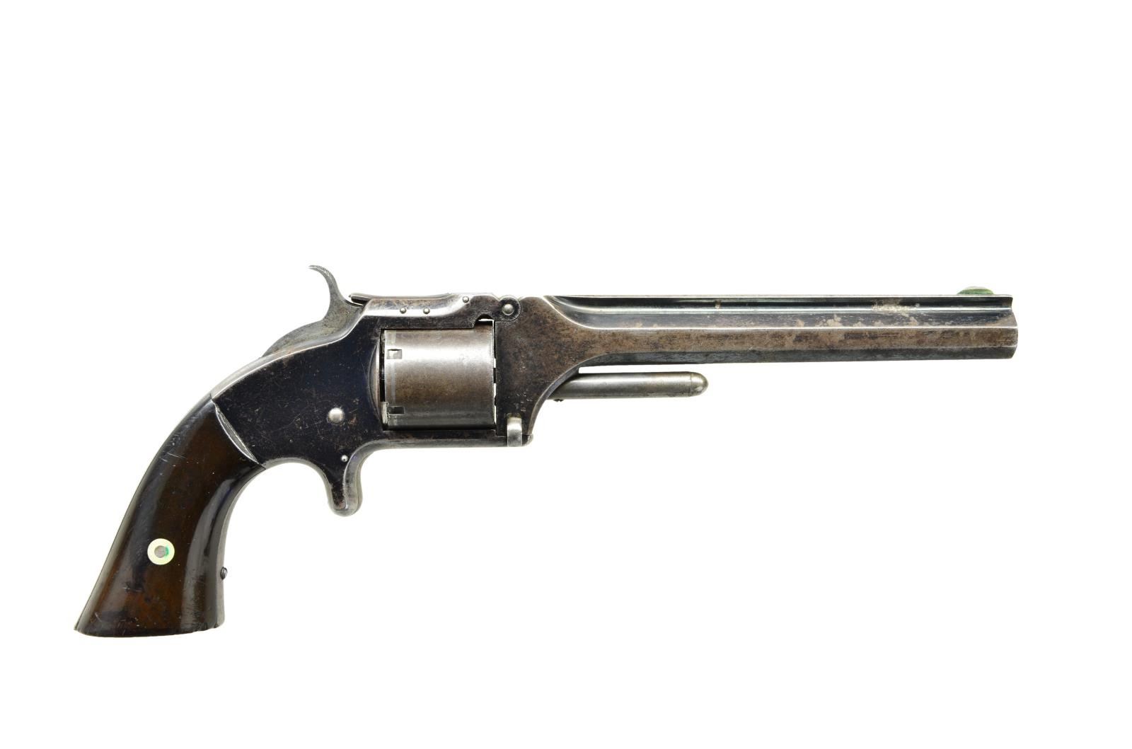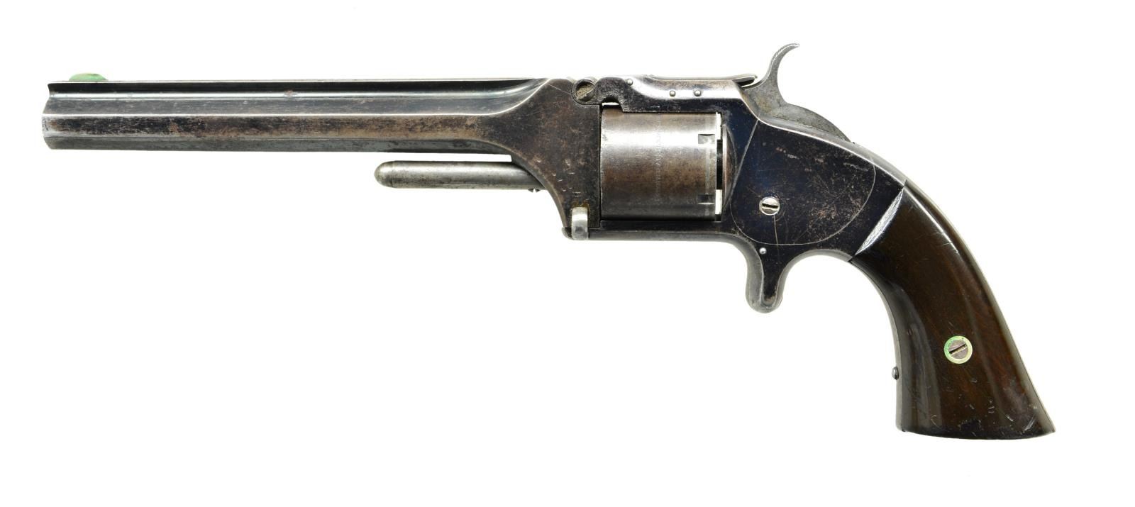 REVOLVER. Cal. 32 RF. S# 155976. Bbl. 6" ribbed w/ S&W markings on top plus brass blade sight. Mfg. 1861-1874 (approx. 77,000 units) & this one w/in time frame before Civil War. Called Army model & often used in Civil War, yet none purchased by military. Unfluted 6 rd. cyl. w/ patent dates; 61 assembly number on face, bbl. & lower left rear of frame under grip. Matching numbered (under right) rosewood grips. Top strap w/ 3 pins; earliest models had 2. CONDITION: good original appearance w/ areas of bright blue. Cyl. & grip area w/ grey patina tone. Light scratches & pinprick oxidation throughout. Broken head of bbl. hinge screw. Good plus grips w/ slight marks at butt & sm. chip on right. Fair pitted bore & good mechanical functioning. PROVENANCE: From the Lifelong Collection of Glen E. Mattox. (01-22367/NW). ANTIQUE. $1,000-1,500.