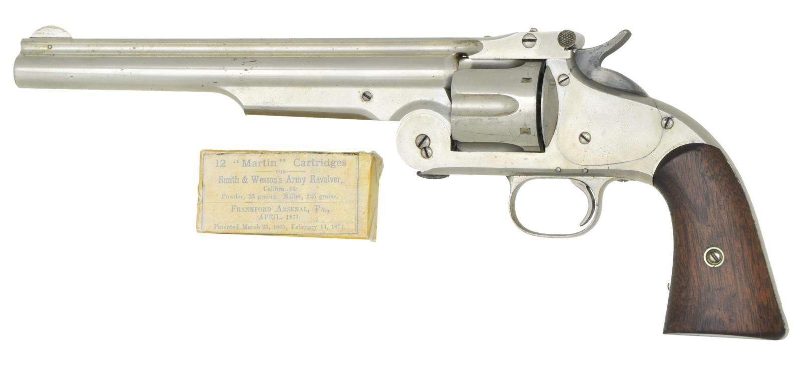 Cal. 44 S&W. S# 677. Bbl. 8" having pinned semi circular blade sight. Mfg. 1870-1872; serial numbers 1 to 8000. 1,000 ordered by US Army within serial numbers of 125-2199 with "A", "P" (not on nickel models), "US" and "OWA" (grip cartouche) markings; 800 blued and 200 nickeled (including barrel latch). Nickel examples numbered 1895 to 2199 plus 4 additional examples numbered 1722, 1729, 1863 and 1868. By references this is not in the list but number 676 is. Back of grips have "A" marks near butt of each plus "677 US" on right. "Q1" matching assembly numbers on barrel, barrel latch, cylinder and lower right rear of frame under grip. Early variation of No. 3 with square butt frame, geared ejector, long ejector housing with vent hole plus non interface of hammer and barrel latch. UNATTACHED ACCESSORIES: sealed box of 12 "Martin" cartridges by Frankford Arsenal dated April, 1871. New sealed paper wrapped (additional clear plastic wrap added) box in unbelievable condition; extremely clear writhing and one small area of light staining. CONDITION: great example being most difficult to upgrade. Original finish (slightly cloudy) having only minimal handling marks (mostly on butt) and slight pinprick oxidation (mainly in side grooves of barrel rib); faint cylinder turn line plus light oxidation on sides of frame under grips. Bottom of barrel near muzzle has 1/8" spot of light pitting. Breech face and recoil shield have unused appearance; very minimal firing residue on cylinder face. Lock up is excellent without any perceived movement. Case colors of hammer are very good to excellent; right side best appearing and slight peppery oxidation on top of left side. Grips about very good (left best appearing); right has small chip at bottom front along with light marks on butt to include appearance of 5 small zeros plus an oval. Bore and chambers are simply near excellent with unused appearances; amazing for 150 plus years!. (01-21723/NW). ANTIQUE. $3,000-4,000.