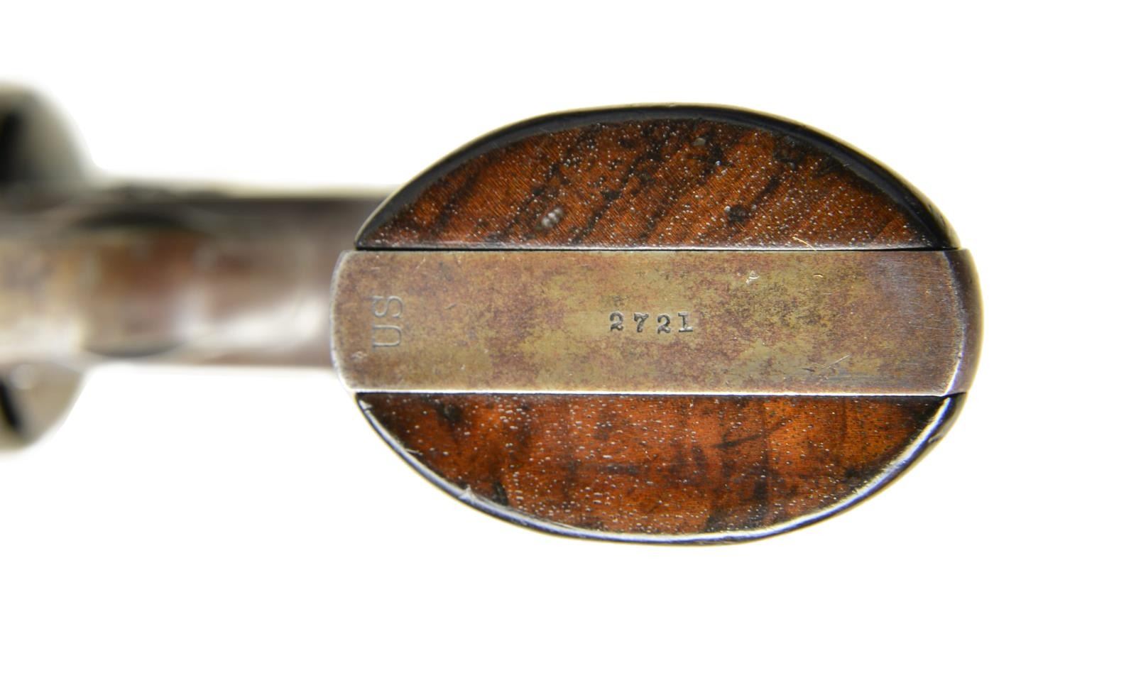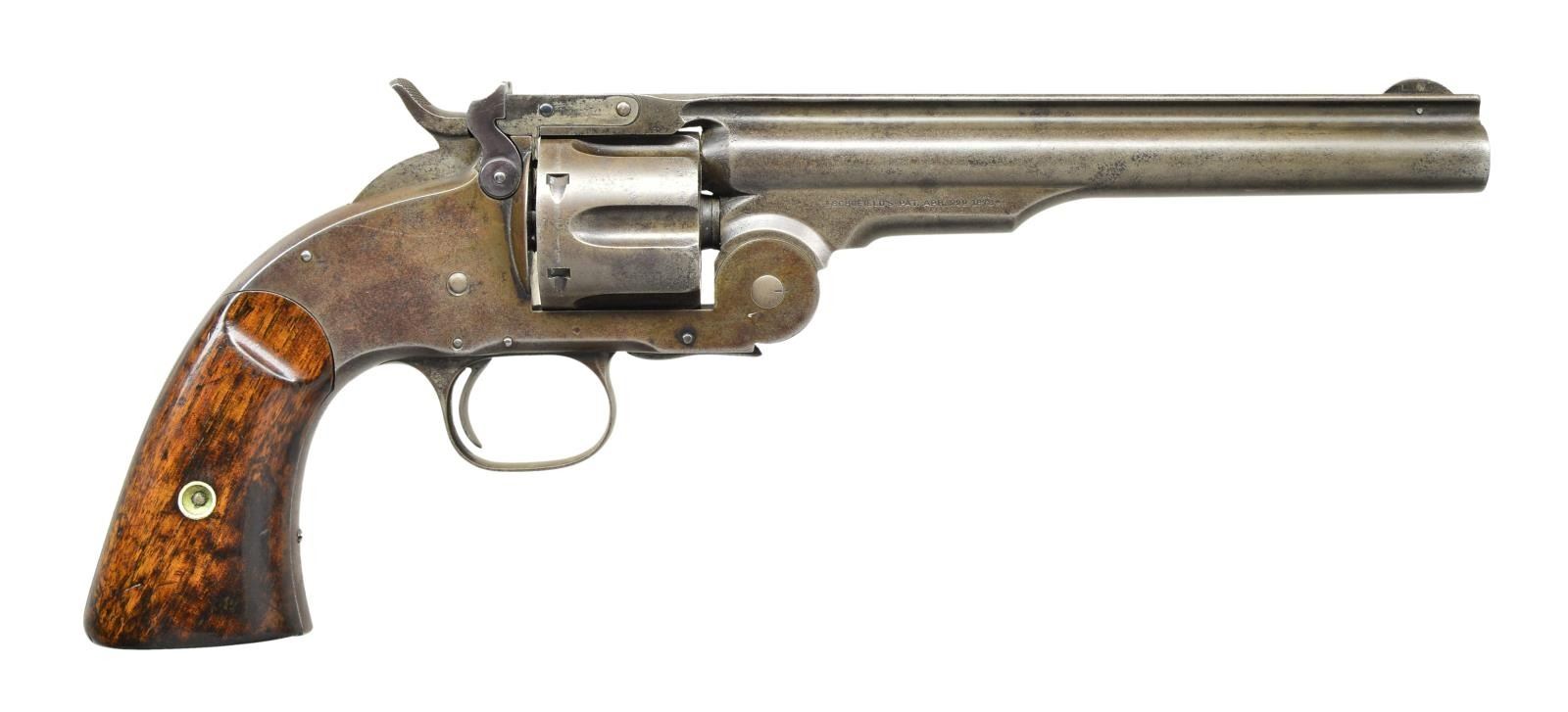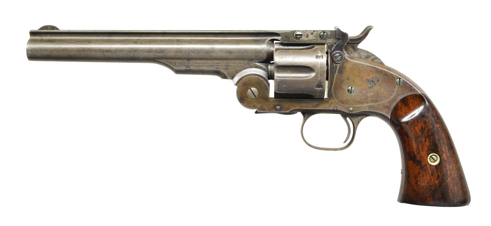 Cal. 45 S&W. S# 2721. Bbl. 7" w/ pinned blade sight & notch at rear on bbl. latch. Mfg. 1875 as 1 of 3,035 for military order. Military request was for 45 Colt cal. that was not adaptable to this revolver so S&W developed a new cartridge that could be used interchangeably in this & Colt revolvers. Based on Model 3 w/ bbl. latch on frame rather than bbl. Ejector housing of intermediate length compared to Model 3's using non geared actuator. Matching numbered 1.42" cyl., latched portion of bbl., bbl., & right grip (stamped on back). CONDITION: about good overall w/ patina tones of gray & brown mixed w/ cleaned peppery oxidation. Refinished grips w/ extra varnish leaving frame slightly proud. Proper mechanical functioning & tight lock up of bbl. & cyl. Fair to good bore w/ distinct rifling & shiny appearance having scattered pitting most prevalent at rear. (01-21754/NW). ANTIQUE. $2,000-3,000.