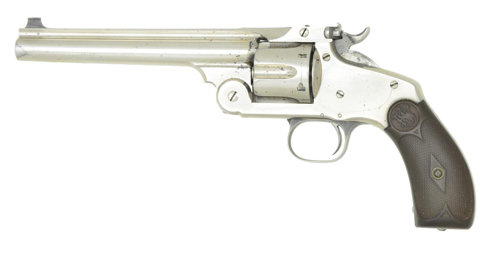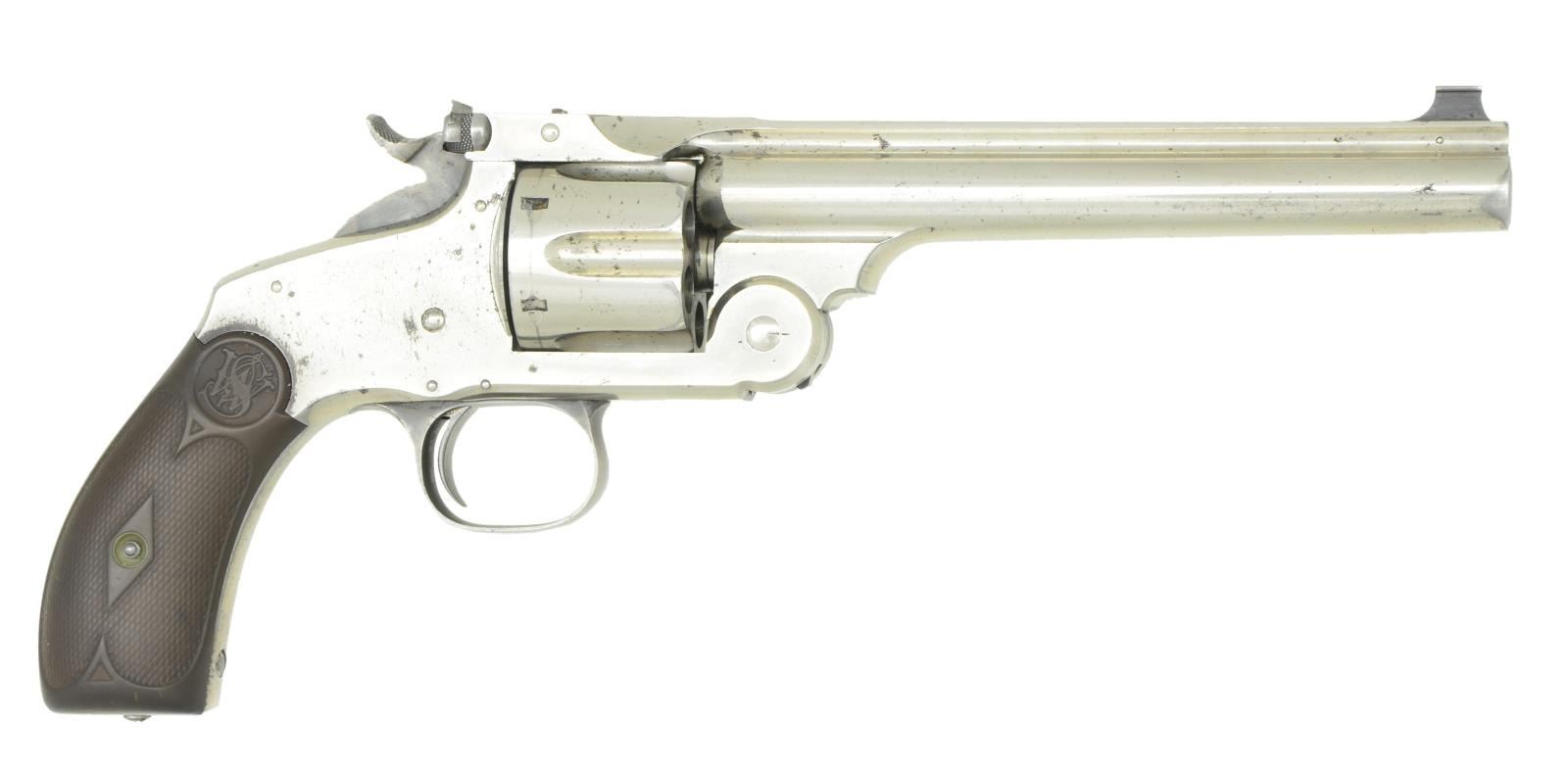 Cal. 38-44 S&W. S# 2781. Bbl. 6 1/2" ribbed w/ 1871 last patent date; 2 line address. Blued target sights; bead on blade front plus adjustable rear on latch. Mfg. 1887-1910 w/in S# 1-4333; all frames mfg. pre 1898. No cal. marking on revolver; used target cartridge of 1.475" overall length having bullet seated at or below case mouth (dimensionally accepts shorter 38 S&W cartridge). Mixture of early, late and special features. Ejector is of finger style in short housing. All matching numbers; bbl. latch, bbl., cyl. (1 7/16"), extractor, frame & checkered logo hard rubber grips; front blades also numbered but not removed to verify (precise polished fit appears original). Factory cut for shoulder stock eliminating "78" from frame butt S#. No lanyard loop; plug screw instead. Most targets mfg. in 32-44 (2,930 of 4,333); only 1,413 in 38-44. Nickel plated w/ case colored hammer, trigger and trigger guard. Sideplate on left; no S&W logo on either side. Special example in unusual cal. & configuration. CONDITION: good to very good original finish w/ thinning on sides of muzzle. Scattered peppery oxidation showing mainly on right side of frame. Occasional light impact marks. Faded case colors appearing gray. Near excellent functioning and timing. Good to very good brown toned grips w/ hand wear. Good to very good bright bore w/ scattered areas of light cleaned pitting. (01-21741/NW). ANTIQUE. $1,700-2,200.
