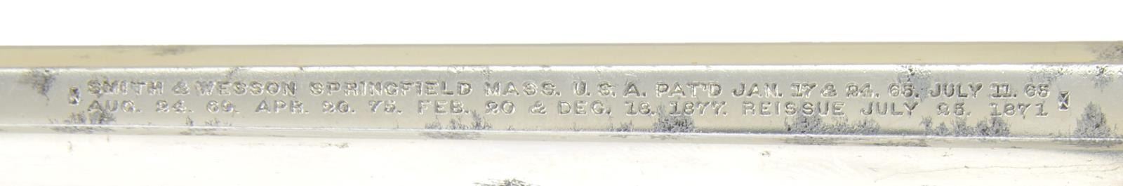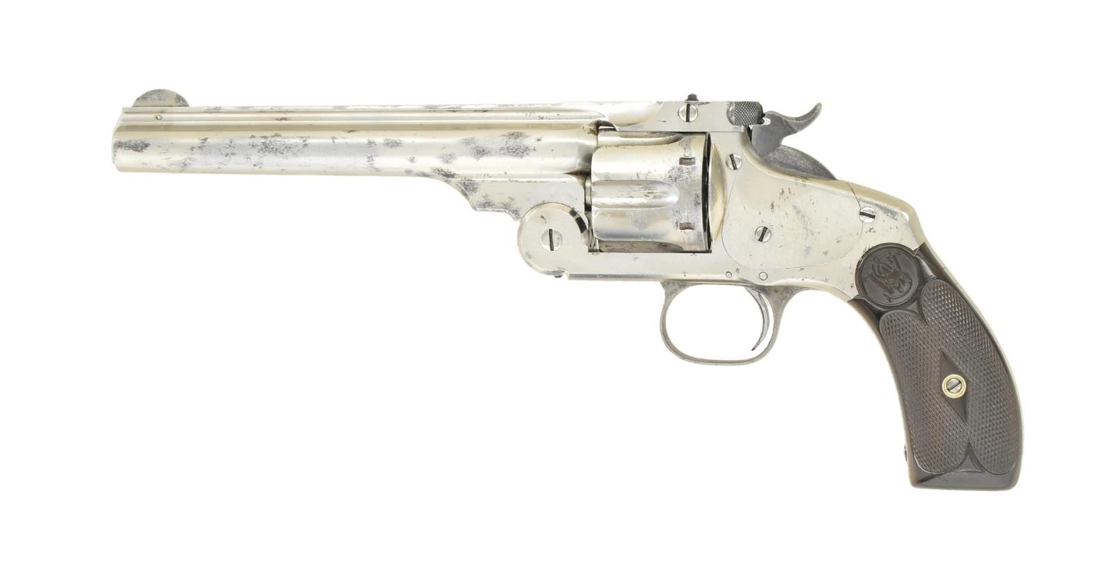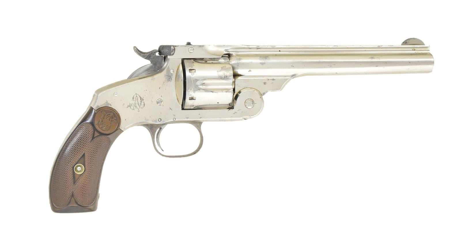 Cal. 44 Russian. S# 13274. Bbl. 6.5". Mfg. 1878-1885. Single action. Nickel finish. Brown checkered grips w/ S&W logo. Blade front & rear notch sights. 6 Shot fluted cylinder. Matching numbers on frame, cylinder, barrel & barrel latch. Grips unmarked but fit perfect. Right sideplate engraved w/ monogram of letter "A". CONDITION: original finish enjoys majority coverage though several small spots have succumb to light corrosion, then brushed clean. Finish appears to be original. Some screws illustrate light deformation from improper screw driver use. Grips in very nice condition though right grip demonstrates a little more wear & a lighter brown shade. Timing appears correct. Bore is bright w/ strong rifling. (01-23321/JZ). ANTIQUE. $1,500-2,000.