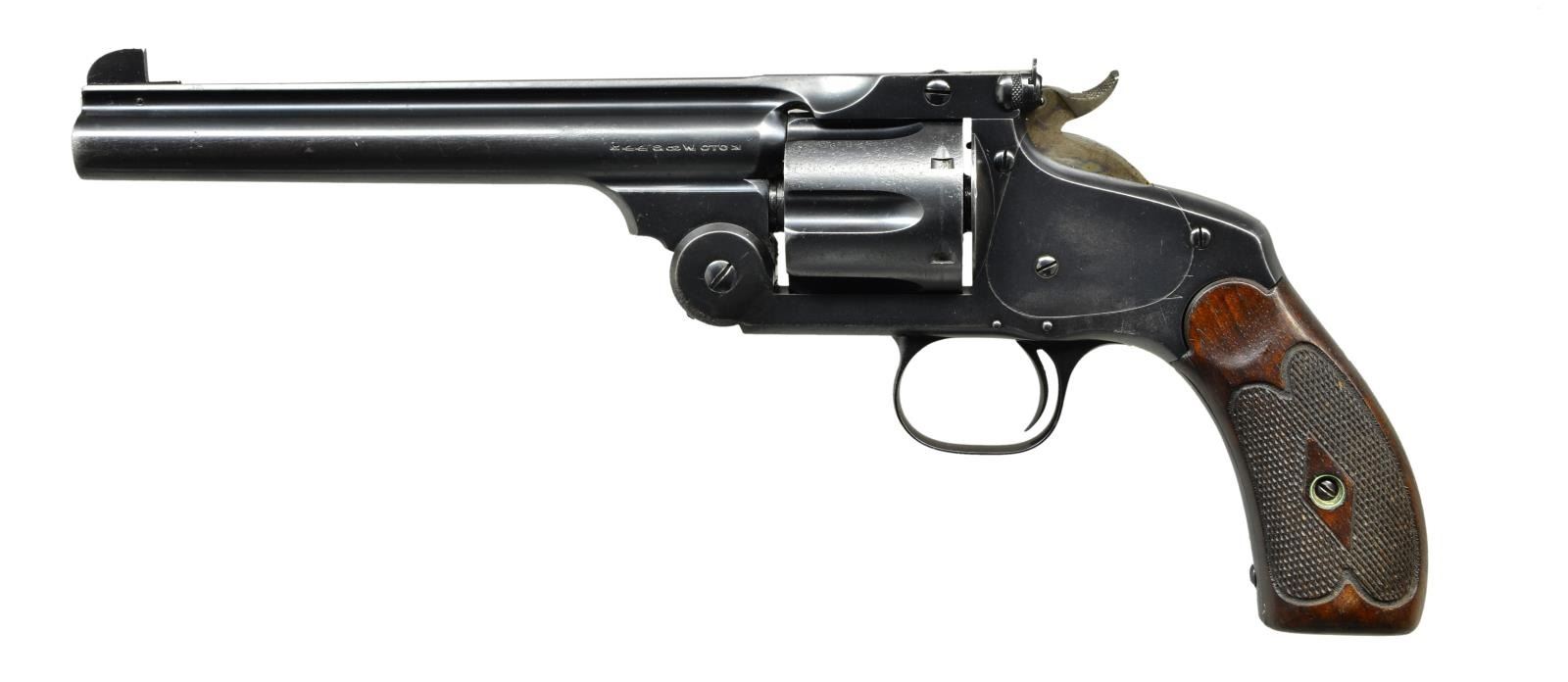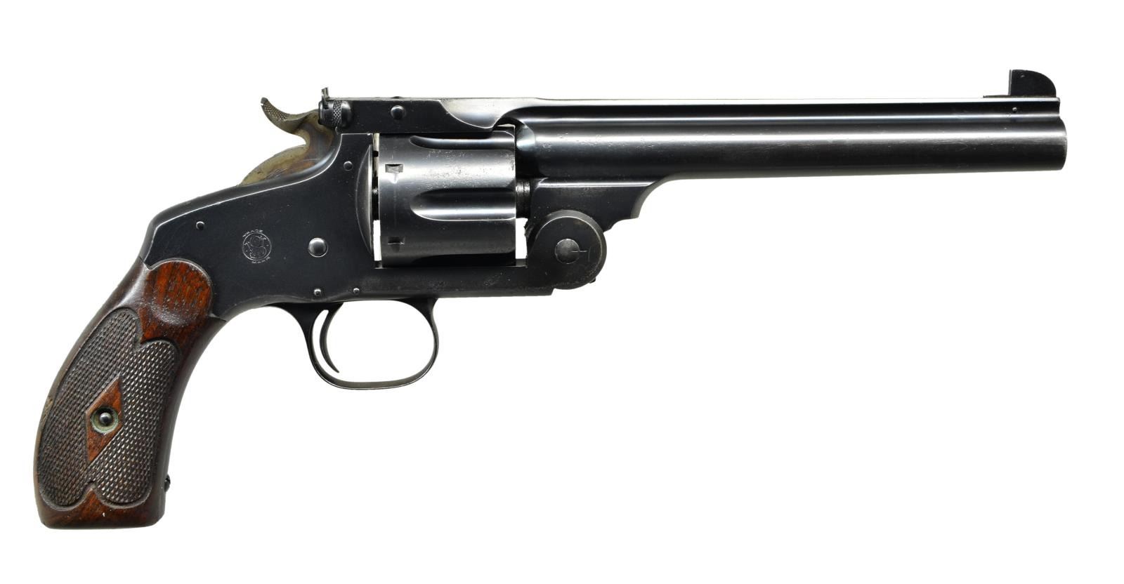 Cal. 44 S&W (Russian). S# 35651. Bbl. 6 1/2" w/ pinned Patridge front sight & latch mounted adjustable rear. All No. 3 frames mfg. prior to 1898 yet catalogued into 1908. Matching S# on bbl., cyl., bbl. latch, extractor & frame. Blued finish w/ case colored hammer. Diamond center border checkered walnut service grips (no numbers) w/ recesses at tops rather than medallions plus pointed scallops at tops & bottoms. CONDITION: very good plus as refinished over occasional light pitting. Screws, profiles, edges & markings well preserved. Near excellent grips. Good bright bore w/ distinct rifling yet spots of light pitting. (01-22119/NW). ANTIQUE. $1,000-1,500.
