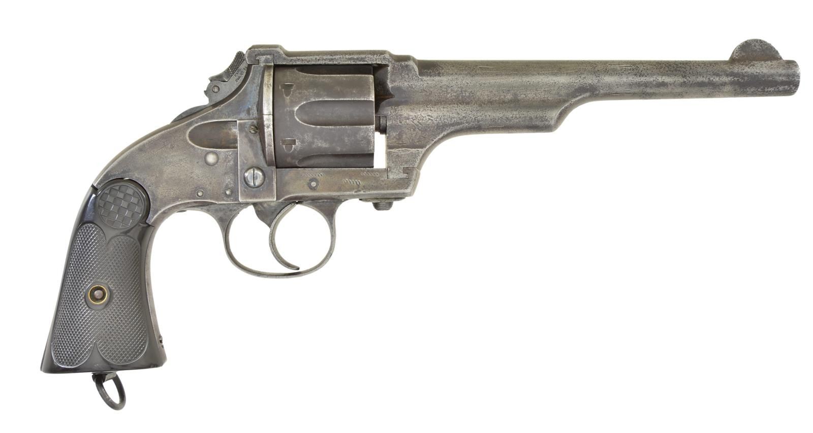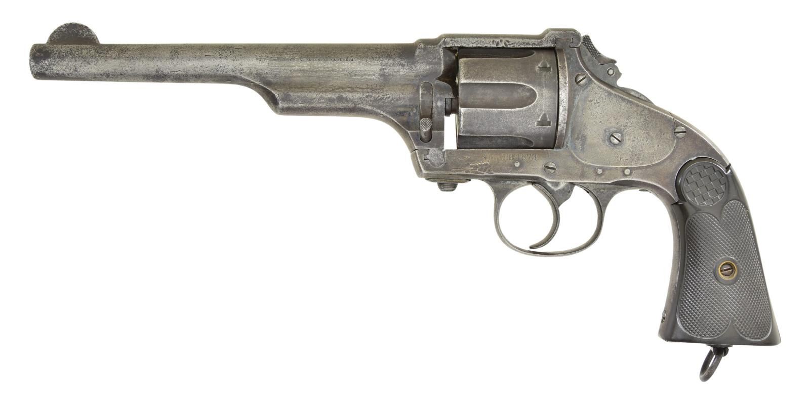 Cal. 44-40. S# 23820. Bbl. 7” w/ semicircular front sight & V notch rear sight. Fluted six shot cyl. Hammer has folding spur. 2 piece checkered hard rubber grips w/ lanyard ring at butt. Several thousand mfg. in the 1880s. CONDITION: metal finish has faded to gray showing scattered pitting & dents w/ vice marks on lower portion of frame. Grips show moderate wear. Sound action. Lightly pitted bore w/ darkness in grooves. (01-23123/DS). ANTIQUE. $1,500-2,000.