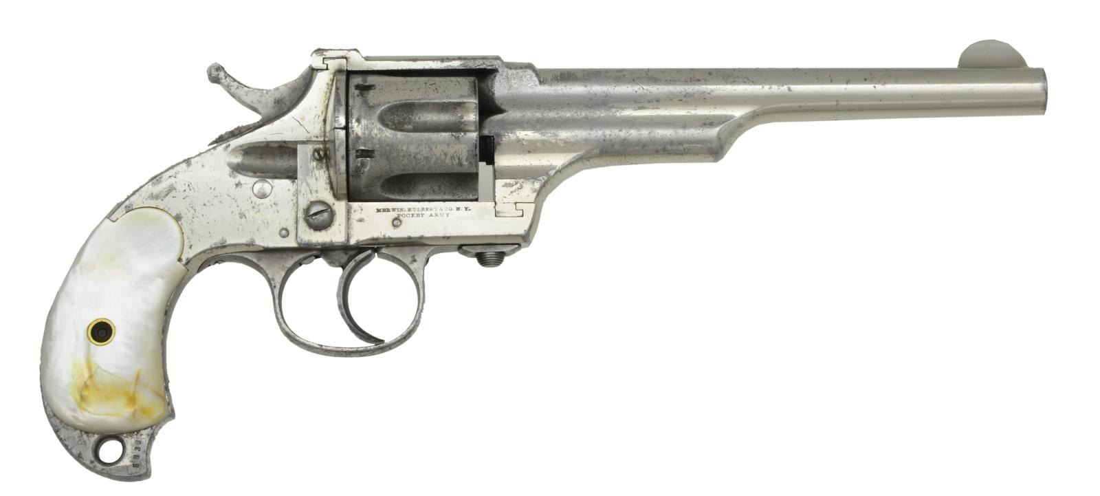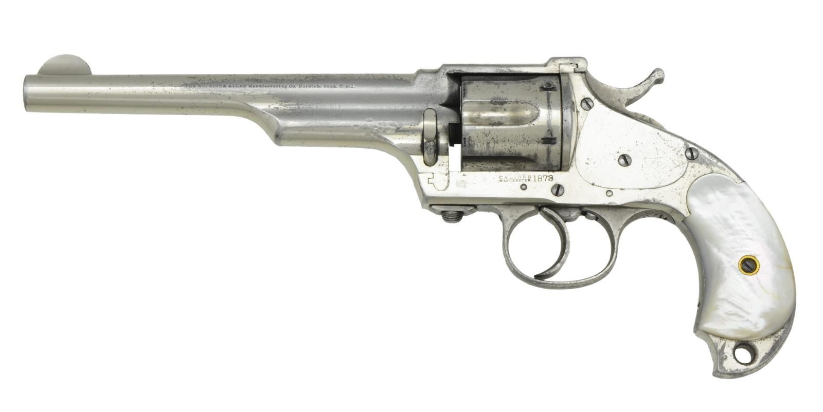 FRAME DA REVOLVER. Cal. 44-40. S# 5838. Bbl. 7" w/ semicircular front sight. Fluted six shot cyl. Full nickel finish. 2 Piece pearl birds head grips. Several thousand mfg. in the 1880s. CONDITION: fine. Retains over 70% original nickel. Pearl grips show some yellowing & checking. Action is worn, hammer will push off full cock. Cyl. exhibits play. Bbl. lug shows dents on both sides. Pitted bore w/ worn rifling. (01-22108/DS). ANTIQUE. $1,200-1,800.