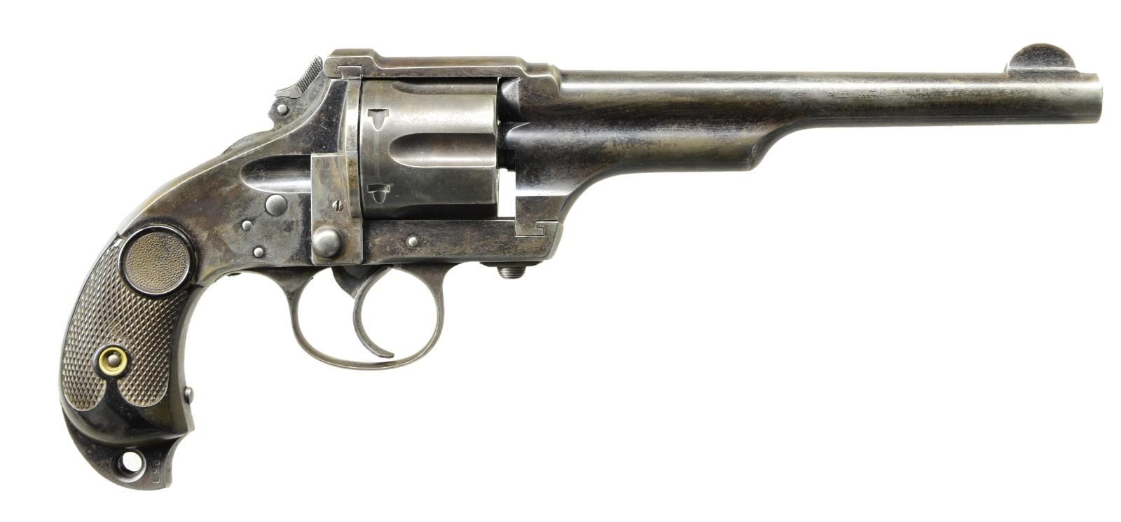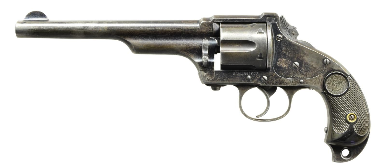 REVOLVER. Cal. 44-40. S# 8902. Bbl. 7” w/ semicircular front sight. Fluted six shot cyl. Hammer has a folding spur. Blue finish. 2 piece checkered hard rubber birds head grips. Several thousand mfg. in the 1880s. CONDITION: 40% light & fading blue. Grips show light wear. Cyl. shows play & fails to lock properly. Bbl. latch does not release properly. Bore has sound rifling showing some light pitting. (01-23121/DS). ANTIQUE. $1,000-1,500.