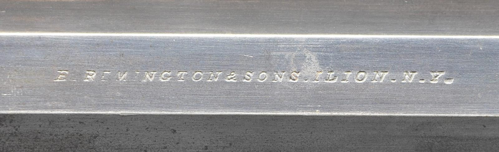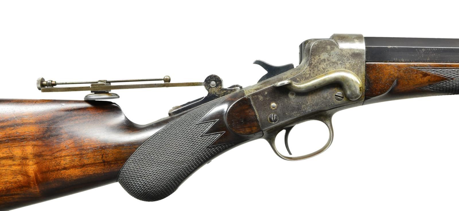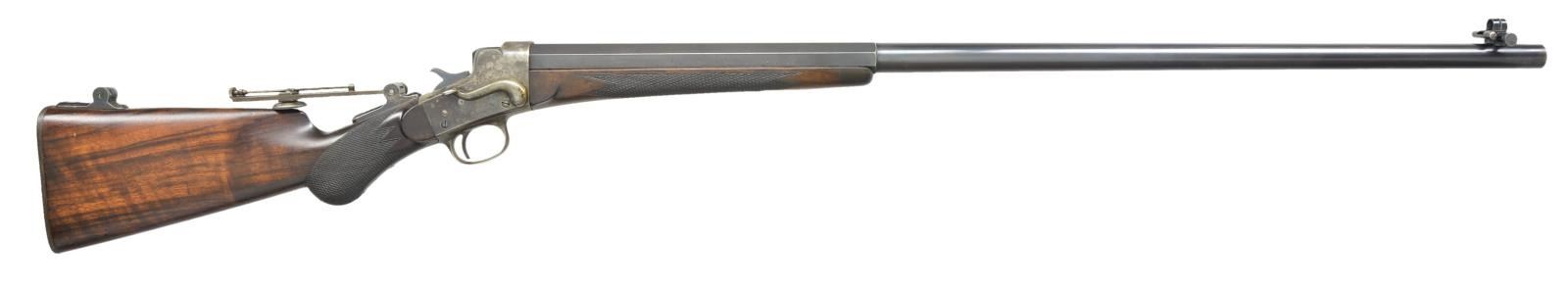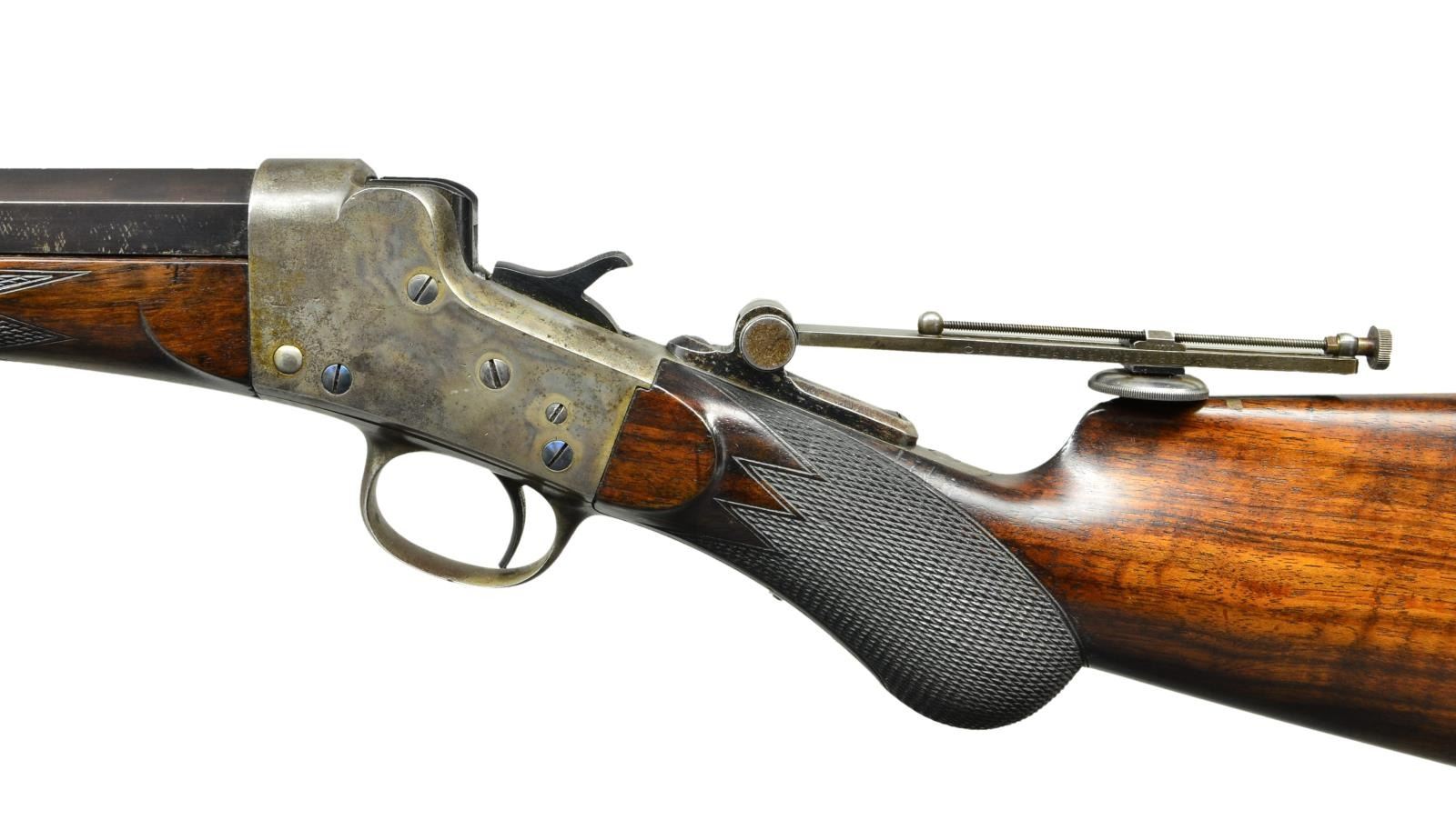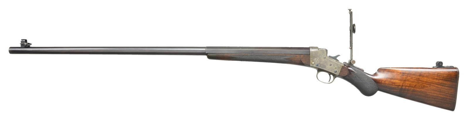 RIFLE. Featured in "The Guns of Remington" by Howard Madaus. Cal. 40-2 1/2" (40-65). S# 1434. Matching S# markings are found on the bottom bbl. flat, end of forearm & end of buttstock. Bbl. 34" octagon to round. Spirit level #414 globe front sight with Vernier tang sight. Ebony tipped forend and pistol grip stock of fancy walnut have point pattern checkering and checkered hard rubber buttplate. Heel of stock has 2nd mount for the Vernier sight. Pictured on page 170 of "The Guns of Remington" by Howard Madaus. CONDITION: over 90% lightly faded bbl. blue. Action retains some lightly visable case colors on sides and in protected areas. Stock set has good checkering and shows small marks. Bright bore retains strong rifling. (01-21583/DS). ANTIQUE. $9,000-12,000