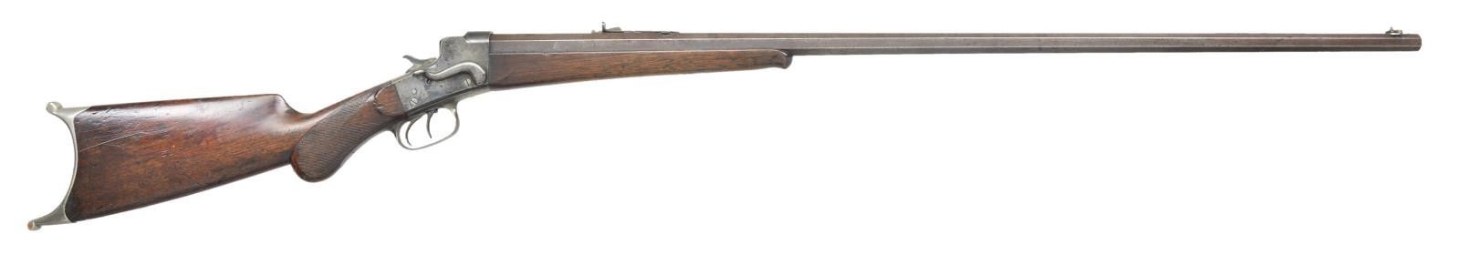 Cal. 45-90 Sharps Straight. S# 9067. Matching S#s are found on bottom bbl. flat, rear of forearm & stock. Bbl. very rare 36" tapered octagon. Combination front sight with elevator adjusted V notch rear. Scarce double set trigger. Ebony tipped schnable tipped forend and pistol grip checkered walnut stock. Nickel finished Swiss style Schutzen buttplate. Right side of stock has initials that may be "WWCM". CONDITION: metal finish has faded to a smooth brown/gray patina. Wood shows wear and numerous scratches, marks and dents. Bore has a slightly darkened appearance with sound rifling. (01-21586/DS). ANTIQUE. $7,000-10,000