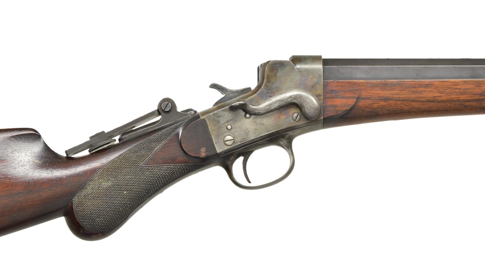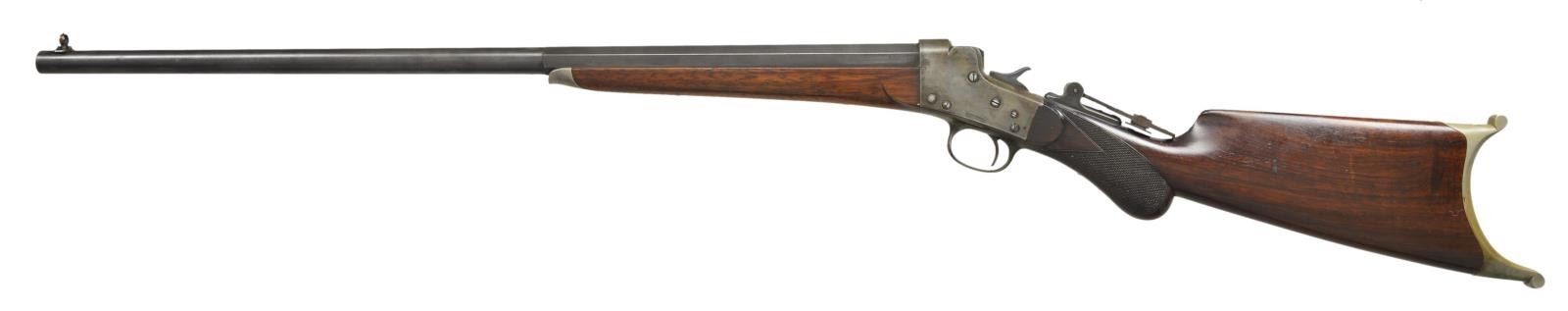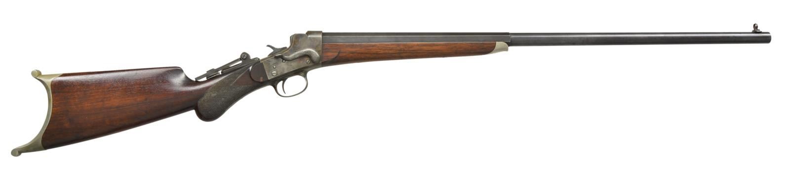 Cal. 25-20 SS. S# 7968. Matching S#s are found on the bottom bbl. flat, back of forearm, stock & underside of Swiss buttplate. Bbl. 28" octagon to round. Combination front sight with midrange Vernier tang sight. Case colored action with opening lever on right side. Left side above trigger guard is marked “HEPBURNS PAT./OCT 7, 1879”. Steel tipped forearm. Pistol grip walnut stock has checkered wrist wrist and nickel finished Swiss style schuetzen buttplate. CONDITION: bbl. retains 80% dull blue showing edge wear and spots of freckling. Action shows 60% case colors having scattered dark spots. Wood finish shows scratches and marks. Shiny & near excellent. (01-21589/DS). ANTIQUE: $4,500-6,500.