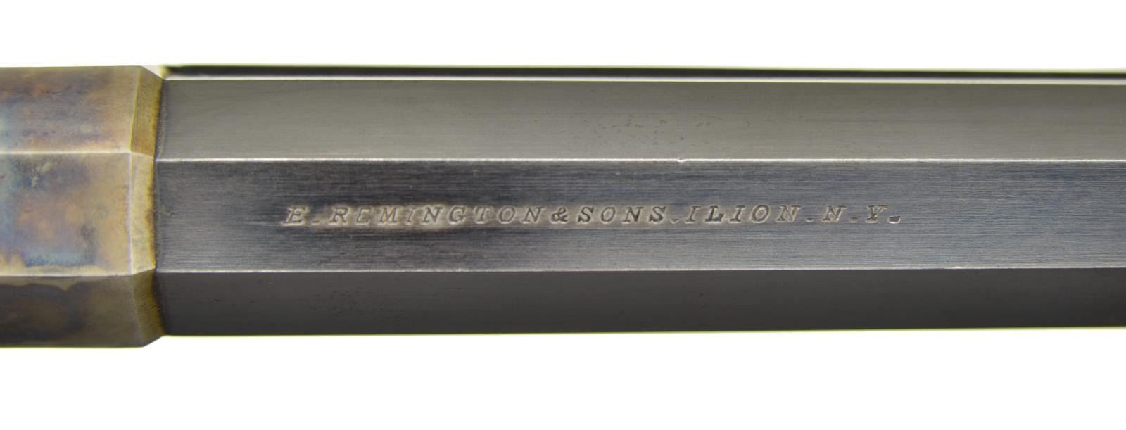 Cal. 32 RF. S# 13318. Bbl 28” octagon. Combination front sight w/ gold plated sight ring, elevator adj. V notch sporting rear sight & mid-range Vernier tang rear sight. Case colored small frame action w/ distinctive & curved profile to stock. Late production gun w/ patent markings on left side of action. Steel tipped forearm & perch belly style walnut stock w/ case colored crescent steel buttplate. Mfg. 1873 to approx. 1910. CONDITION: very fine. Bbl retains over 95% bright blue showing faint edge wear. The action retains over 90% lightly faded case colors. Original wood finish shows scattered marks & small dents. Bore is bright retaining strong rifling. (01-22291/DS). ANTIQUE. $2,000-4,000.