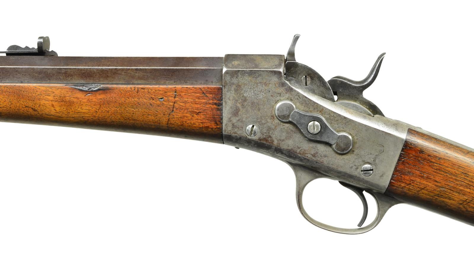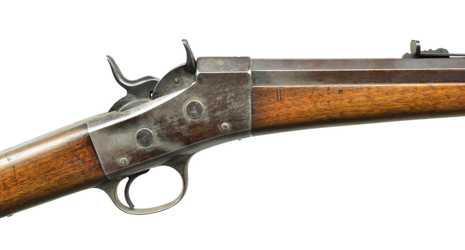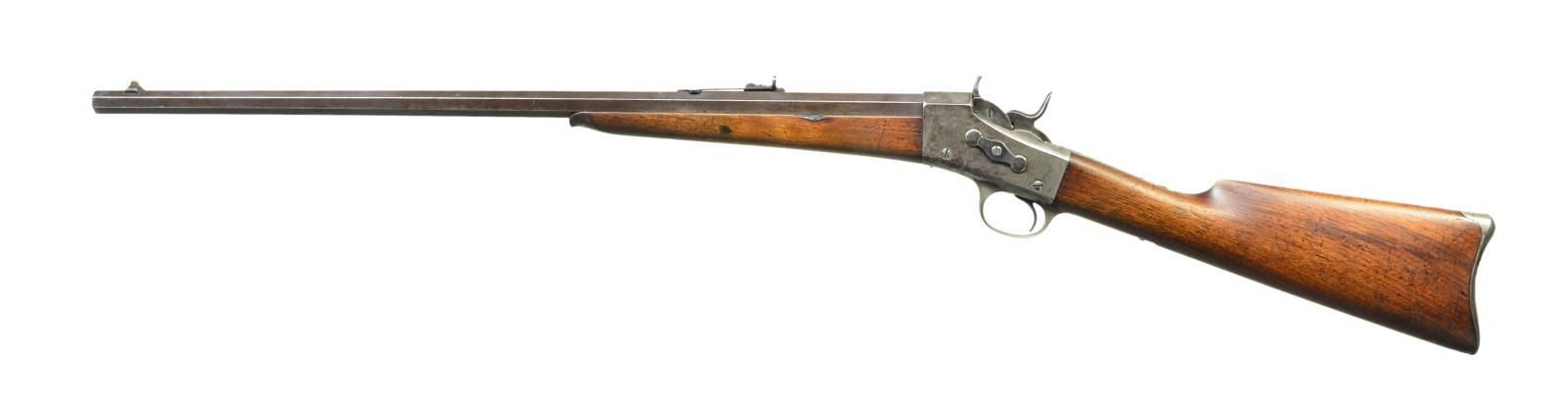 CAL. 22 LR. S# 2526 (mfg. 1888-1897). Tapered oct. 26" bbl. has been resleeved to 22 LR. Top flat has E Remington & Sons address. Dovetailed German silver blade front & elevator rear sights. Rolling block action w/ last patent dated of Sept. 9, 1873. Schnabel tipped walnut forearm & straight grip stock w/ curved buttplate. CONDITION: bbl. has faint traces of blue blending w/ brown gray patina showing impact marks, cleaned corrosion & wear along edges. Action & other metal parts are gray mixing w/ brown patina having faint traces of case colors in protected areas. Wood has fair worn appearance w/ gouges on forearm & around buttplate along w/ numerous light scratches & impressions. Breech face shows enlarged mortice at bottom of face of chamber. Bore is near excellent. (01-23325/MD). ANTIQUE. $700-1000.