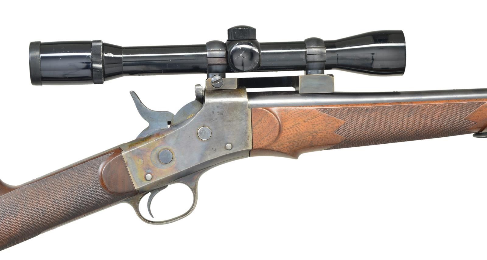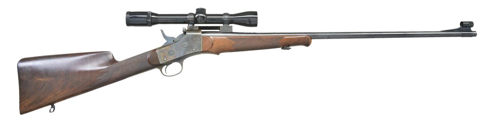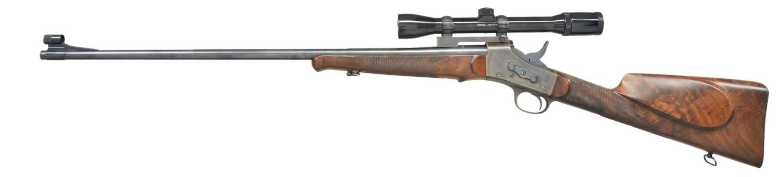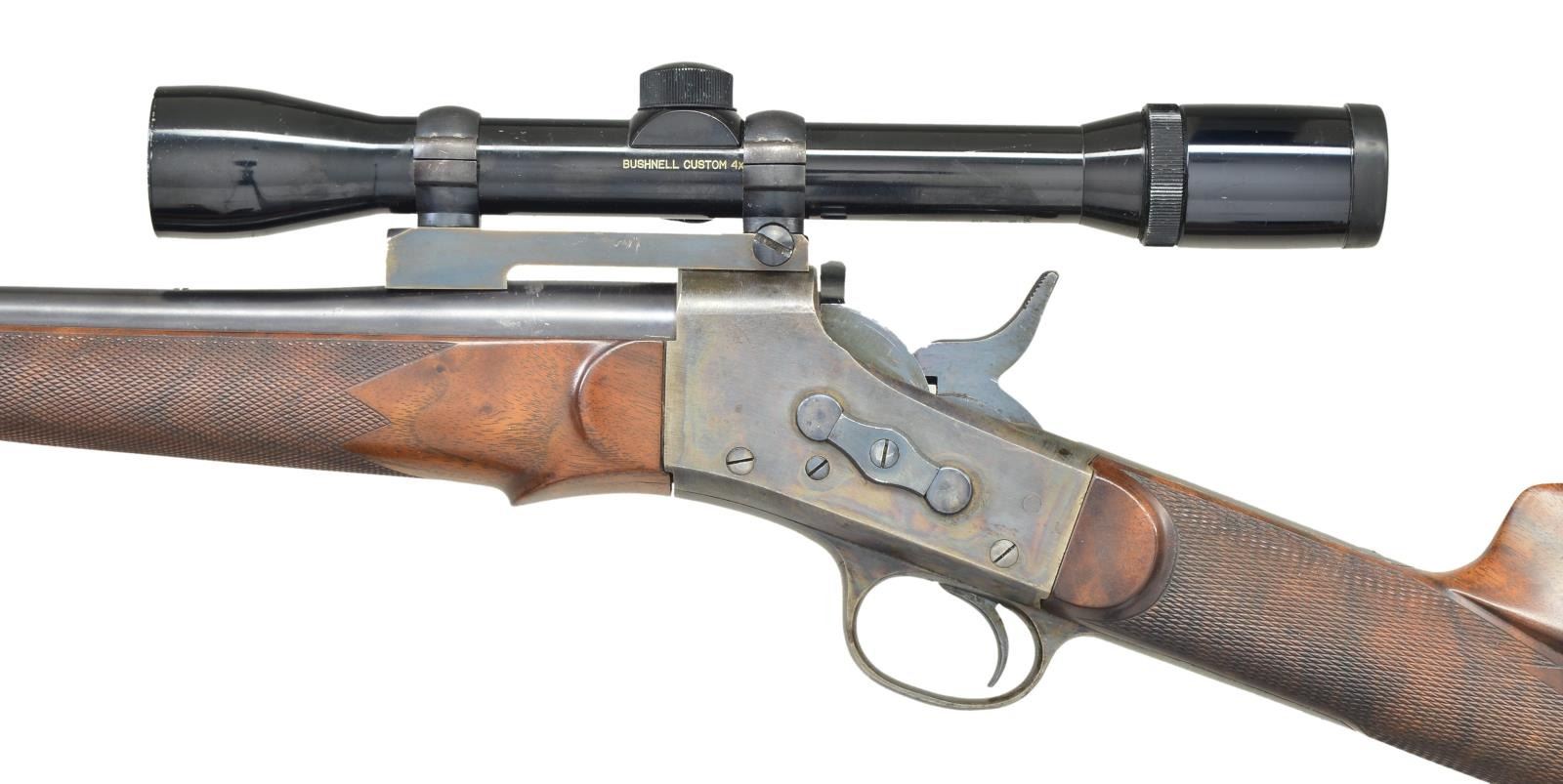 WITH SCOPE. Cal. 7x57. NSN. Based on a South American contract barrel and action, this rifle has 28" barrel marked "CAL. 7MM" on top and is fitted with "Redfield" front ramp with silver bead and sight protector. No rear sight is present and a custom Redfield type scope base is installed. Case hardened Remington rolling block action has factory name and address on top tang along with 1901 patent date. Good quality newly made stocks have been fashioned of crotch figured American walnut. Buttstock measures 13 5/8" over steel buttplate and has swept shadow line right hand cheekpiece. Point pattern checkering is at grip. Matching schnabled forend attaches to barrel by screw attached to sling loop. A matching loop is on toe line. Rifle is fitted with Bushnell "Custom" 4X scope with crosshair and post reticle in Redfield rings. CONDITION: fine. Barrel retaining nearly all of what appears to be its original blue. Action has nearly all of its case hardening color with some high edge wear. Secondary blued parts also show edge wear and some operational marks. Stocks retain nearly all of their original oil finish with some scattered marks. Bore is bright and shiny. Action is fine. Scope has marks in exterior lacquer, optically good. (23-582/MGM). MODERN. $1,500-2,500.