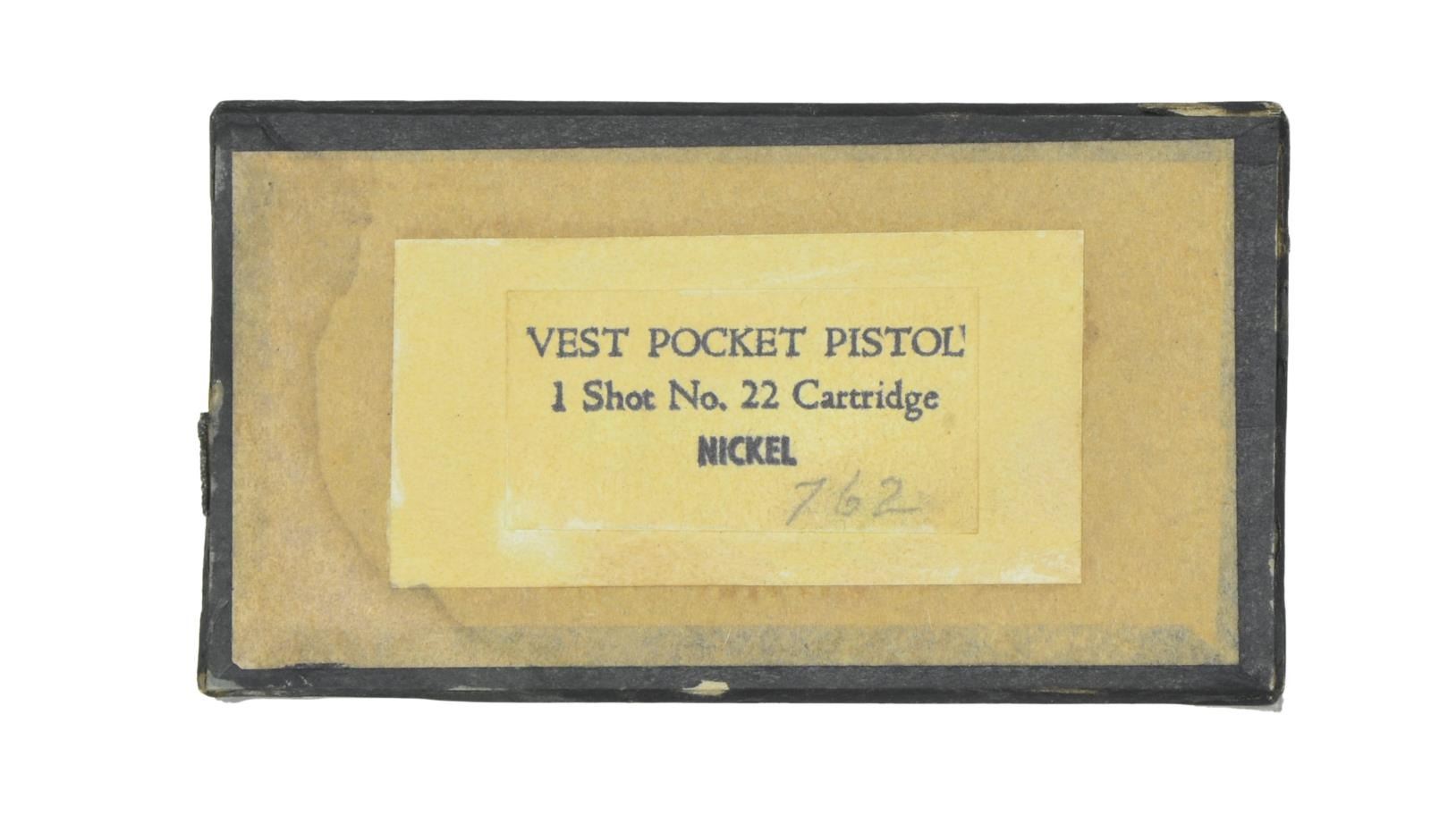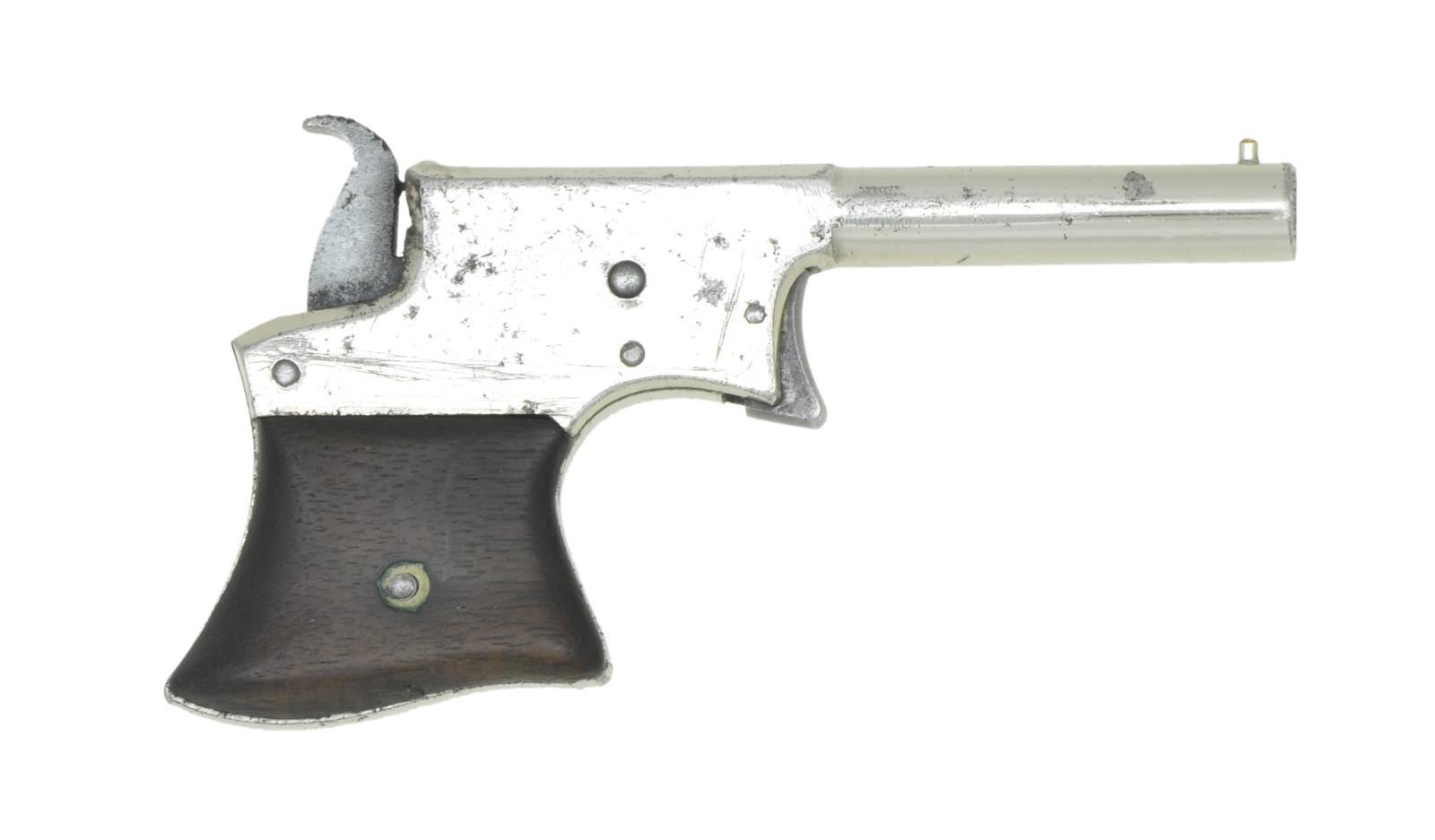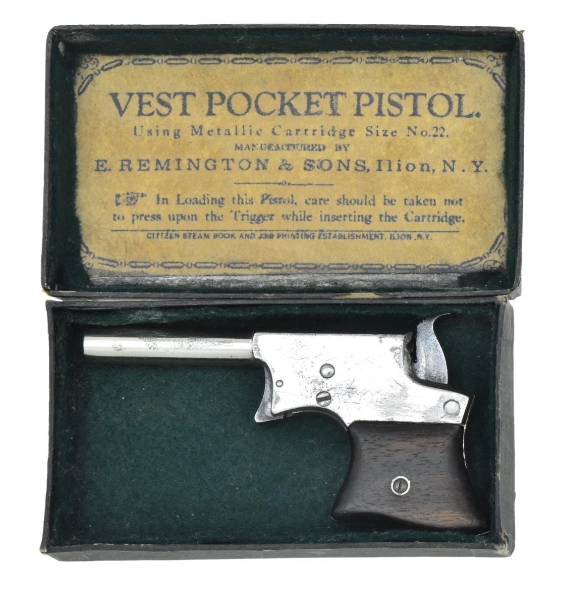 PISTOL. Cal. 22 RF. S# 762. Bbl. 3 1/4" round integral with frame. Bead front sight, rear sighting groove. Number one size single shot action, hammer doubles as breach block. Nickel finish. Two piece walnut grips. Left side of frame has partially legible hand scratched names. Estimated quantity of 17,000-20,000 mfg. 1865-1888. UNATTACHED ACCESSORIES: 2 piece box of unknown origin measuring 4 1/2” by 2 1/2” has added felt interior. Lid interior has “Vest Pocket” label that appears to be added. Bottom of box has “Vest Pocket Pistol” label with pencil marked serial number added over the top of a larger blank label. CONDITION: very good. Over 75% remaining nickel showing wear and light pitting with some deep scratches and marks. Grip shows light wear. Sound action. Dark pitted bore. (01-22101/DS). ANTIQUE. $1,200-1,500.