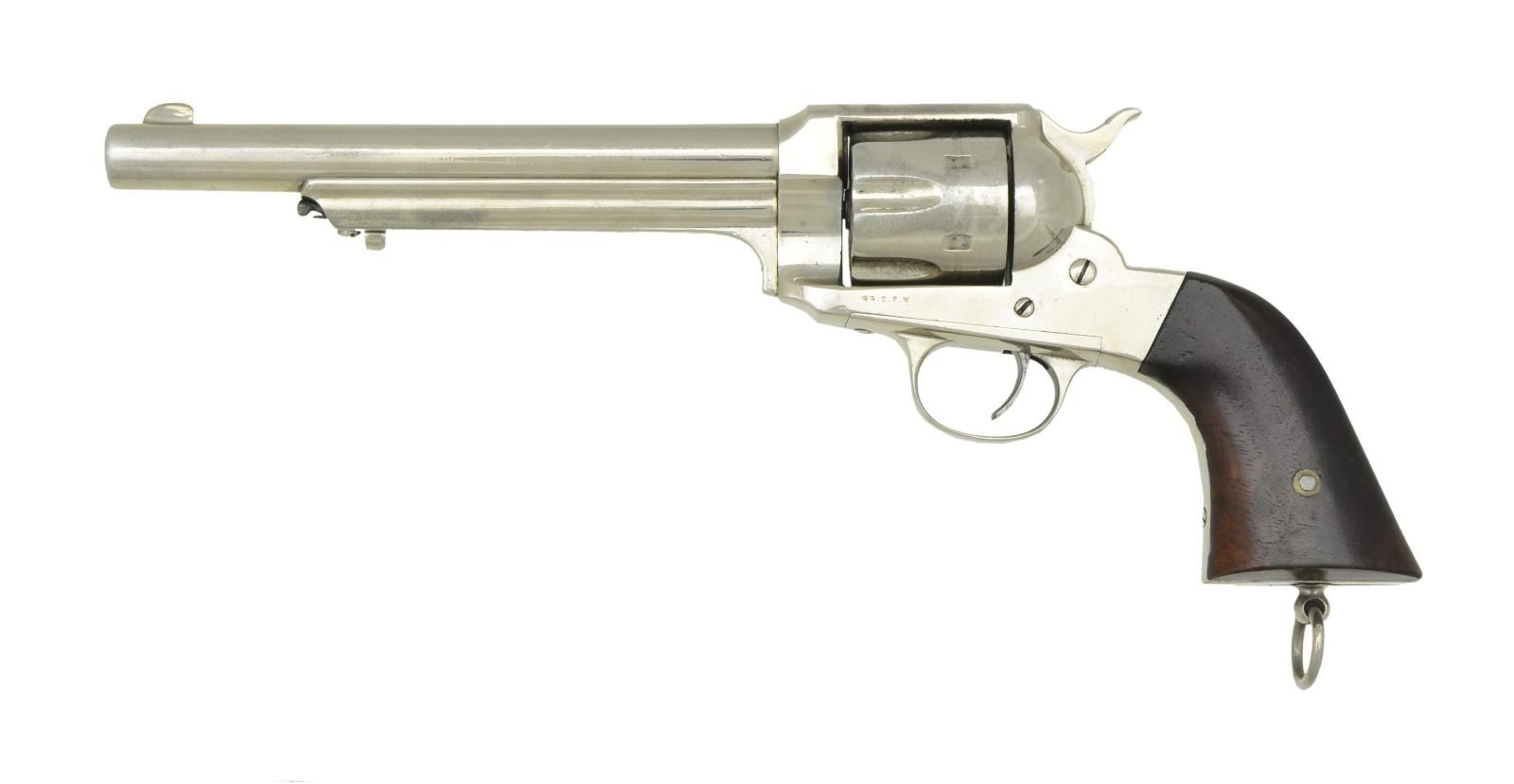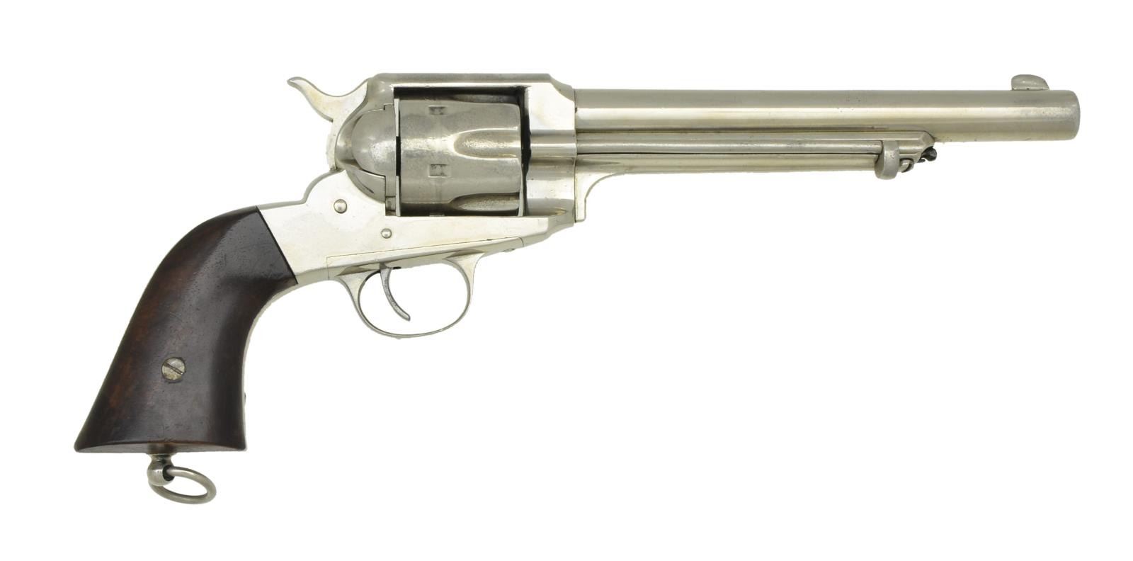 Cal. 44-40 (Marked 44.C.F.W on left side of frame). S# 941. Bbl. 7 1/2" w/ blade sight. Six shot cyl. Ejector housing lacks the model 1875 web. 2 piece walnut grips w/ lanyard ring at butt. Estimated quantity of 2020 mfg. 1891-1896. CONDITION: over 95% renickled finish showing remaining pitting. Refinished grips show scratches & handling marks. Lightly pitted bore retains intact rifling. (01-22988/DS). ANTIQUE. $1,500-2,000.