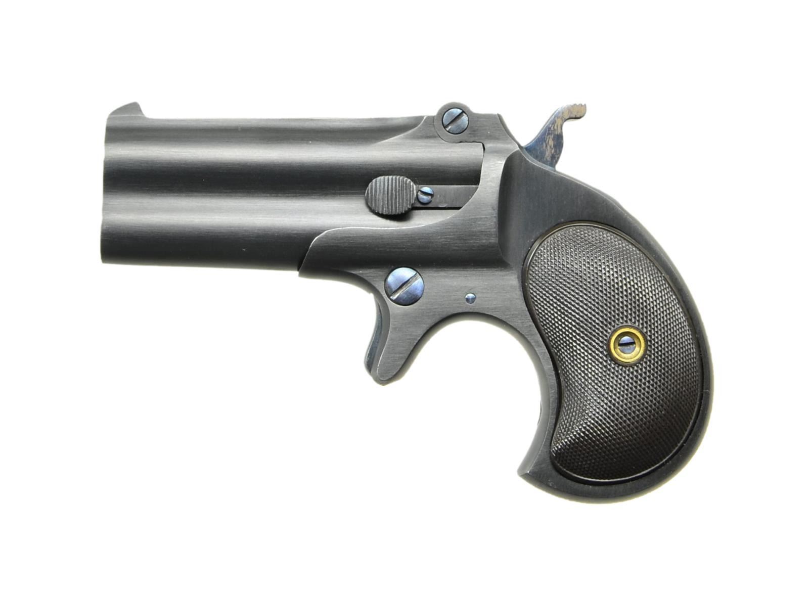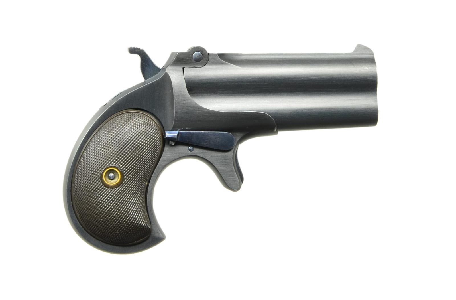 O/U DERRINGER. Cal. 41 Short RF. S# 76010. Bbl. 3" w/ 45mm address (lg. "O" in "CO.") & matching serial number prefixed by "L". Mfg. May 1935 (1929-1935; total O/U production 1867-1935) as 3rd UMC variation (500 units) having fluted appearance (no ribs) between bbls. Numbered L75XXX-L76XXX; last Model 95 variation produced. Blued w/ unpolished tone having Nitre blued screws, trigger, hammer & locking lever. Finely checkered black hard rubber grips. Star & arrowhead symbol stamped under locking lever plus "KD" date code on locking lug. CONDITION: top collector quality being near excellent in all respects; appears unfired w/ fine mechanics. (23-24/NW). CURIO. $650-900.