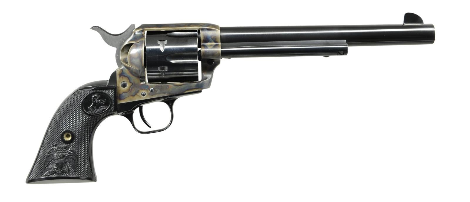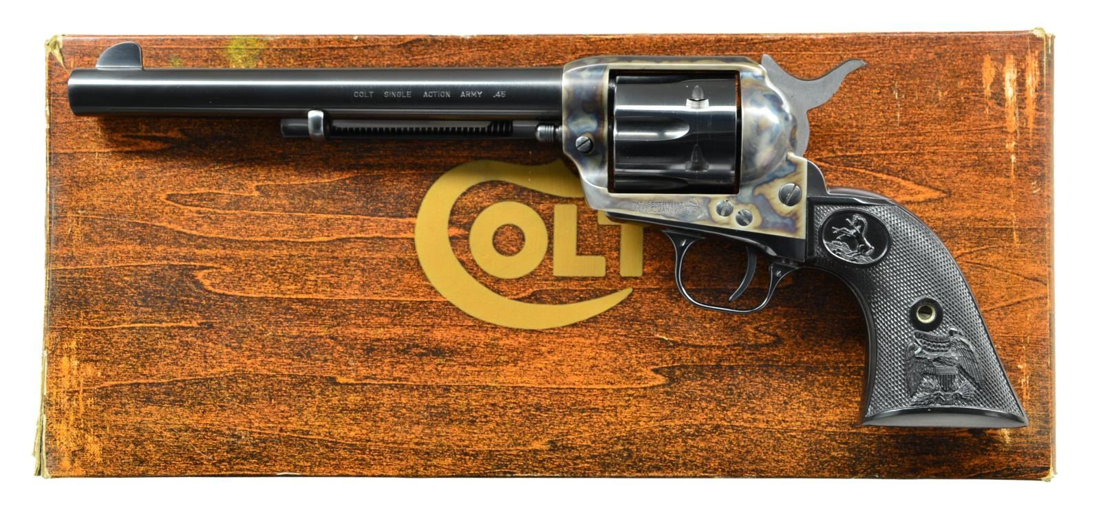 Cal. 45 Colt. S# 97191SA. Bbl. 7 1/2". Very fine 1978 mfg. revolver w/ fixed blade front & simple notch rear sights. Case colored w/ balance blued. Black checkered Rampant Colt & Eagle motif grips. UNATTACHED ACCESSORIES: factory cardboard woodgrain box S# to revolver w/ foam insert & paperwork. CONDITION: metal retains about 97% original finish w/ fine to light scratches on bottom of Bbl. w/ a few tiny scattered spots of rust. Cylinder has a faint dragline. Bore is near excellent, bright & strongly rifled. (23-370/CW). MODERN. $1,250-1,750.