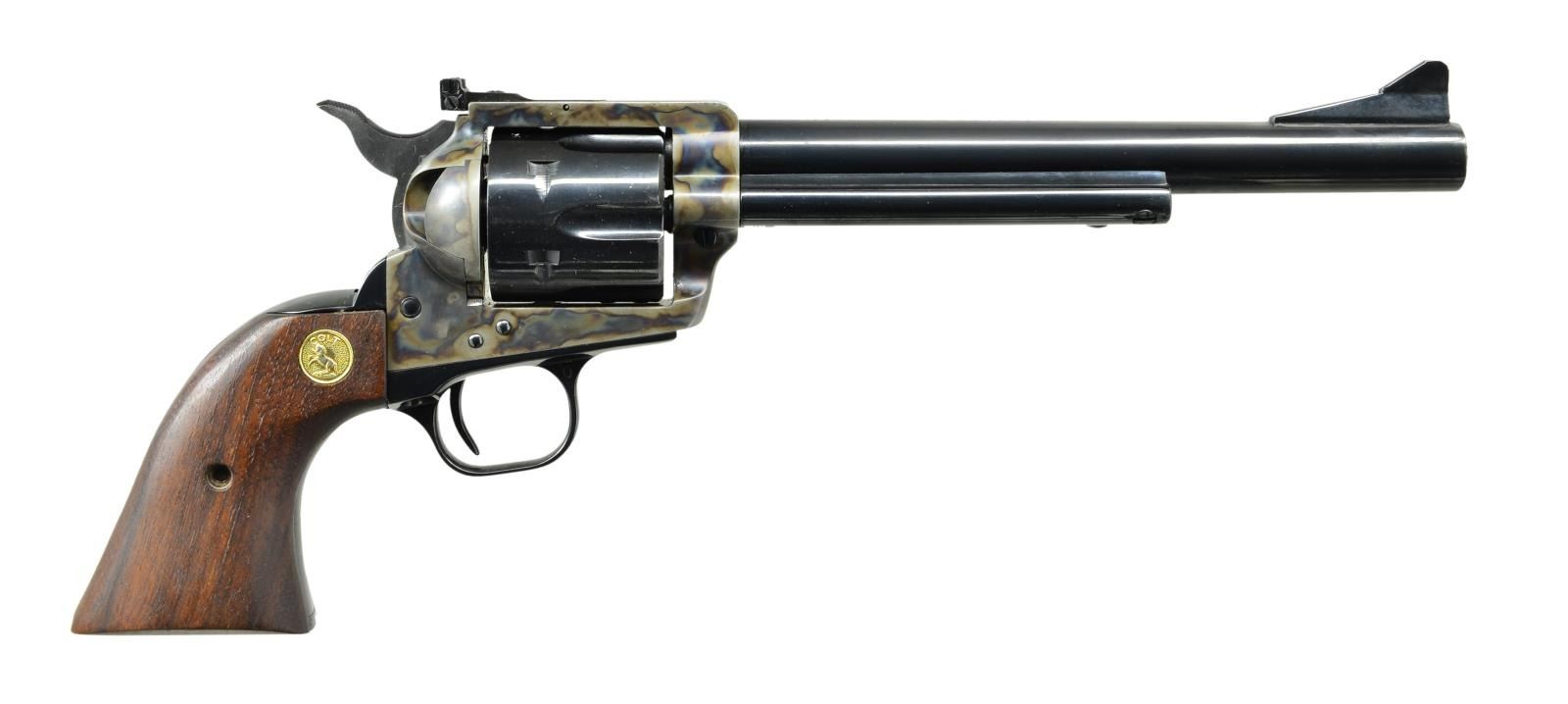 Cal. 45 Colt. S# 03651NF. Bbl. 7 1/2". 1st Year Mfg. 1978. Fixed ramp front & adjustable rear sights. Case colored frame, balance blued w/ smooth walnut grips & gold colored Colt medallions. UNATTACHED ACCESSORIES: Colt factory box S# to revolver. Sticker indicates spare cylinder, but no there is no extra cylinder included. CONDITION: metal retains about 95% original finish. Grips show light use w/ minor handling marks. Bore is very good, bright & strongly rifled. (22-6352/CW). MODERN. $1,250-1,750.