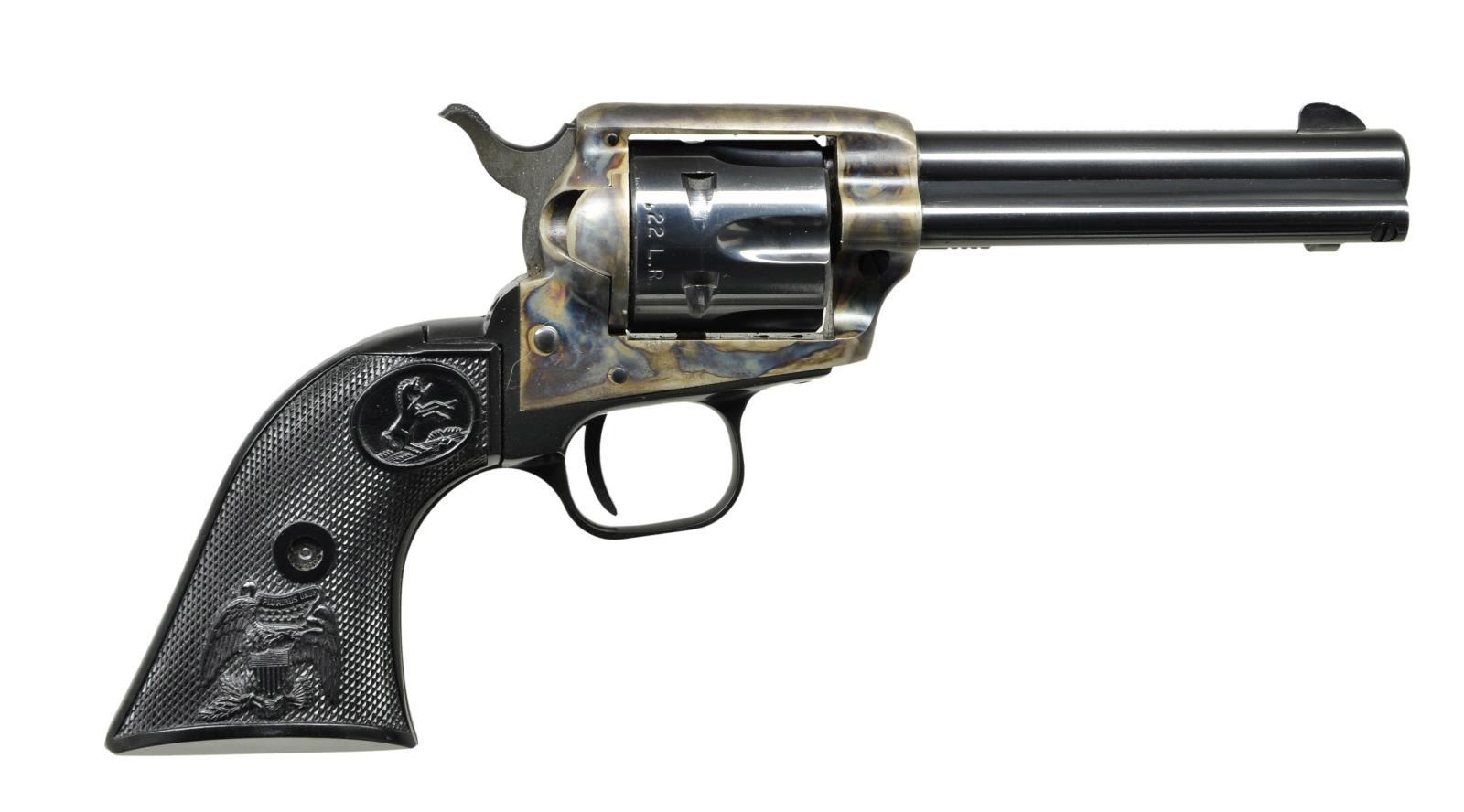 Cal. 22 LR. S# L03705. Bbl. 4.5". Mfg.1974. 6 Shot fluted cylinder. Blued cylinder & barrel w/ case colored frame. Blade front sight w/ rear notch sight. Black plastic checkered grips w/ Colt logo at top. UNATTACHED ACCESSORIES: spare non fluted cylinder chambered in .22 Magnum. CONDITION: bluing is complete & consistent w/ very little thinning at high spots at muzzle. Very fine drag line on cylinder. Timing appears to be correct. Bright bore w/ strong rifling. Grips don't illustrate any visible wear. (22-5513/JZ). MODERN. $500-900.