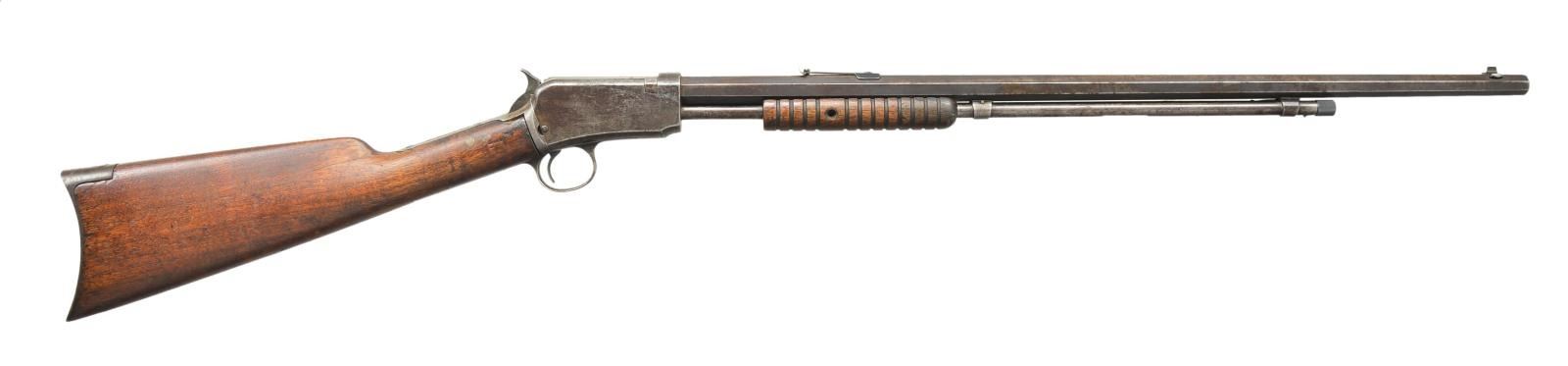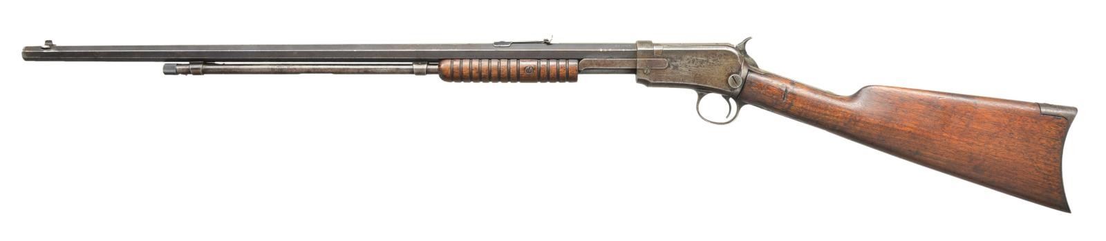 Cal. 22 WRF. S# 432383 A. Bbl. 24" octagon. Bead front sight with model 1890 rear sight. Tubular mag. Small round grooved forearm with straight grip walnut stock having crescent steel buttplate. 1911 mfg. CONDITION: metal finish is fading to mottled brown showing scattered corrosion and small handling marks. Forearm shows wear and handling marks, right screw is missing. Stock shows heavy wear with crack through wrist and plug type repairs. Good mechanics dark bore retains intact rifling. (21-4102/DS). CURIO. $300-500.