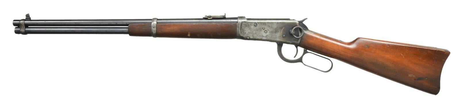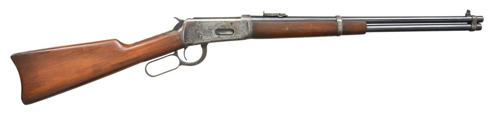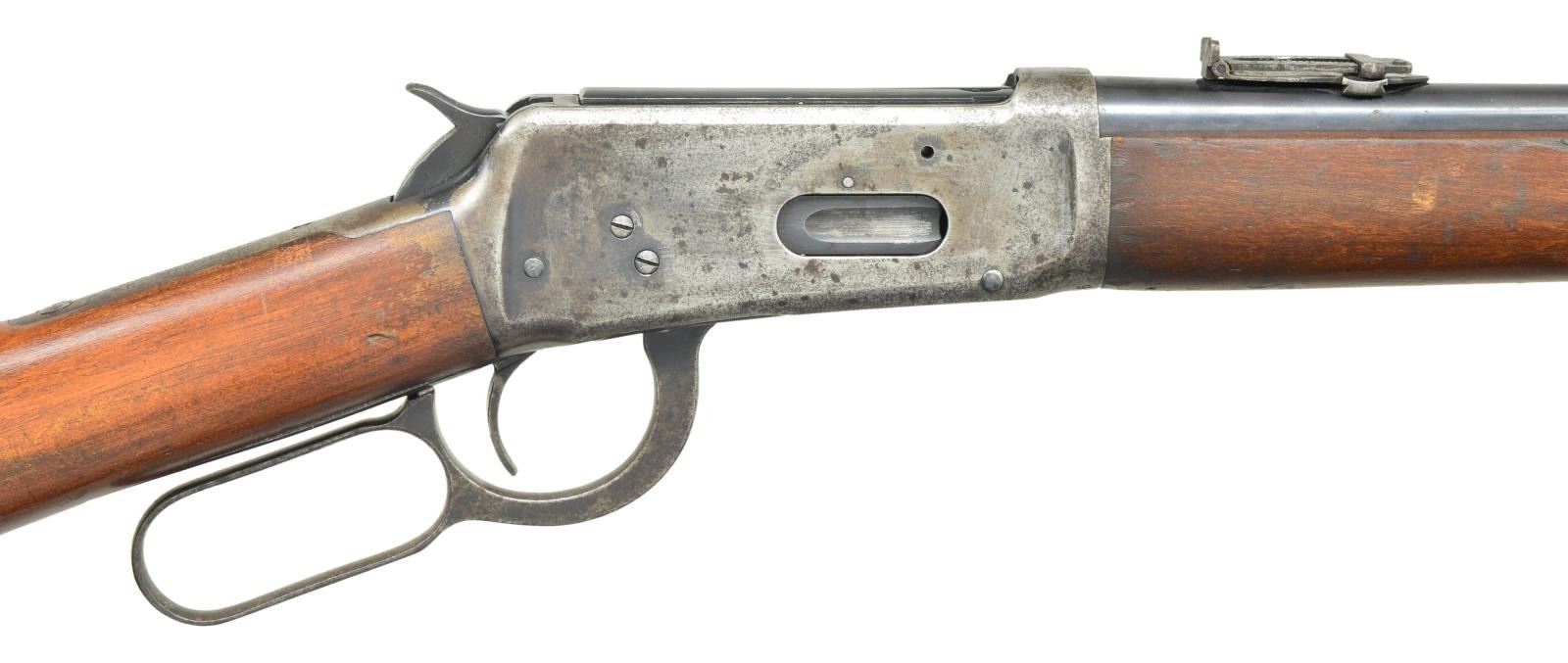 Cal. 32 WS. S# 921120. Bbl. 20” with pinned blade front and carbine leaf rear sight. Full length mag. Gum wood forend and stock with steel carbine butt. Mfg. 1923. CONDITION: 70% barrel and mag. blue. Action has faded to gray with scattered pitting. Original wood finish shows dents and marks. Bore shows scattered pitting. (21-4088/DS). CURIO. $700-1000.
