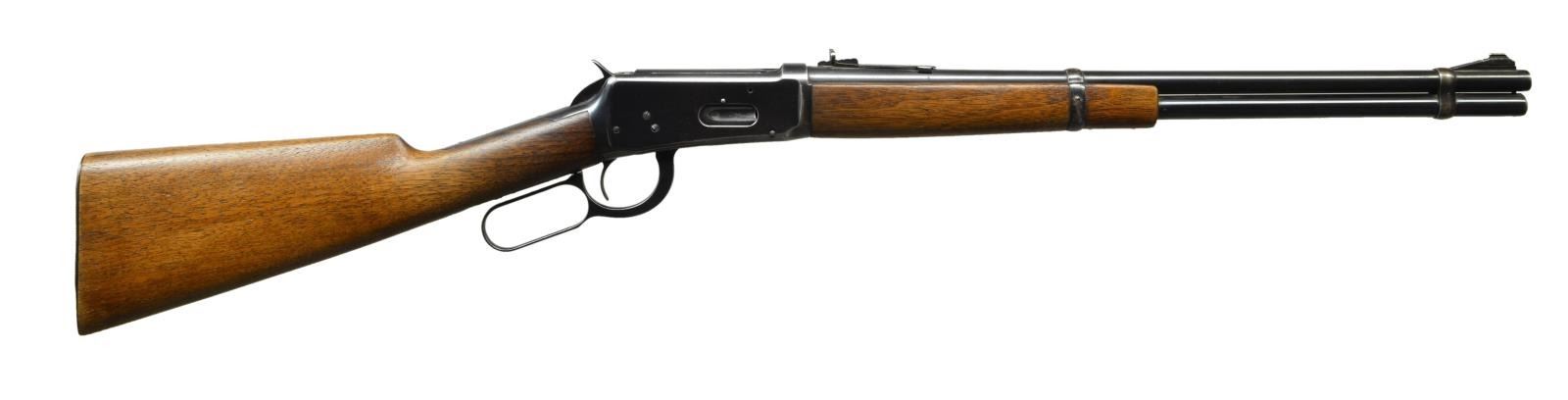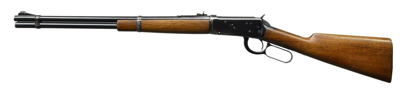 Cal. 30 WCF. S# 1313714. Bbl. 20” with ramp mounted bead front and sporting rear sights. Long wood forend with walnut stock having grooved steel buttplate. WWII era mfg. CONDITION: 80% lightly worn blue showing carry wear. Wood has worn finish showing scratches and marks. Bore retains sound rifling with darkened lands. (21- 4065/DS). CURIO. $400- 550.