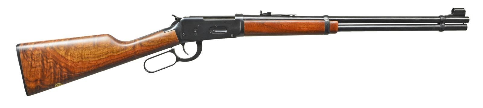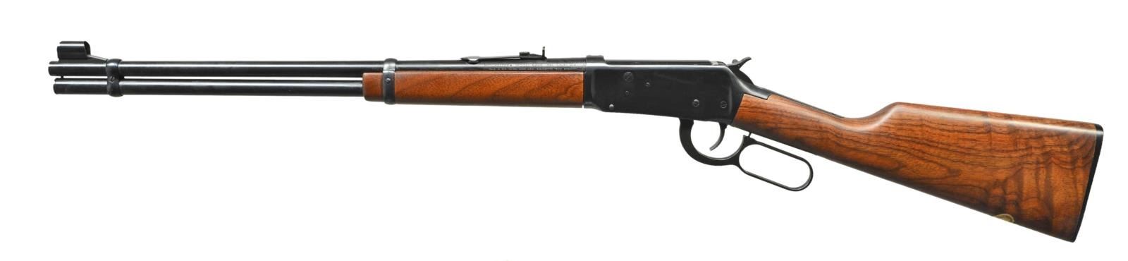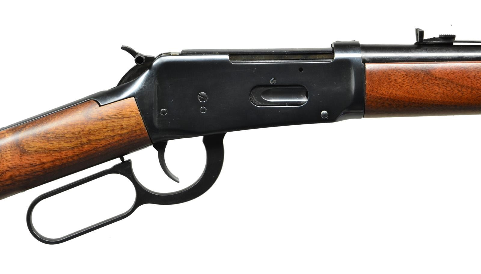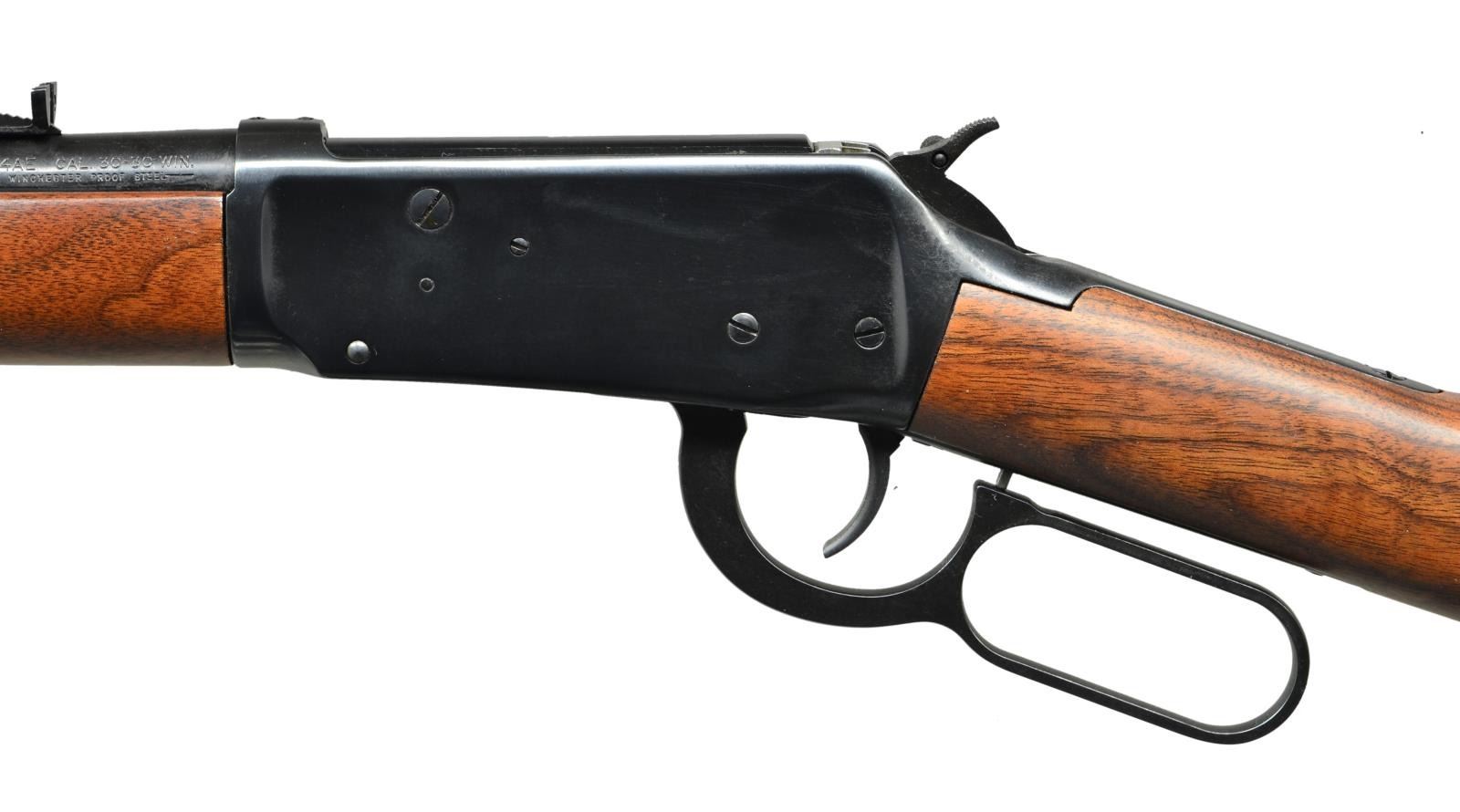 Cal. 30-30. S# 5554013. Bbl. 20" having hooded ramped silver bead front sight and elevator adjustable rear w/ white diamond. Mfg. 1989 with uncheckered satin finished walnut stock set having notable figure in butt and still retains walnut advertising sticker on toe line. Blued angle eject model factory drilled and tapped for scope mount, offset hammer extension & w/ out crossbolt safety (rebounding hammer). CONDITION: all aspects near excellent including bore; new appearance. (22-5501/NW). MODERN. $400-600.