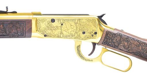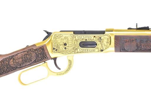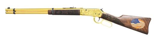 COMMEMORATIVE LEVER ACTION RIFLE. Cal. 30-30. S# ALF1500490. Bbl. 20". Full brilliant gold anodized finish. Action has special American theme engraving featuring bald eagle on left side between banners stating "UNITED STATES" & "IN GOD WE TRUST". Banners on right side state "ONE NATION" & "UNDER GOD". Satin finished walnut forearm & stock have ornate laser engraving. Left side of forearm states "MONTANA / PROOF" & right side state "GOD BLESS AMERICA". Wrist of stock has farming scene on right & Pony Express rider on left. Left side of stock has striking American flag wood mosaic inlay. Limited edition offered by American Legacy Firearms of Fort Collins, CO. UNATTACHED ACCESSORIES: original box w/ instruction papers, trigger lock & felt gun sleeve. CONDITION: near new in box. (22-4594/DS). MODERN. $1,000-1,500.