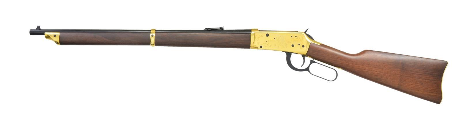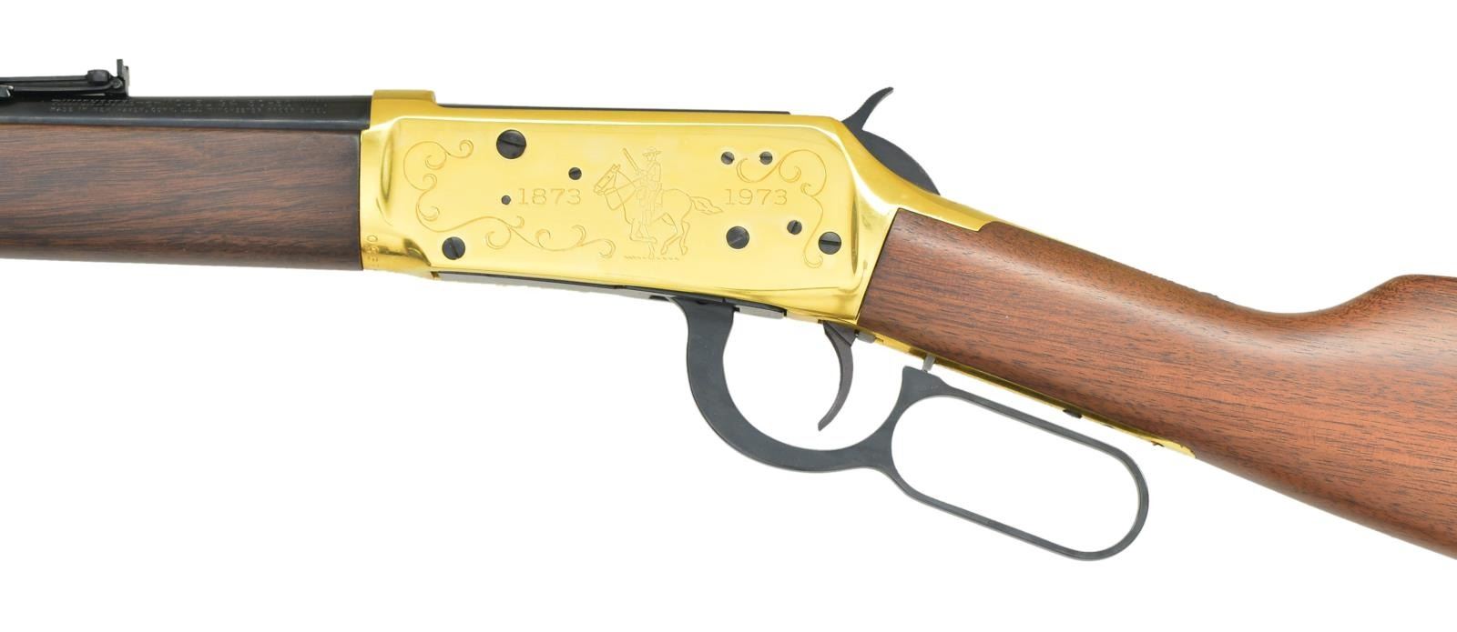 COMMENORATIVE LEVER ACTION MUSKET. Cal. 30-30. S# RCMP8950. Bbl. 22" w/ blade front sight & graduated leaf rear sight. Left side of bbl. has gold marking “R.C.M.P. CENTENNIAL 1873-1973”. Gold anodized receiver & fittings. Right side of action marked “MP” while left side has Mountie on horseback w/ between 1873 & 1973 dates. Markings are bordered by scroll highlights. Musket length walnut forearm. Straight grip stock. Right side of stock has gold anodized commemorative medallion w/ “MP” marking near buttplate. Mfg. 1973. UNATTACHED ACCESSORIES: foam box w/ matching label containing saddle ring, instructions, warranty, paper & hunter’s pocket guide. Decorative box cover is tattered w/ tears at both ends. CONDITION: as new w/ box. (22-5503/DS). CURIO. $500-800.