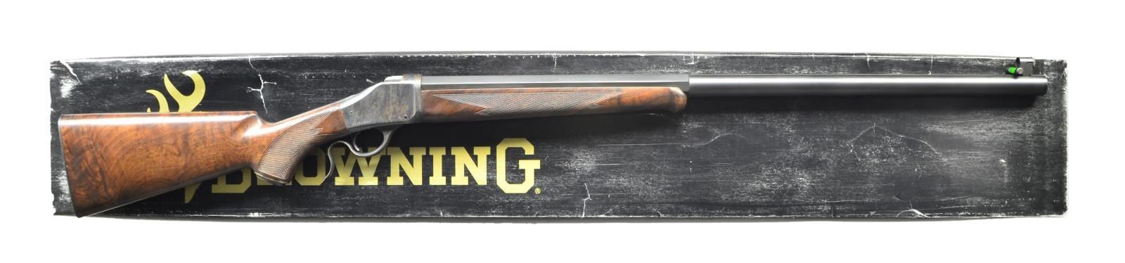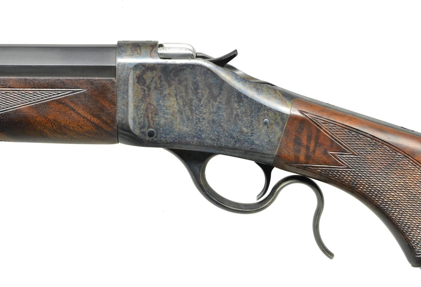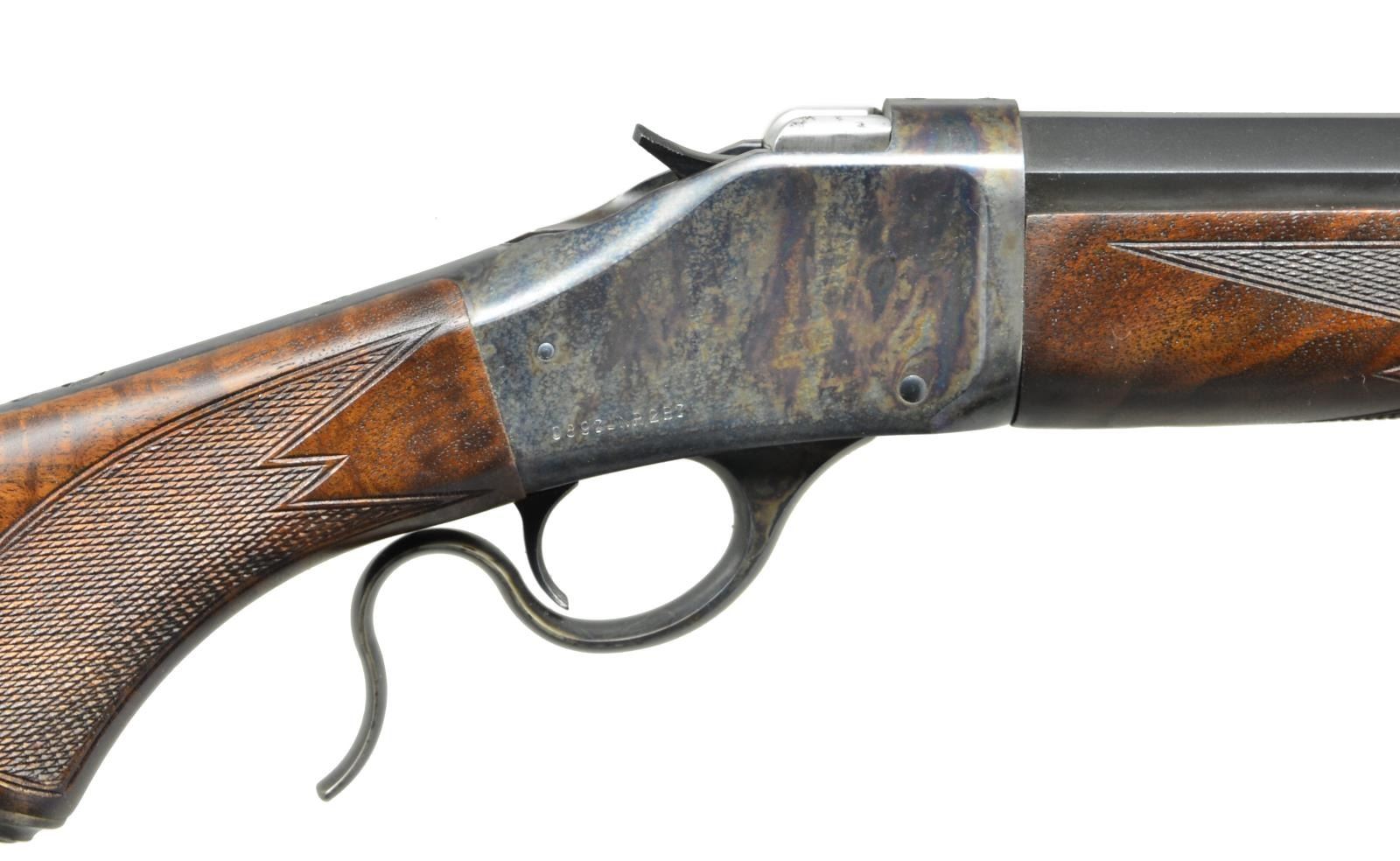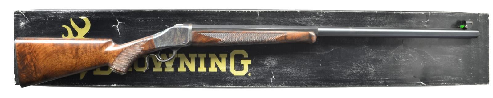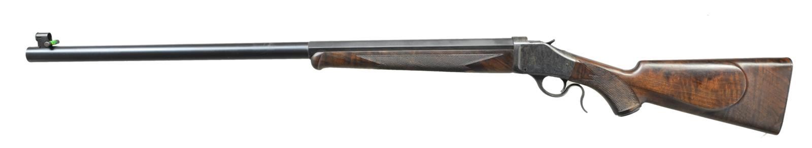 SINGLE SHOT RIFLE. Cal. 40-65. S# 08971NR2B7. Bbl. 30" half octagon heavy weight measuring 15/16" at muzzle with spirit level globe front sight. Matte black finished barrel. Case colored single shot action. Top tang has 2 open screw holes for sight attachment, no sight included. Schnabel tipped forearm and steel capped pistol grip stock of satin finish fancy walnut cut checkering. LOP to checkered steel buttplate: 13 3/4". Weight: 11 lbs., 2.4 oz. Mfg. in Japan 1996-2001. UNATTACHED ACCESSORIES: original box containing hang tag. CONDITION: near excellent. Breechblock and buttplate show small spots of corrosion. Bright bore shows scattered dark spots of corrosion. (22-6185/DS). MODERN. $1,200-1,800.
