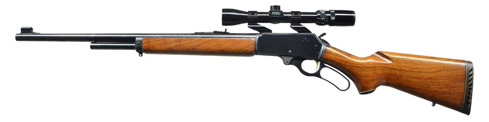 Cal. 444 Marlin. S# 22086383. Bbl. 22". Mfg. 1978. Blued finish. Hooded front blade w/ elevation adjustable rear sight. Hardwood forend & stock w/ white spacer & black end cap on pistol grip. Rubber recoil pad in place of butt plate. Gold colored trigger. Micro groove rifling. Drilled & tapped receiver currently hosting O/U rings & Bushnell 3-9x Banner scope w/ duplex reticle. Checkered thumb extension on hammer. CONDITION: finish is complete & consistent. Wood demonstrates use in gentle finish thinning w/ a few small impressions. Scope glass is clear w/ sharp reticle. Bright bore w/ strong rifling. (23-532/JZ). MODERN. $500-700.