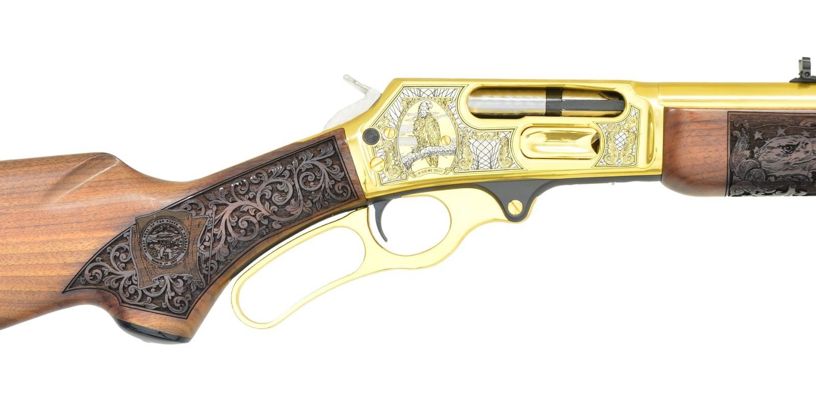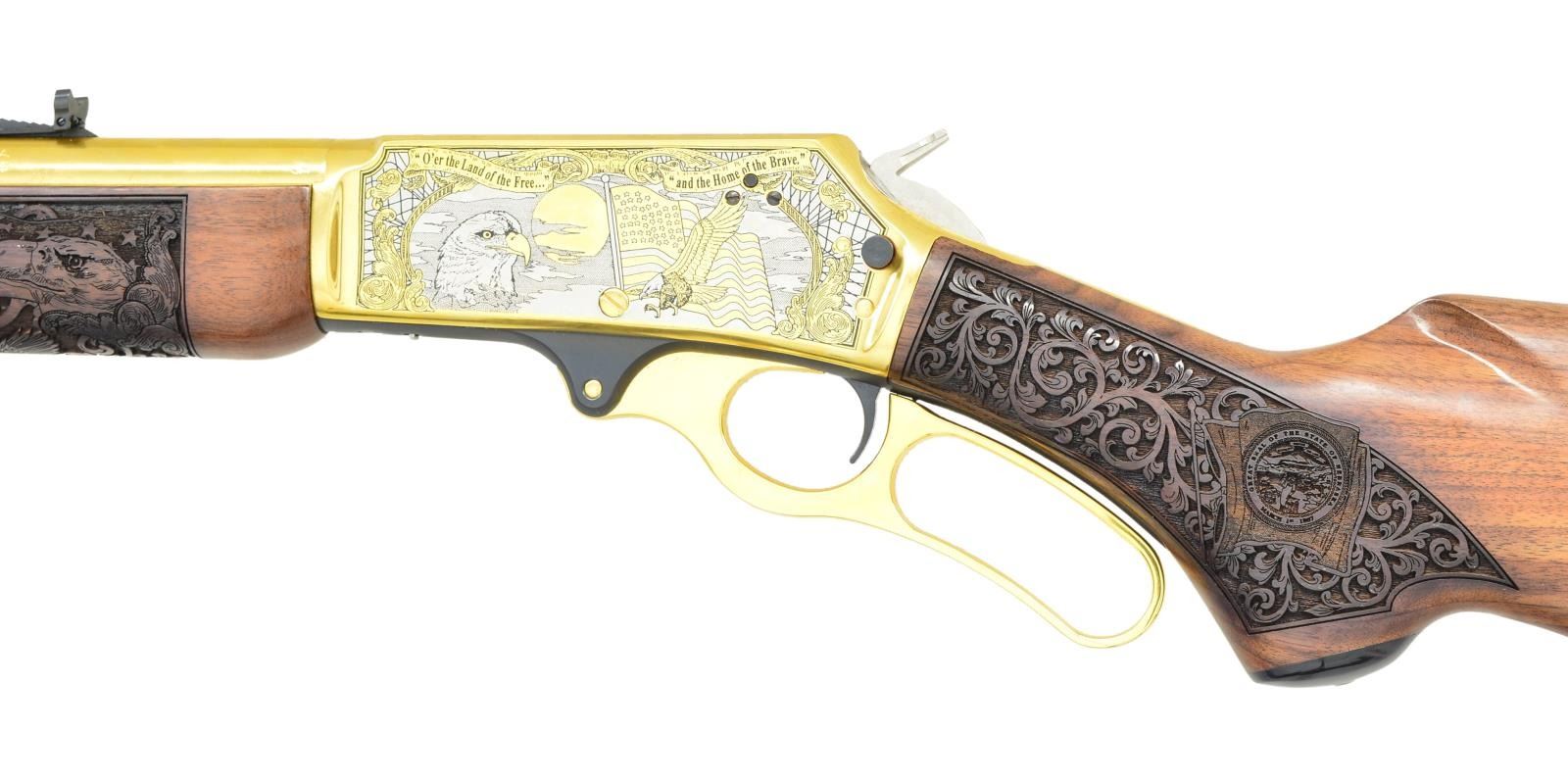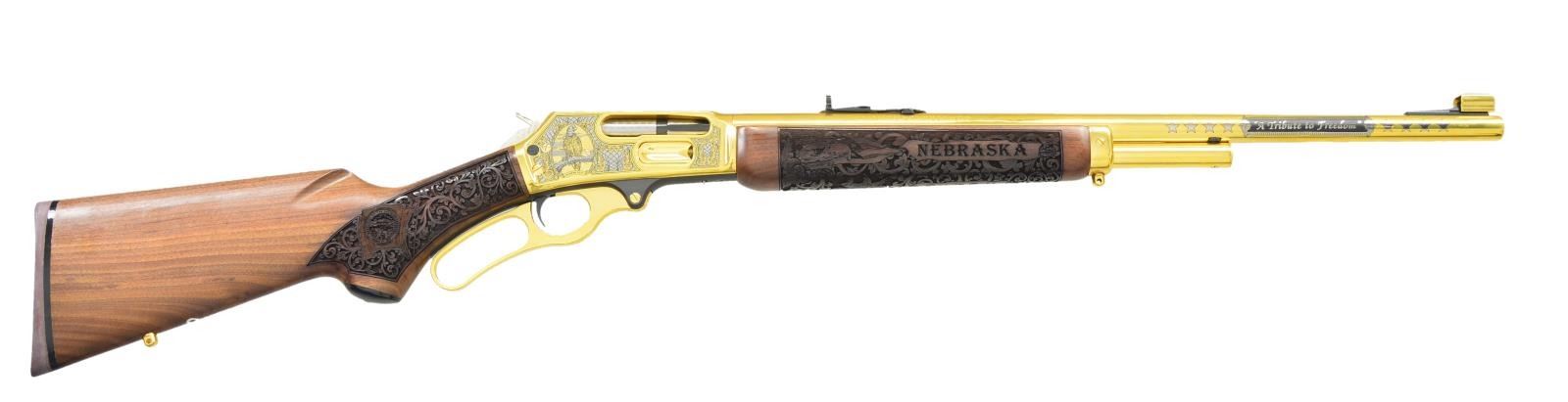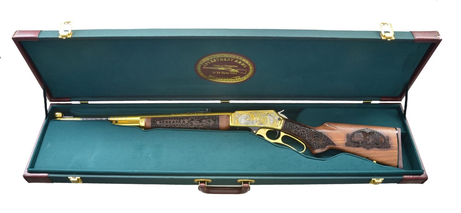 RIFLE. Cal. 45-70. S# 00013977. Bbl. 22". Hooded ramp fixed & elevation adjustable rear buckhorn sights. Jeweled bolt, gold plated metal & deep relief laser carved forend & pistol grip buttstock w/ cap, sling swivel studs & factory recoil pad. Work done by Investment Arms Unique Firearms in 24 Karat Gold. Theme are eagles & freedom. On Bbl. “The American Bald Eagle” & “A Tribute to Freedom”. Atop the frame “Nebraska 3 of 10”. Sides of frame w/ Eagle profile “O’er the land of the free and the home of the brave” w/ billowing flag. Right side eagle perched on a branch “ In God we Trust”. Stock set features more eagles, extensive floral design, state seal of Nebraska & left side butt two more eagles surrounded by a floral banner. UNATTACHED ACCESSORIES: Fitted hinged case w/ brass latches, leather trim & green felt interior. Marlin owners manual, lock, keys to the case & care & cleaning information from Investment Arms. CONDITION: metal shows a few light handling marks. Stock set has a couple of minor to light marks & bruises. Bore is very good, strongly rifled w/ stubborn firing residue throughout. (23-494/CW). MODERN. $1,500-2,250.