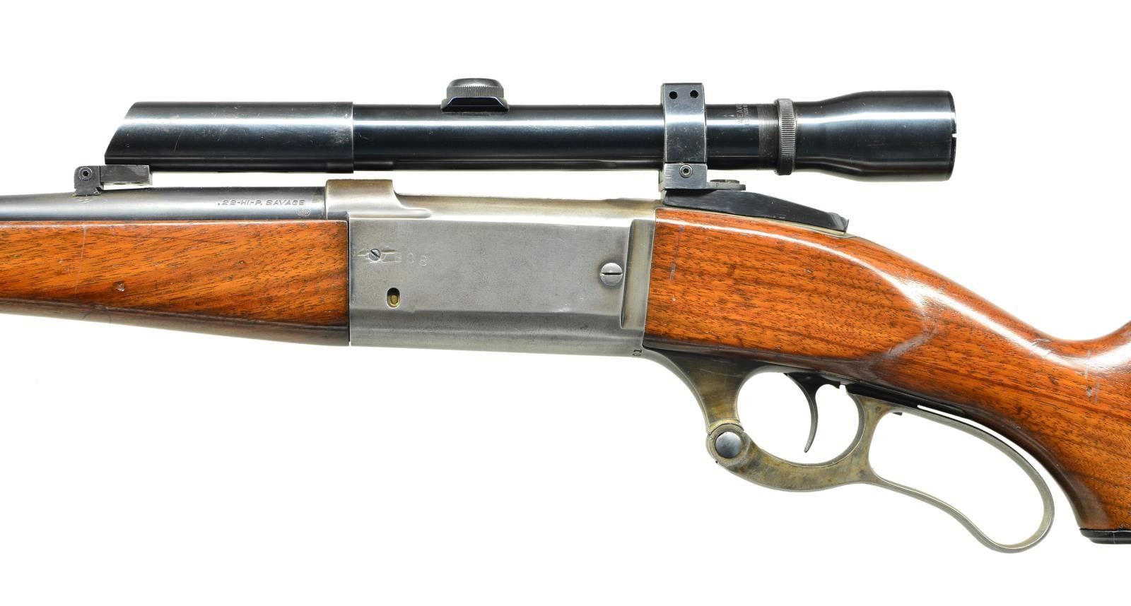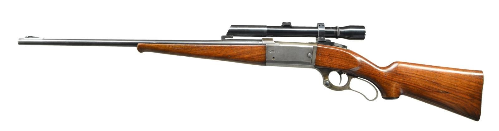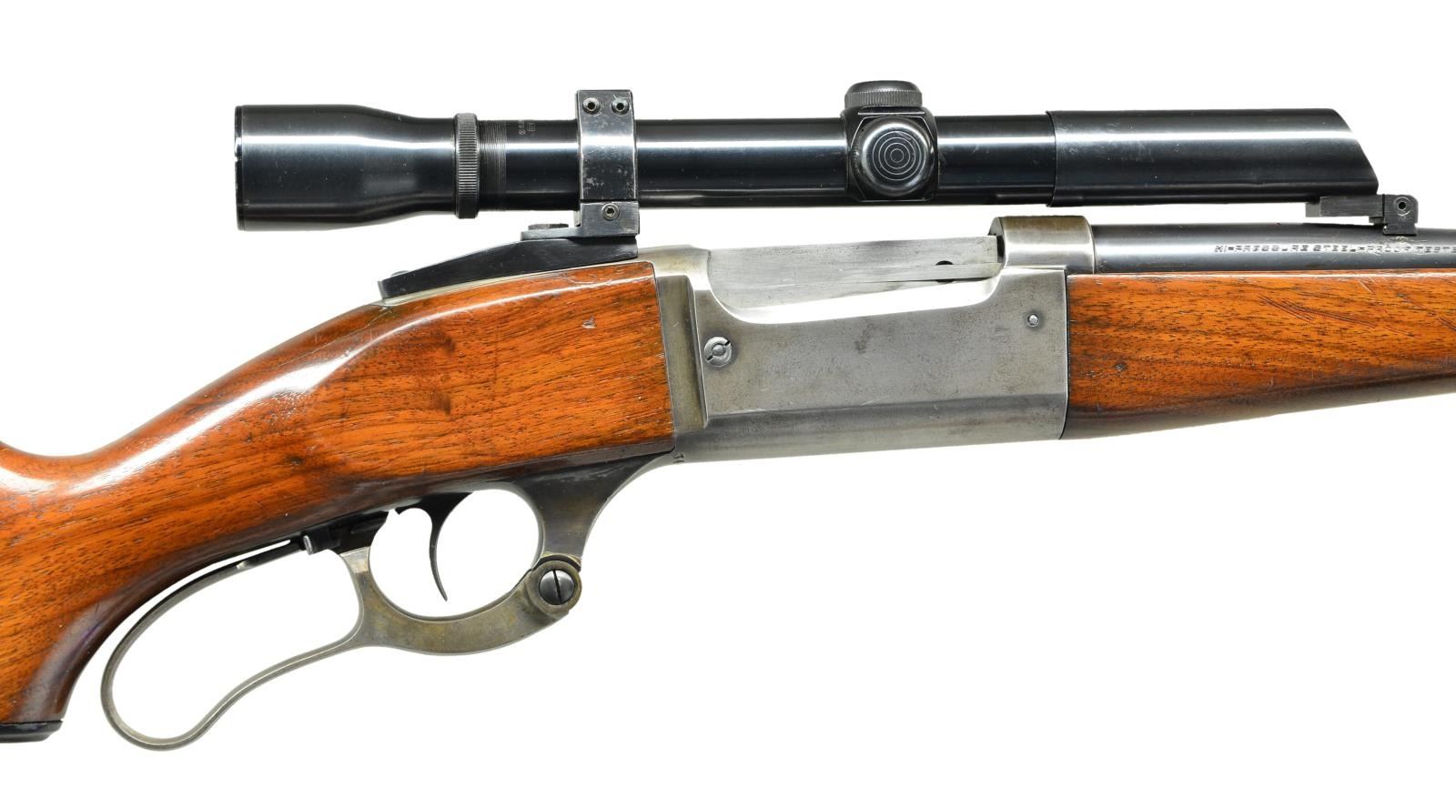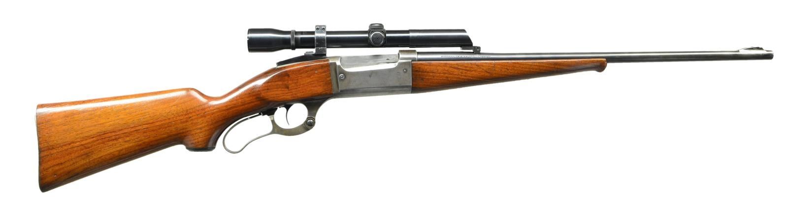 Cal. 22 Hi Power. S#. 347201. Bbl. 22" round. Filler in front dovetail. Weaver K3 60 x 20 gloss finished scope w/ standard crosshairs. Stith mounts. Action features include brass rotary mag., left side cartridge counter, bent tab safety & case colored lever. Schnabel tipped forend & capped pistol grip stock w/ grooved steel buttplate. Solid frame rifles are scarce in 22 HI Power, most were takedown configuration.1935 mfg. CONDITION: 70% faded bbl. blue. Action is fading to gray. Sanded and refinished wood shows some deep marks. Bright near excellent bore. (23-441/DS). CURIO. $1000-1400.