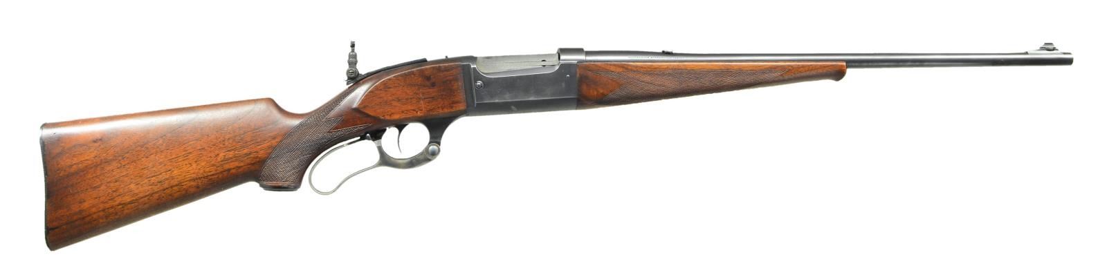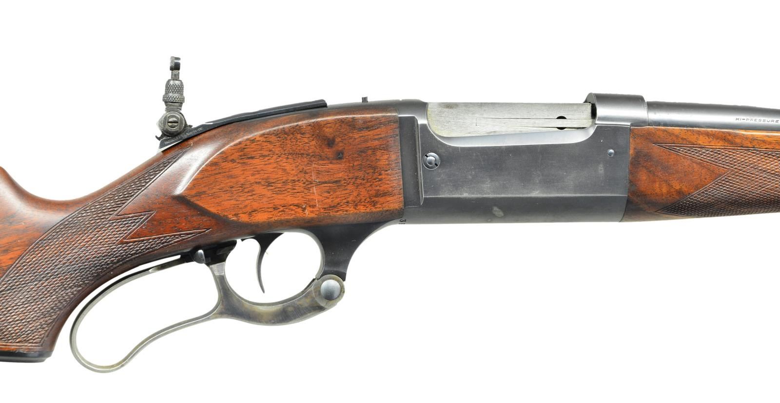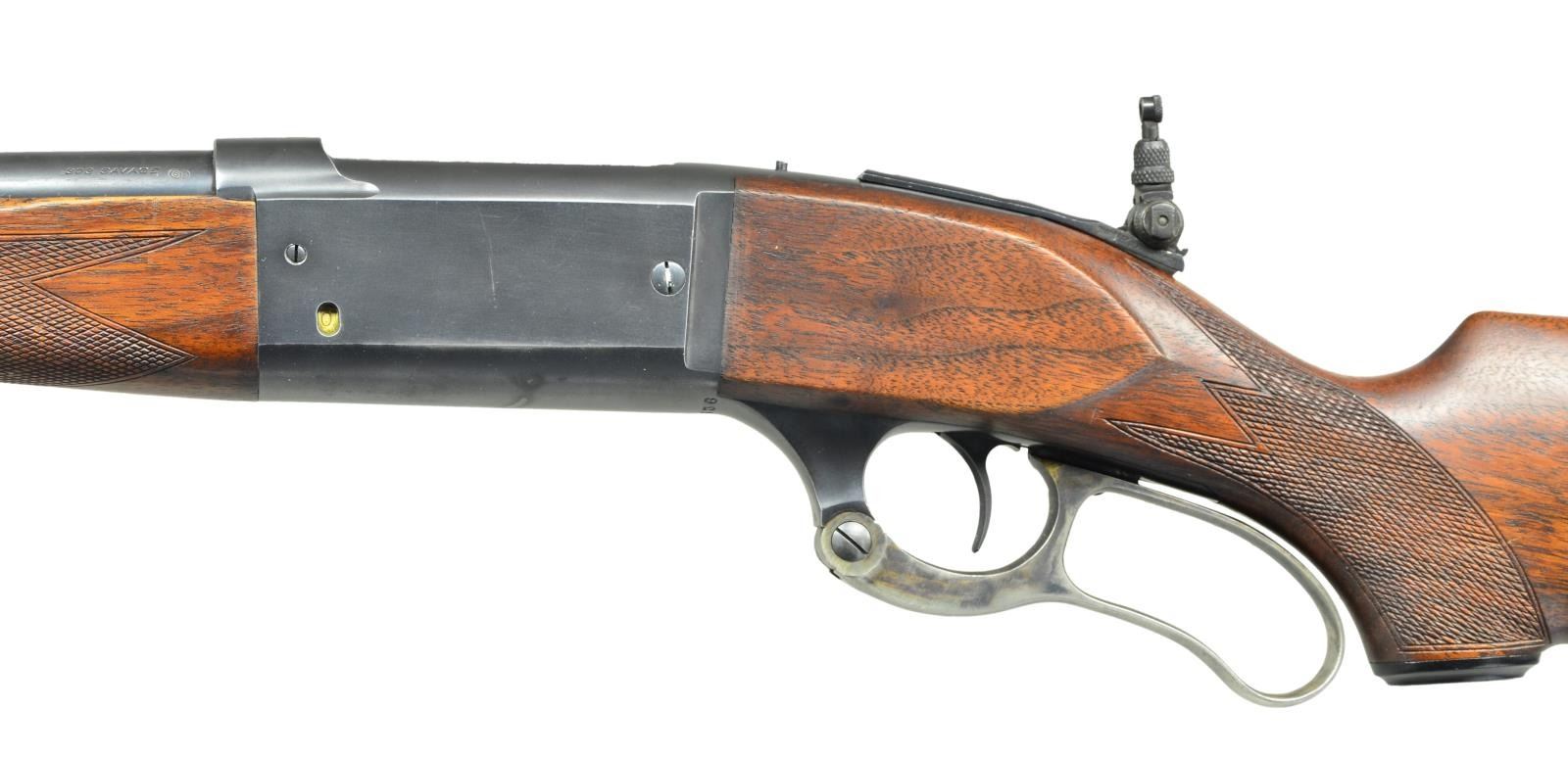 Cal. 303 Savage. S#. 361536. Bbl. 22" round. Ramp mounted Lyman front sight, filler in rear dovetail w/ Marbles flexible joint tang sight. Action features include, brass rotary mag, left cartridge counter, bent tab safety & case colored lever. Schnabel tipped forend & capped pistol grip walnut w/ grooved steel buttplate. Added non factory checkering. 1937 mfg. CONDITION: over 80% lightly faded blue shows carry wear. Lightly worn original wood finish. Bright near excellent bore. (23-443/DS). CURIO. $700-1000.