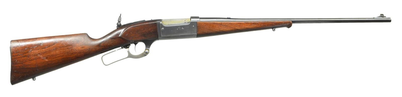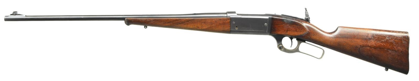Cal. 300 Savage. S#. 343613. Bbl. 24" round. Ramp mounted Marbles Sheard front sight, filler in rear dovetail with Marbles flexible joint tang sight. Action features include, brass rotary mag, left side cartridge counter, bent tab safety & case colored lever. Schnabel tipped forend & straight grip walnut stock w/ grooved steel buttplate. 1933 mfg. CONDITION: over 70% lightly faded blue. Wood finish shows wear spots with scratches & marks. Bright near excellent bore. (23-444/DS). CURIO. $700-1000.