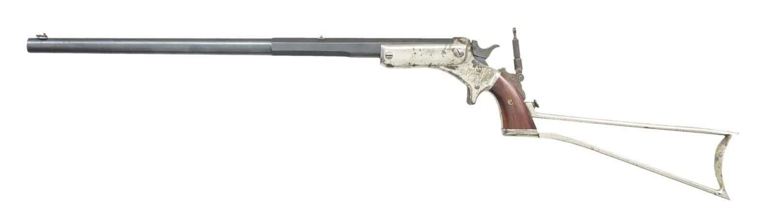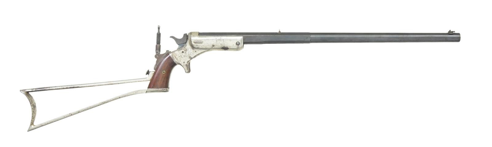 Cal. 32 Long RF. S# 4510. Bbl. 20" 1/2 rnd. / 1/2 oct. w/ Beach combination front sight & fixed V notch at rear plus Lyman No. 1 tang sight on backstrap. Mfg. 1884-1900; approx. 1,200 units. Later version w/ improved curvature in front of trigger, iron frame, bushed firing pin & redesigned hammer. Nickel plated frame, butt & skeleton shoulder stock. Left side of frame under grip numbered "4510" plus "5". Frame, butt, bbl., bbl. latch, tang sight & stock matching numbered. Frame at 1 1/4 " width, heavy barrel & beefier stock all more robust than Pocket Rifle it's modeled after. CONDITION: fair to good overall appearance w/ minor light marks on bluing & noticeable spotty oxidation on nickeled components along w/ some bubbling of finish. Very good grips w/ minor handling marks. Very good bright bore w/ very slight wear. Spring detent broken on front sight. (22-6245/NW). CURIO. $800-1,200.