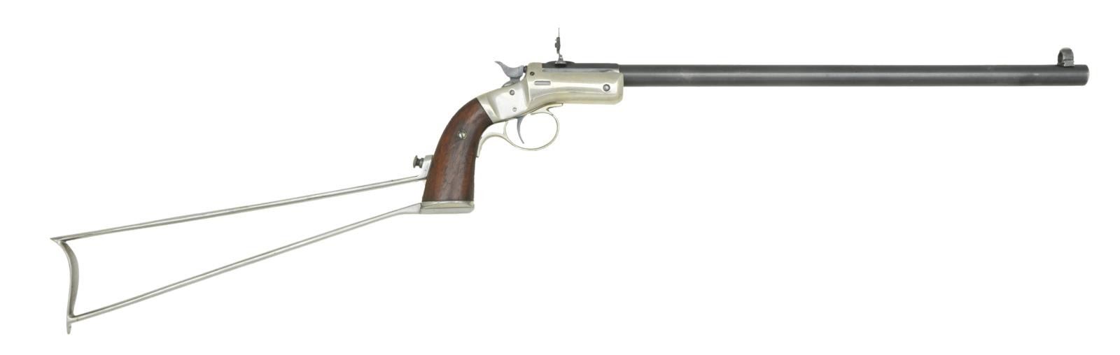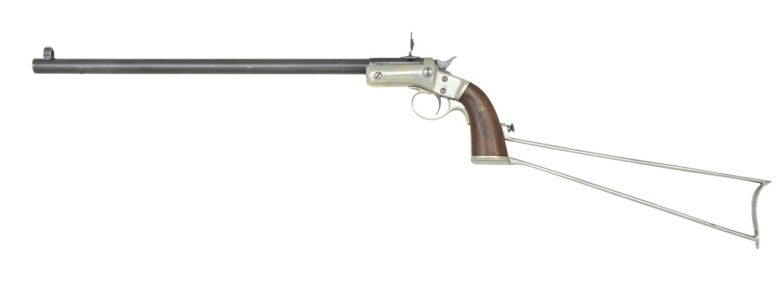 Cal. 22 LR. S# 34709. Bbl. 15" matching numbered part rnd., part oct. w/ combination front sight; folding peep sight at rear. Mfg. 1896-1916 (approx. 15,000 units) w/ firing pin in frame w/out bushing. Improved features from prior models to include standard trigger w/ smooth face in guard, longer grip (matching numbered on left side under grip along w/ "12"; plus on butt cap) & no side plate. Matching bbl. latch & pencil numbered grips. Uncommon all blued finish except nickeled matching numbered iron skeletonized stock. CONDITION: very good to excellent overall appearance w/ very slight thinning on trigger guard. Good nickel plating on stock having some peppery oxidation mainly on top rail; slight blistering of finish on balance. Very good snug fitting of stock. Very good right grip & near excellent left. Near excellent bright bore. (22-5769/NW). CURIO. $1,000-1,500.