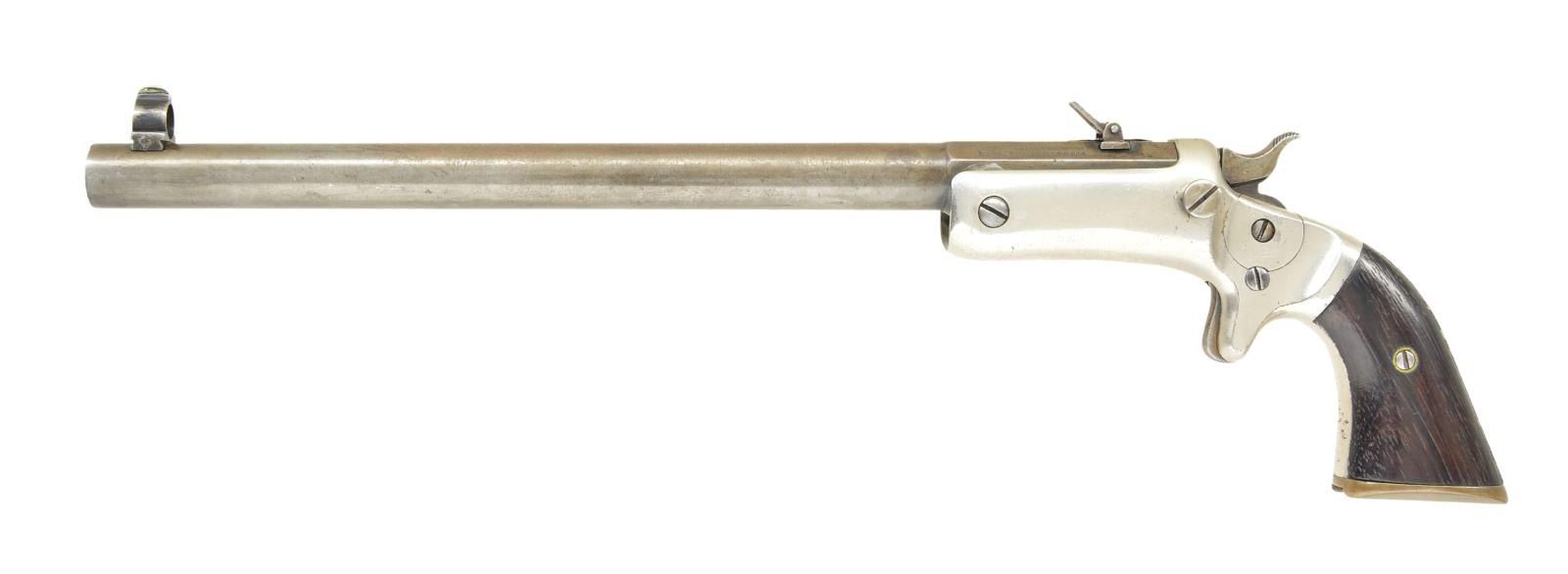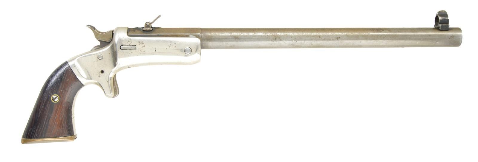 Cal. 32 RF. S# 10112. Bbl. 10" matching numbered part oct., part rnd. Mfg. 1875-1896; 15,000 units. Second issue w/ firing pin in frame. Nickel plated iron frame w/ early production sideplate & matching numbered brass base at butt for shoulder stock (also attaches to mid point of backstrap). Combination front sight & sliding peep for rear (missing aperture section). Matching pencil numbered rosewood grips. CONDITION: good appearance w/ intact plating on iron frame but missing on brass base. Very good grips w/ light marks. Patina appearance to bbl. Fair worn & pitted bore. Both hammer notches release too easily. (01-23118/NW). ANTIQUE. $200-400.