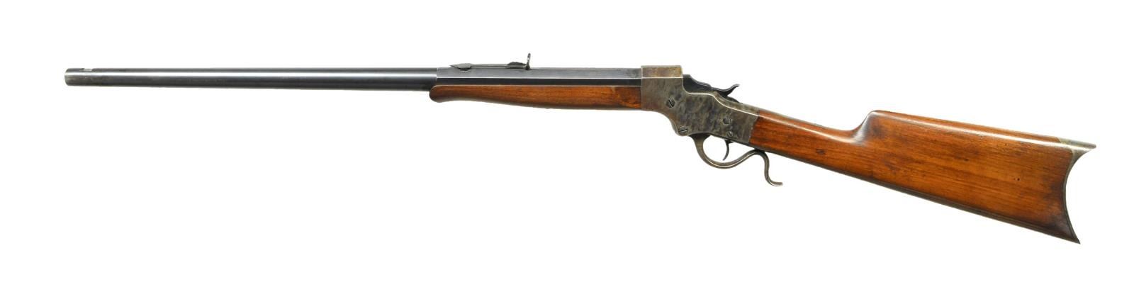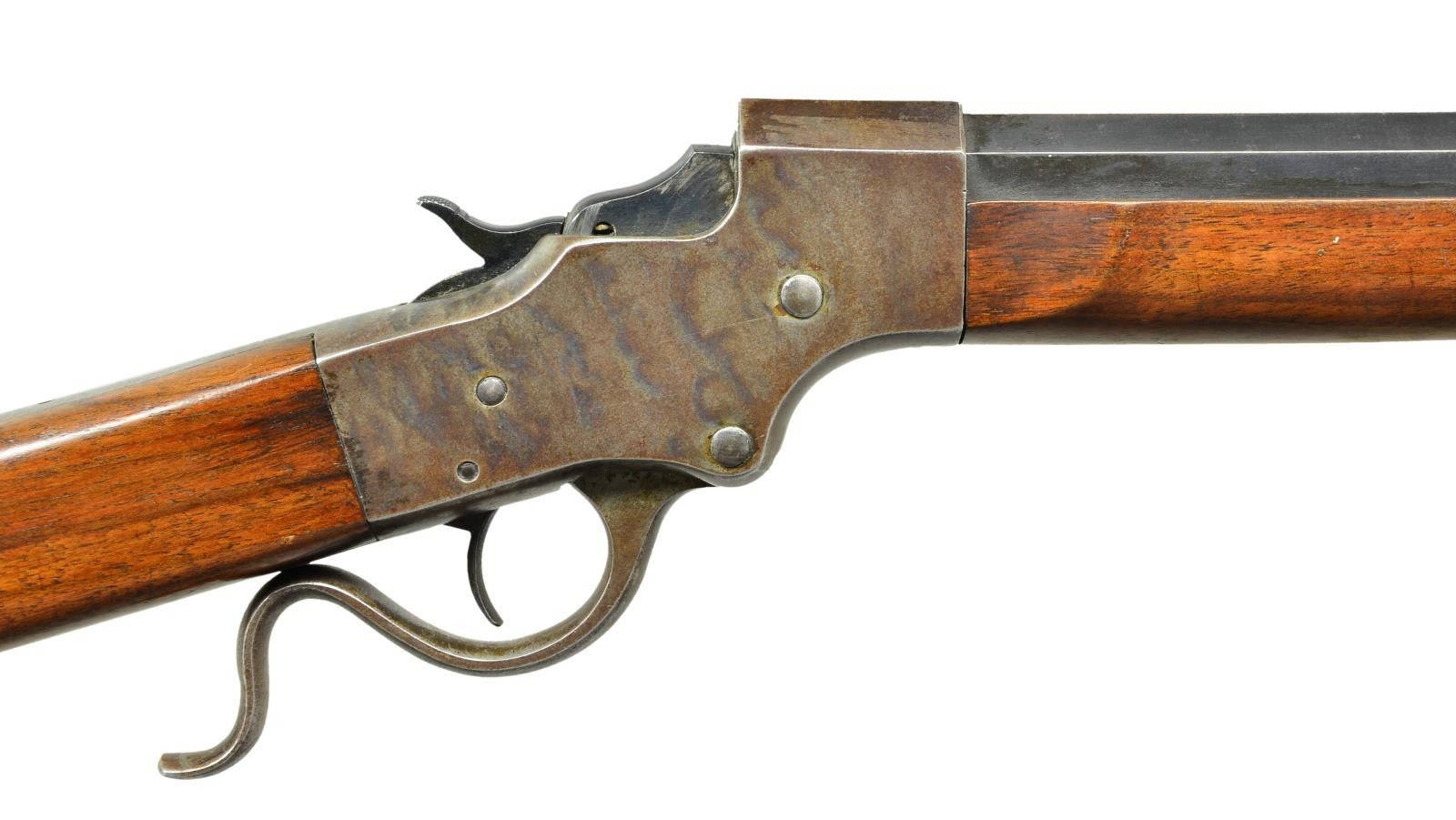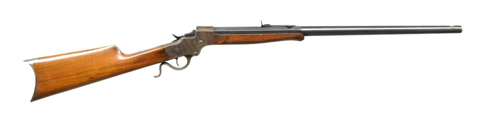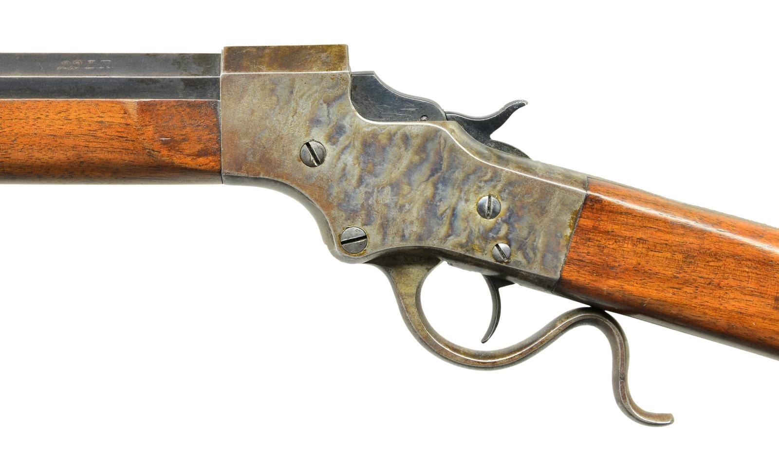 Cal. 22 LR. S# 11604. Matching numbered 23 3/4" bbl. w/ rnd. to oct. configuration. Dovetail for front sight & elevator rear sight. Case hardened action. Schnabel tipped forearm & straight grip stock w/ crescent buttplate. CONDITION: good bbl. blending starting to blend w/ brown patina; heavily around muzzle. Some sections of bbl. show light corrosion along w/ light patina & pinprick oxidation throughout. Action has fair case colored most vivid on left side of action blending w/ brown patina showing light corrosion on top, areas of prior pitting & peppery oxidation. Breech block shows very good blue w/ function wear & peppery oxidation. Wood has good varnish showing light impressions throughout. Buttplate shows faded colors w/ brown patina & peppery oxidation. Good lightly worn bore w/ light pitting. (23-991/MD). CURIO. $600-800.