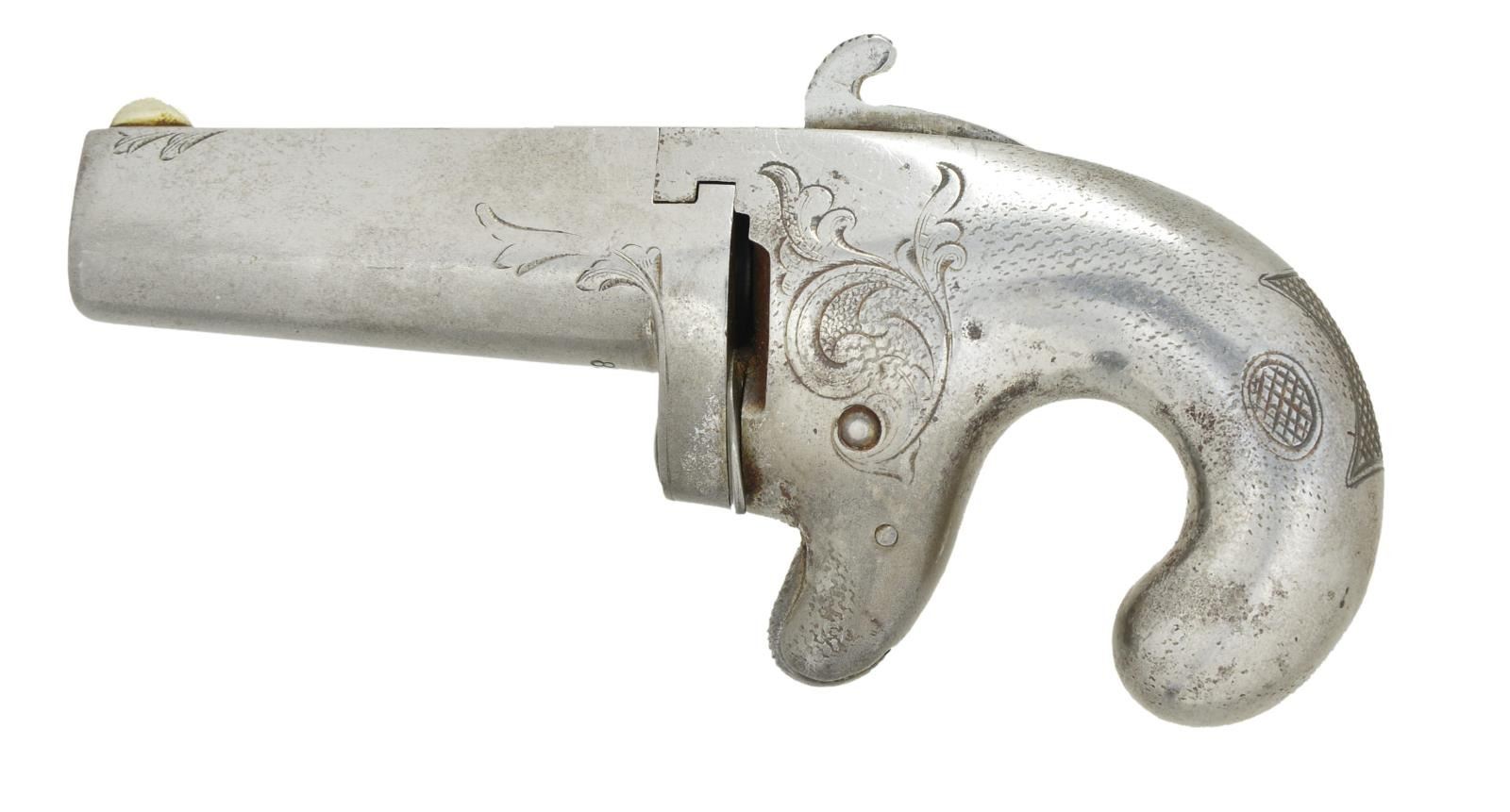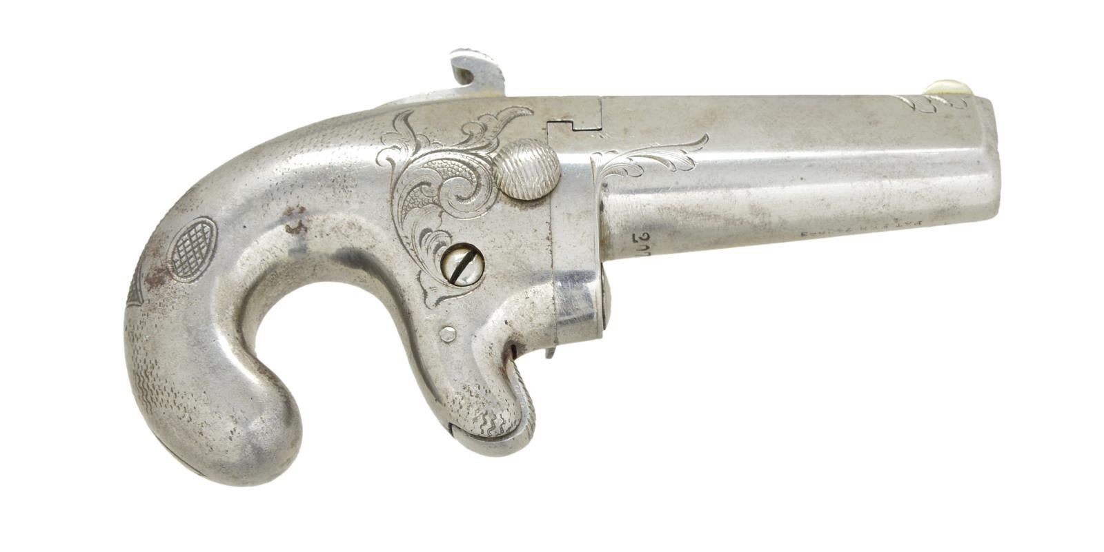 Cal. 41 Short RF. S# 2078. Bbl. 2 1/2" w/ tear drop shape at muzzle & brass blade sight. Mfg. 1865-1870 as continuation of Moore's Patent Firearms Co. No. 1 mfg. 1860-1865; Model No. 1 & First used interchangeably. Moore's created first big bore derringer that was continued by National who sold rights to Colt in 1870. Colt continued it (w/ improvements) as First Model having hired prior National employees until discontinuing model in 1890. Approx. 6,000 mfg. being equally split between Moore's & National. Scarcer plated iron (common in brass) construction throughout w/ light scroll engraving plus checkering in grip area serving mainly as decoration. Breech face marked "T78" & rear of bbl. marked "T"; National markings on flat topped rib. Pivot point of bbl. has "knife edge" extractor. Groove in top of hammer spur serving as rear sight if one were to actually aim. CONDITION: especially fine appearing example w/ light handling marks throughout & areas on frame of mild porosity as if not fully polished. Tight action & generally good bore w/ sharp rifling plus very light pitting in grooves. (01-22338/NW). ANTIQUE. $1,250-1,750.